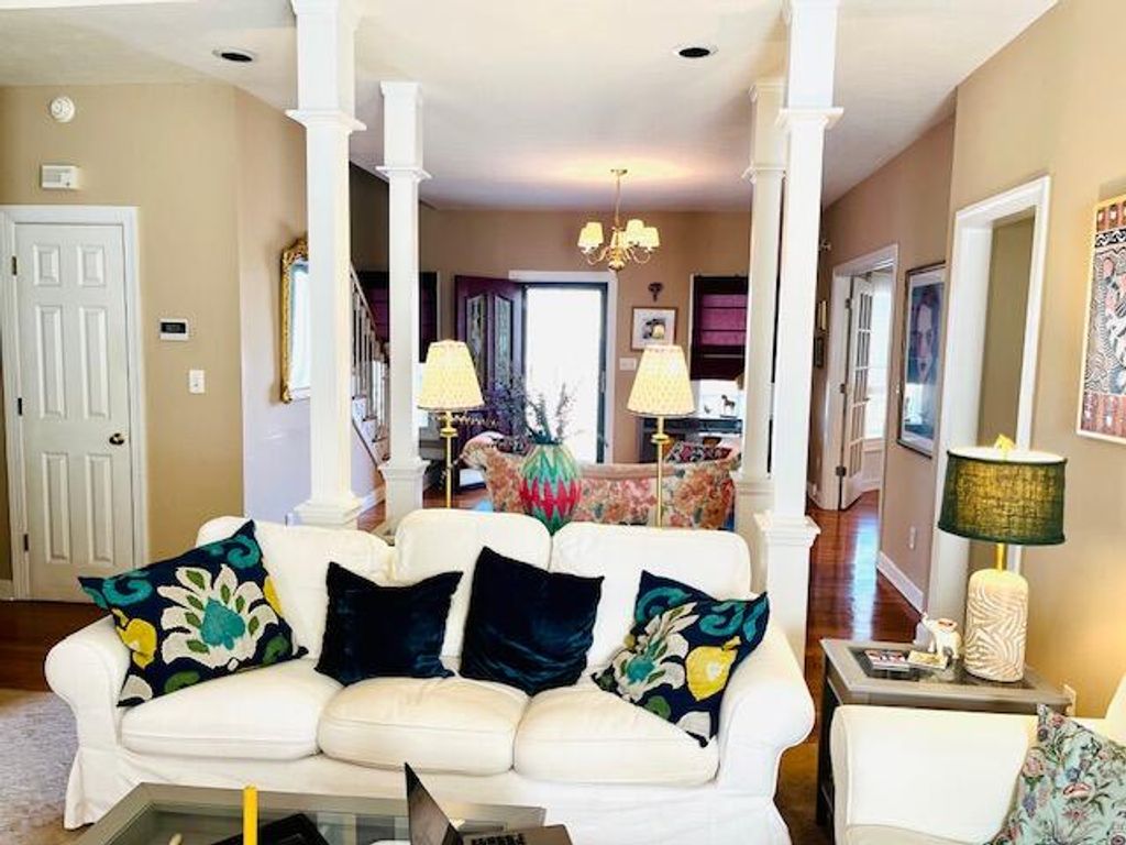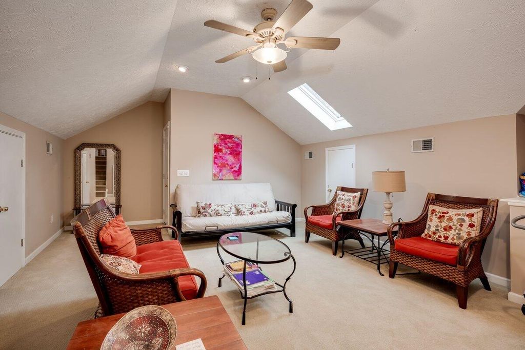 This classic Victorian style home is ready for it's new owners. The wrap around front porch with gazebo is the perfect place to enjoy the view of Houndslake golf course and the pond. Enter the large foyer that opens through french doors to the well proportioned dining room with bay window, or continue into the great room with brick fireplace and cathedral ceiling. Kitchen has granite counters, plenty of storage and a spacious breakfast area. All appliances convey! Down the hall you will find the powder room with pedestal sink plus a large laundry/mudroom with access to the two car garage with workbench. Also downstairs is the primary suite with walk in closet, large bath with double vanity,claw foot tub, separate shower and private water closet. Upstairs, you will find three additional bedrooms, one with a bay window overlooking the view, and a hall bath. The fourth bedroom connects to a bonus room which could be converted to a fifth bedroom.It has a skylight and separate stairs to the garage. These two areas combined could easily lend themselves to private quarters for multi-generational living. There is a large deck in the private, fenced back yard. Property extends far up the hill. Landscaping is easy to maintain with automatic sprinkler system. HOA is voluntary, Country Club membership is optional. Brand new air conditioning system for second level installed August 2024.