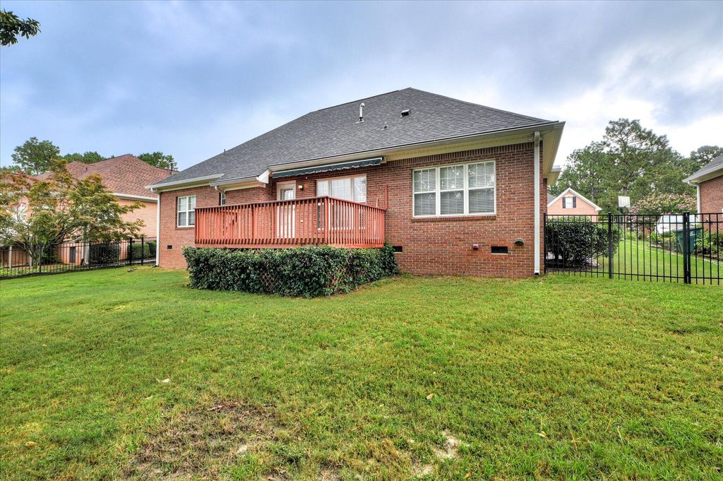 Warm and welcoming 3BR/2BA brick home with bonus room in desirable location close to all shopping needs. Located in the popular and sought-after Eagles Nest in Woodside Plantation. The house is well maintained with a new roof installed in 2024. Open, split floor plan ranch with bonus room. Home features eat-in kitchen with solid surface countertops and stainless appliances. Formal dining room, living room with attractive built-in cabinets, gas fireplace and high ceilings. Bonus room is perfect for office, workout or tv room. Spacious Master BR/BA with double vanities, updated walk-in closet, garden tub, separate shower and water closet. Lots of storage, including roomy 2 car courtyard entry garage. Manicured landscaping with irrigation. Enjoy privacy while relaxing on your outdoor 10' x 16' deck complete with electric powered awning. There are two clubs available with golf, tennis, swimming & dining that requires membership.
