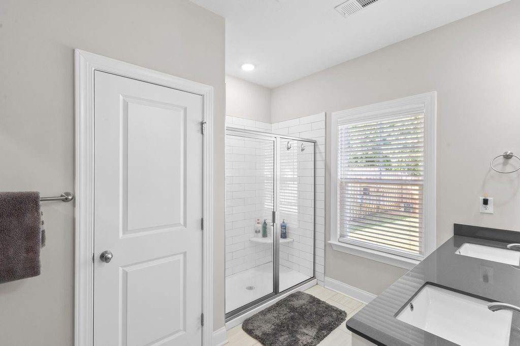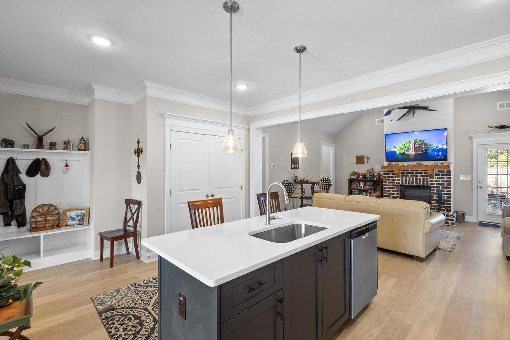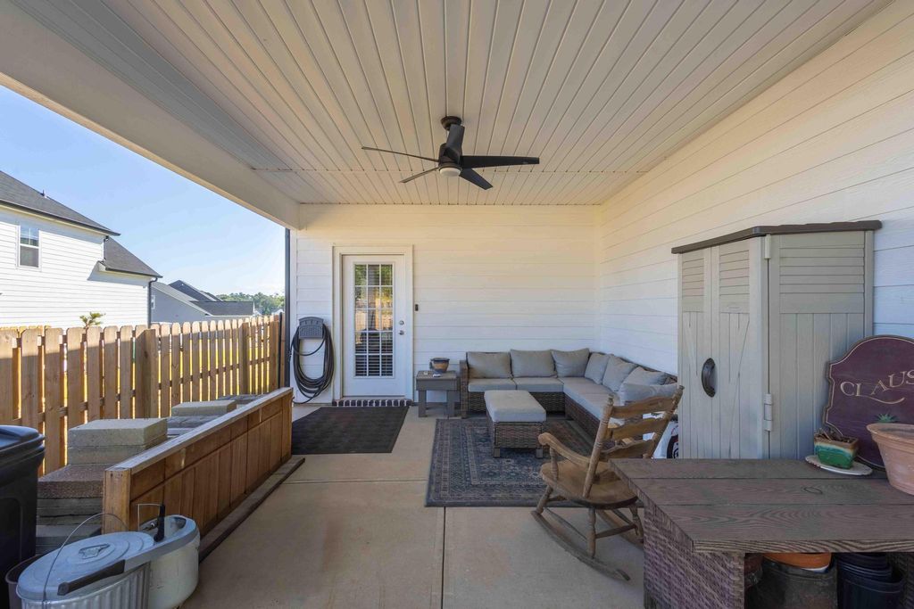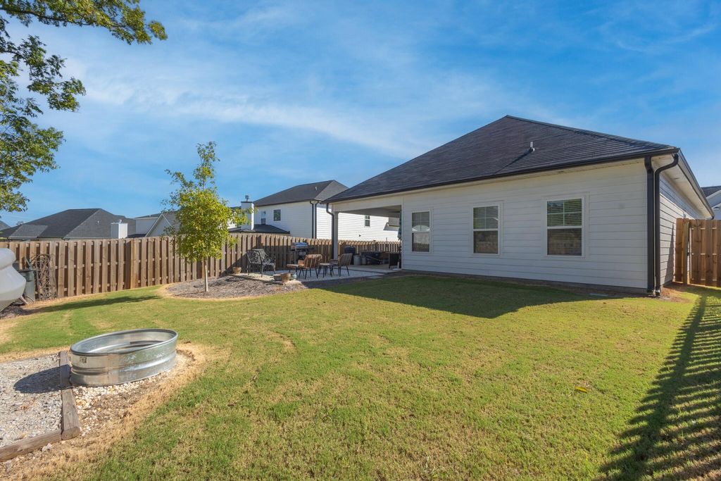 Welcome to this gorgeous one-story home offering 3 bedrooms and 2 full bathrooms, thoughtfully designed with an open floor plan that provides ample living space. A charming rocking chair front porch sets the tone, leading into a bright entry with a formal dining area. The great room features a vaulted ceiling and a cozy brick fireplace, seamlessly flowing into the kitchen. Here you'll find quartz countertops, a stylish tile backsplash, stainless steel appliances, and a center island perfect for gathering. The owner's suite is bright and spacious, highlighted by a statement wall and an en-suite bathroom with a double sink vanity, tiled walk-in shower, and walk-in closet. Additional bedrooms are well-sized and filled with natural light. Step outside to enjoy your spacious backyard with a covered patio and an extended patio, ideal for entertaining or relaxing complete with a buffer of common space between neighbors, adding privacy. The oversized garage provides plenty of space, even fitting a full-sized truck. Located in The Sanctuary, residents enjoy sidewalks, a large community garden, a neighborhood walking trail, and streetlights. All this, just minutes from Downtown Aiken, Bruce's Field, Hitchcock Woods, equestrian venues, shopping, and fine dining! Better than new with extended patio for grilling, accent wall in the primary bedroom, gutters and blinds!