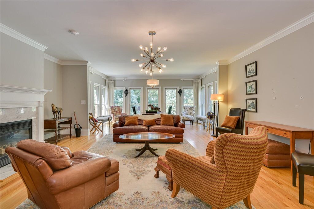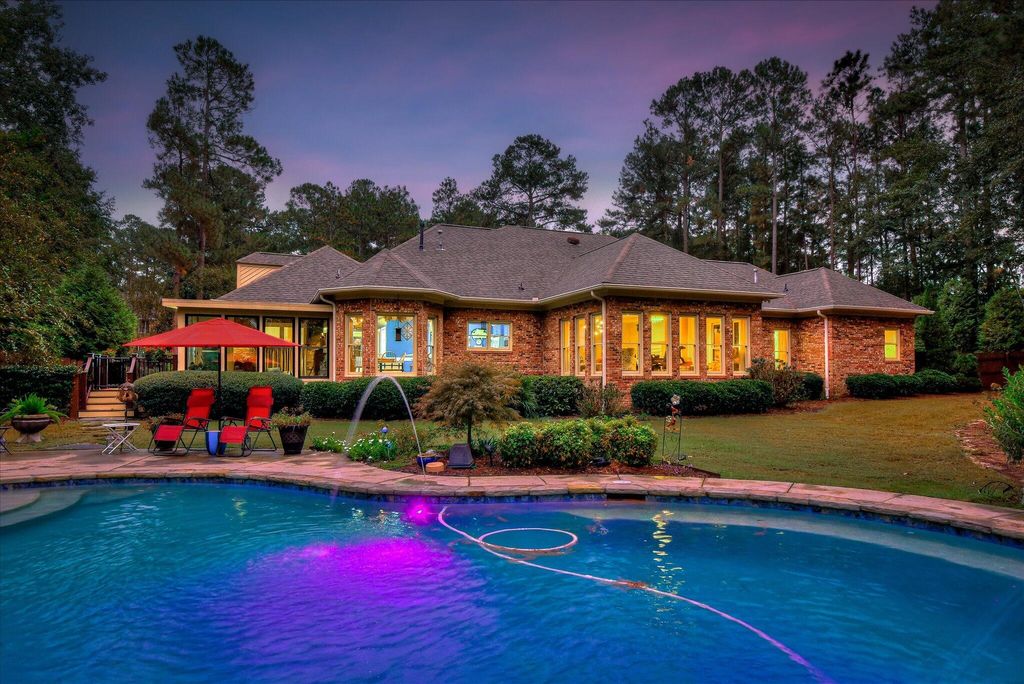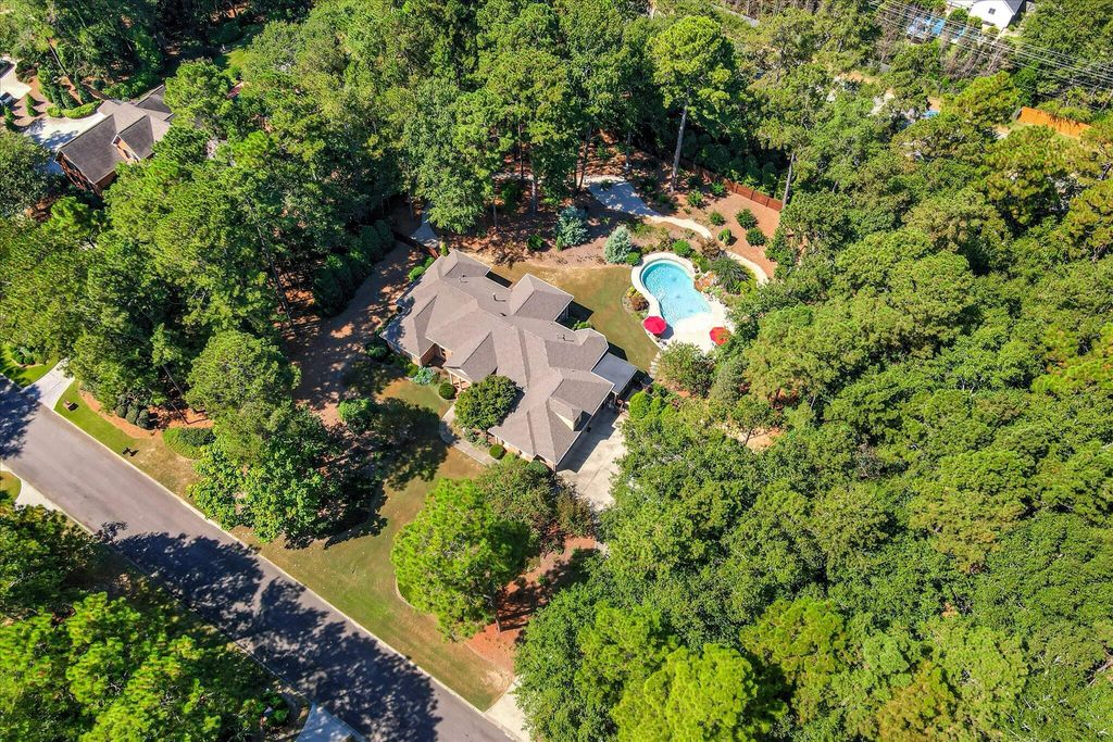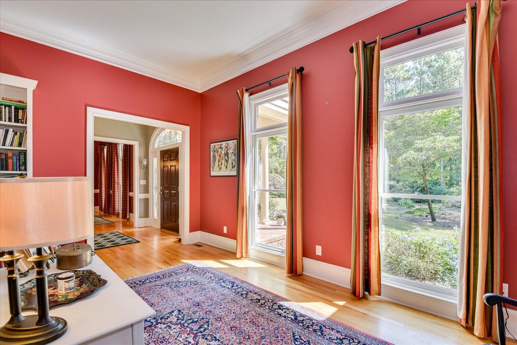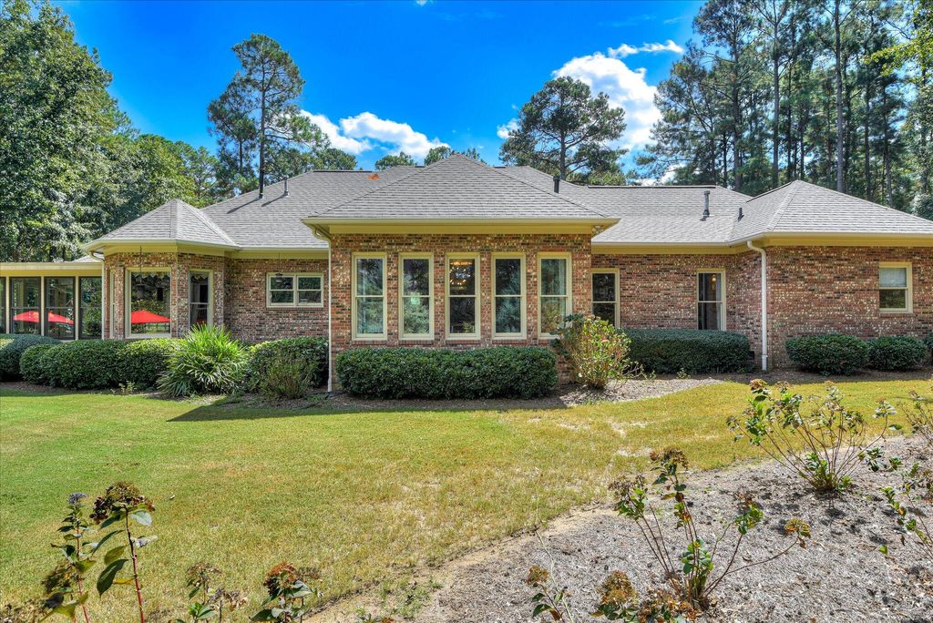 Sprawling & spacious Georgian-style ranch in Woodside Plantation's coveted Estate enclave, this 3-bedroom home is nestled in a park-like setting, surrounded by beautifully landscaped grounds and a stunning resort-like pool. A lofty entryway with custom coffered ceilings in the dining room and built-in bookshelves in the library/office. Bright and spacious living room with gas-log fireplace. Updated kitchen, new roof & HVAC system. Large storage/bonus room on second floor above the attached 2-car garage. Sunroom with heating & air. Custom fenced-in dog run area. Charming in every way.