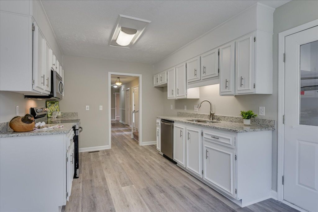 This beautifully updated four-bedroom, three-bathroom home in the Southwood subdivision boasts a established location near Aiken's southside shopping and dining, with convenient access to downtown Aiken and Augusta. This residence invites buyers to move in and start enjoying their new home. As you approach the property via a well-maintained concrete driveway leading to a two-bay side-entry garage, the freshly painted exterior board-and-batten siding captures your attention. The newly painted foundation and fresh landscaping further enhance the home's curb appeal as you come up the sidewalk to the front door. Upon entering the foyer, you will find a hallway to your right that leads to the main floor bedroom wing, which includes a primary ensuite with a walk-in closet and two guest bedrooms that share a hall bathroom. To the left, you can ascend to a bright bonus room or fourth bedroom ensuite, or proceed straight ahead into the heart of the home, where you are greeted by views of the backyard flanking a cozy fireplace. The vaulted ceiling extends to the front of the house, complemented by large rectangular transom windows that flood the living space with natural light. The area features new luxury vinyl plank flooring and freshly painted walls, including a stylishly painted fireplace adorned with a wood-stained mantle. A wide cased opening to the left leads to the dining room, which maintains an intimate atmosphere while allowing for an open flow, perfect for formal gatherings. The sunlit breakfast area, located adjacent to the kitchen, features a charming bay window and opens seamlessly into the kitchen. Access to the outdoors is made easy through the living room's back deck, ideal for enjoying al fresco dining. In the kitchen, you will appreciate the white cabinetry, updated hardware, stunning granite countertops, newer stainless steel appliances, and new luxury vinyl plank flooring. A back hallway provides access to the garage and includes a generously sized laundry room with upper cabinetry for added convenience. Set on 0.63 acres, this property offers ample space for pets to roam, gardening, and personal customization. Recent updates encompass but are not limited to: a freshly painted interior and exterior, new flooring throughout, updated fixtures, and modernized kitchen and bathrooms. Do not miss the opportunity to own this move-in ready home in a desirable, established neighborhood!