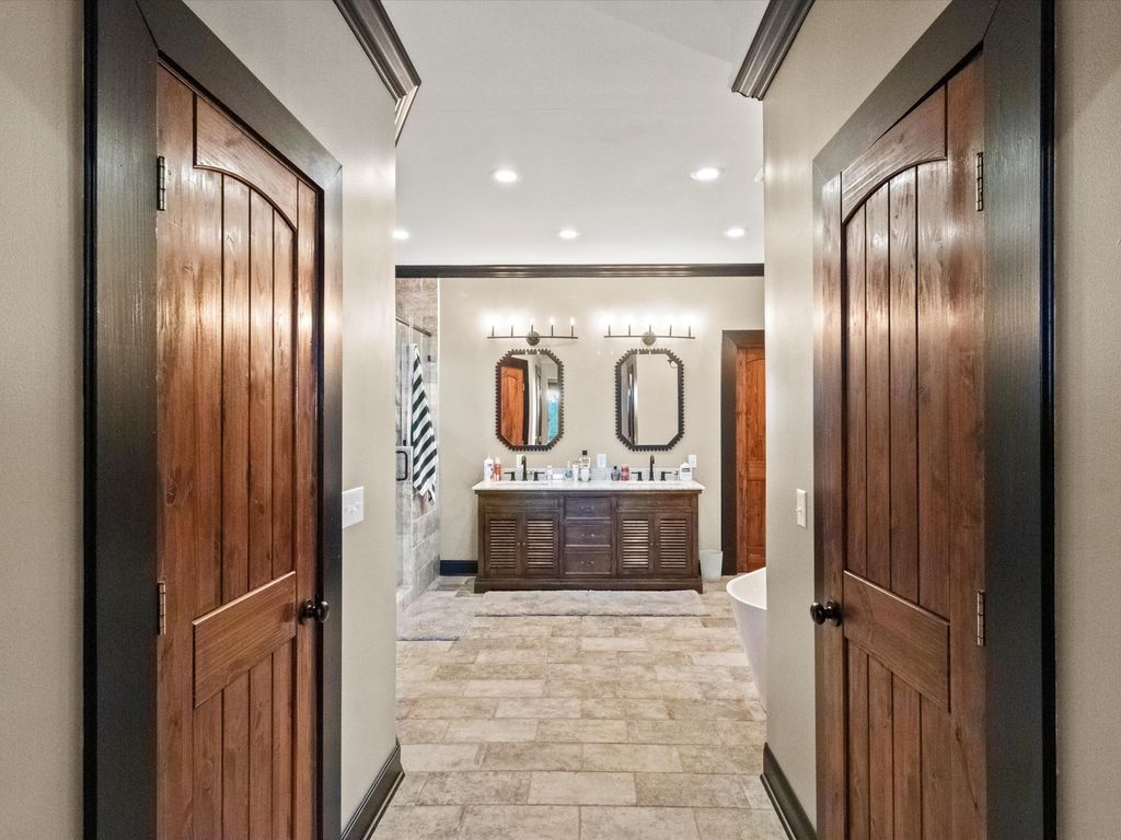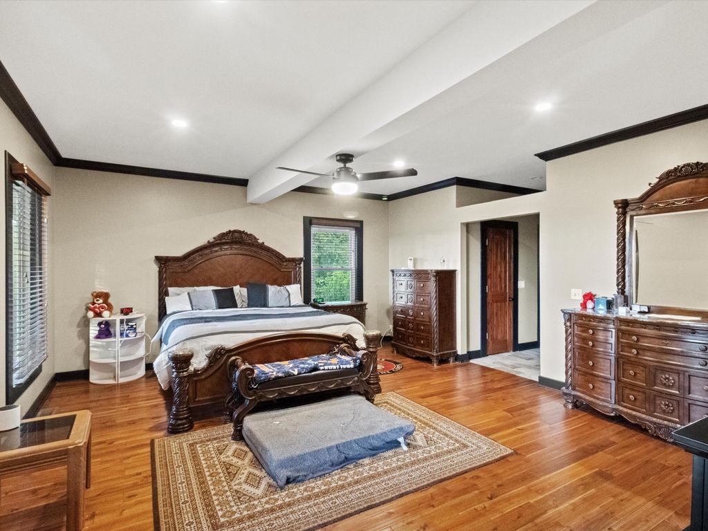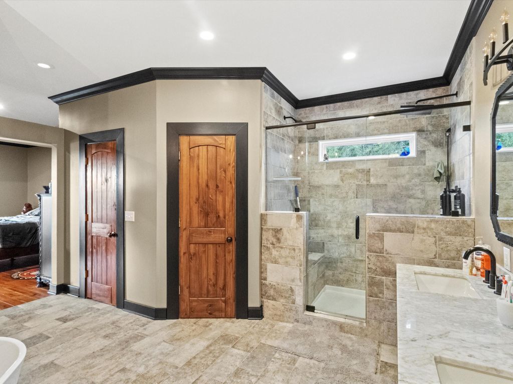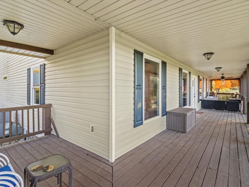 This custom-crafted residence harmoniously marries refined interior design with the tranquility of its natural surroundings. Rich hardwood flooring, exposed timber beams, and bespoke wood cabinetry lend warmth and character throughout the home. The main-level primary master suite has been thoughtfully updated to evoke a spa-like ambiance, featuring a luxurious tiled walk-in shower with multiple shower heads, dual vanities, and separate his-and-her closets. Functionality meets elegance in the spacious mudroom, conveniently located off the covered carport"”an ideal transition space for daily essentials such as groceries, footwear, and school bags. The upper level offers two generously sized bedrooms, a well-appointed shared bath, and a versatile extra area adjacent to the bathroom, perfect for a study alcove or climate-controlled storage. A walk-up attic, complete with flooring and built-in stairs, presents an opportunity for future expansion or additional living space. Outdoors, a charming three-quarter wraparound porch invites relaxation while offering sweeping views of the serene rolling countryside. The property also includes a two-car attached carport and professionally landscaped grounds.