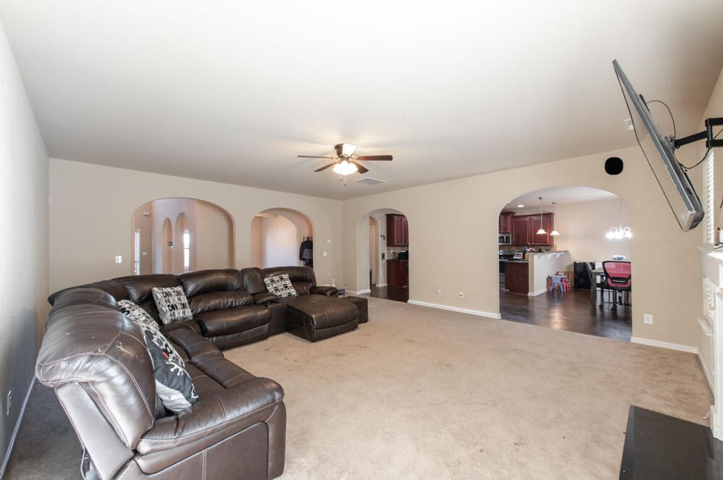 Nestled in a welcoming neighborhood with amenities just steps away, this 5 bed, 4-bath home with a two-car garage offers generous space and is designed for modern living! A bright two-story foyer with hardwood floors sets the tone as you move into the well-appointed kitchen, where hardwood floors, granite countertops, a tiled backsplash, an island, breakfast bar, built-in microwave, dishwasher, and a spacious pantry meet every culinary need! The adjacent breakfast area opens to a bright bay window, creating a cheerful spot for casual meals! The living room invites comfort with arched entryways, a gas fireplace, and a ceiling fan, while the dining room - also with a bay window and a coffered ceiling - offers a refined setting for entertaining! You'll also find a versatile flex space that's perfect for an office, a guest bedroom, and a full guest bath on the main level! Upstairs, a large loft provides flexible space for media, play, or work! The expansive owner's suite features a vaulted ceiling, ceiling fan, and a cozy sitting area with a gas fireplace, plus his-and-her walk-in closets! The ensuite bath is generous and luxurious, with two separate vanities, a soaking tub, a separate tiled shower, and a water closet! Three additional spare bedrooms and two full bathrooms can also be found upstairs! Outside, a large covered back patio overlooks a private backyard enclosed by a privacy fence, ideal for outdoor gatherings or quiet mornings! Residents enjoy neighborhood amenities that include a clubhouse, pool, and playground, enhancing the lifestyle this home offers!