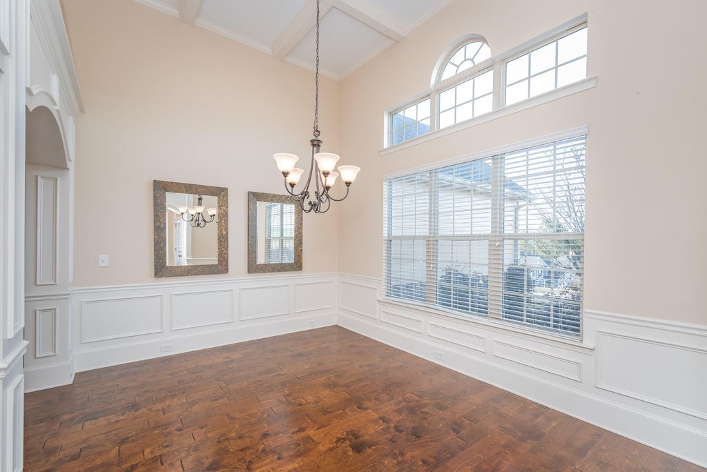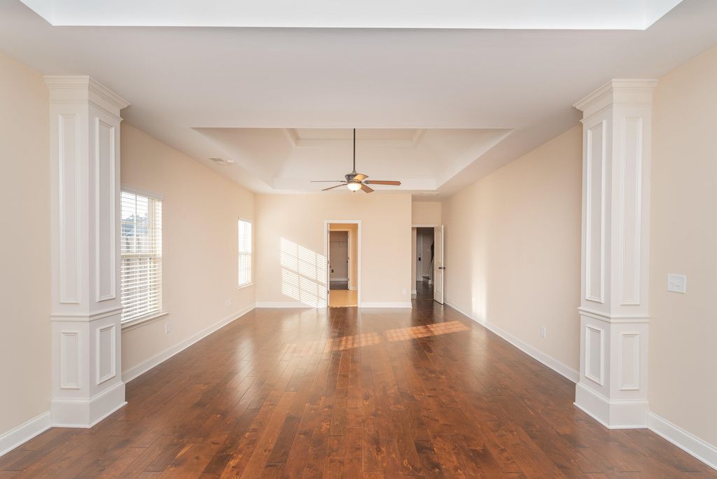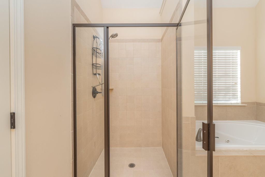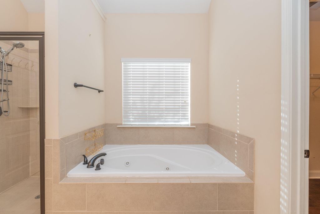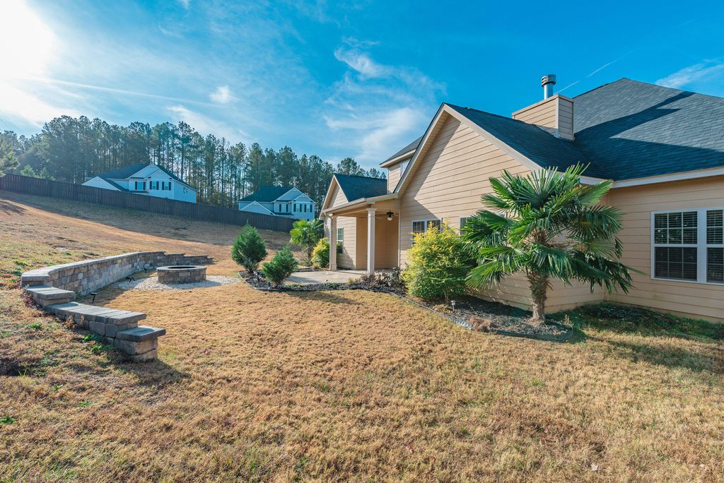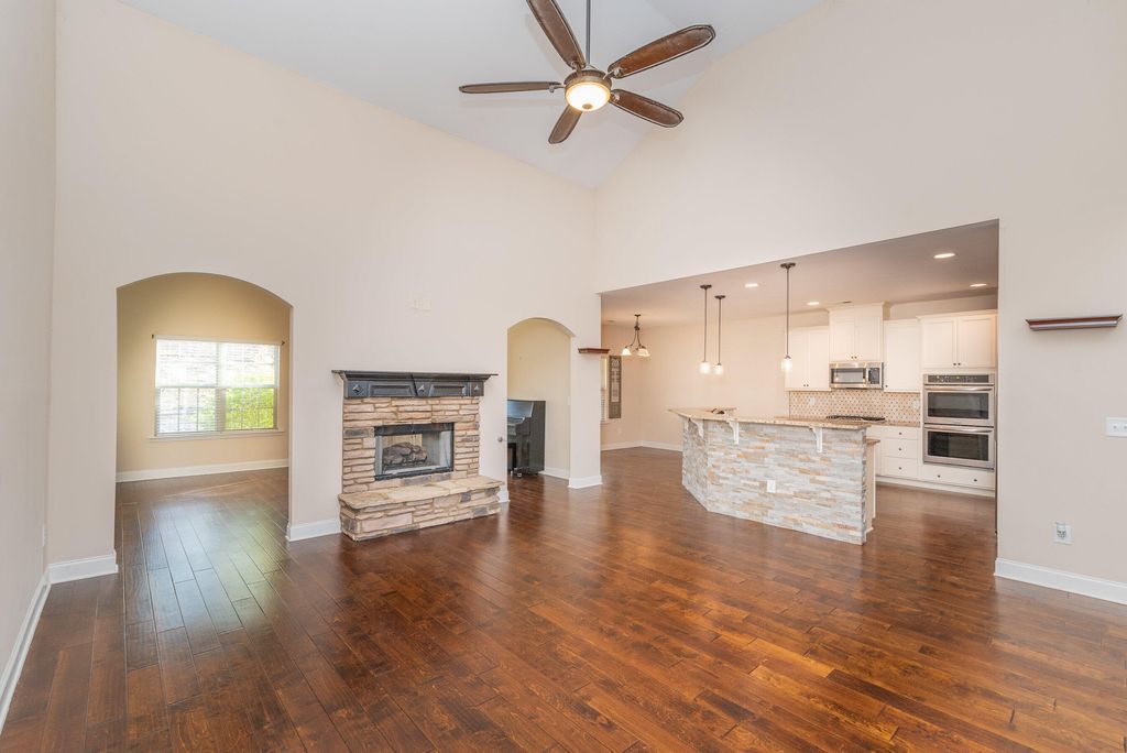 This beautifully appointed property showcases rich architectural character throughout. At the heart of the home is the grand dining room, where Hitchcock ceilings, oversized windows, and classic wainscoting create a refined atmosphere. The space is gracefully defined by arched openings and stately columns, offering architectural separation while maintaining an open, connected flow to the adjoining living areas. The kitchen is a standout, featuring granite countertops, wood cabinetry, a serving bar, and stainless-steel appliances, including a double oven, gas cooktop, and refrigerator. The owner's suite offers a spacious bedroom with an additional sitting area, striking tray ceilings, and a large walk-in closet. The owner's bath is designed for relaxation, featuring a separate tiled shower, double-bowl vanity, and a soothing jetted tub. The additional bedrooms feature soaring ceilings and share a well-appointed full bath within the split floor plan. The back hallway from side-entry two car garage as laundry room with sink and leads to an attractive staircase that brings you to the fourth bedroom/bonus, complete with its own private bath and closet, ideal for guests, teens, or multi-generational living. Outdoor living complete with covered patio, a built in fire pit and nighttime up lighting. This tremendous fully fenced .59-acre lot ready for entertaining or gardening with custom storage building. Additional highlights include generous parking and a neighborhood filled with desirable amenities such as a community pool, walking trails, and convenient access to numerous Southside shopping and dining options