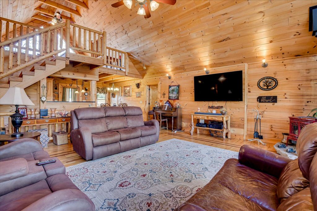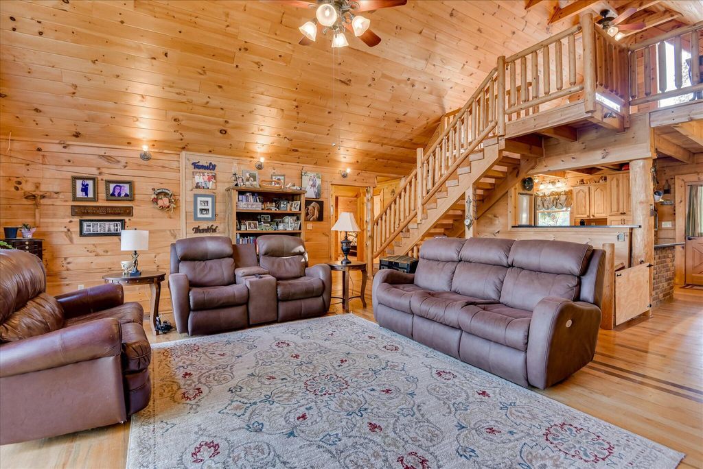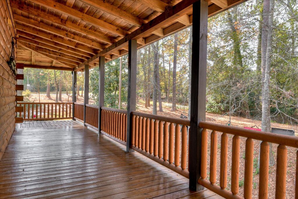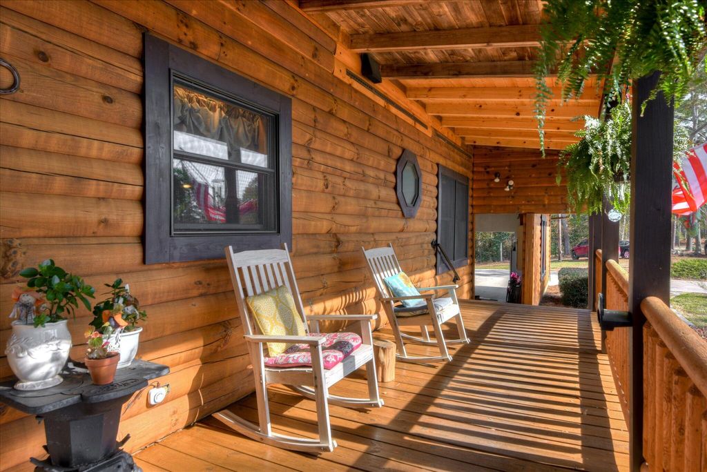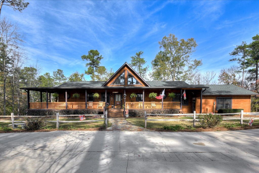 Experience the timeless beauty and craftsmanship of this exceptional custom log home, offering over 3700 square feet of finished living space with approx. 450 sq ft of partially finished storage space/ flex space. Nestled on two private, wooded acres with beautiful stone walkways, this residence welcomes you with a grand wraparound porch, and two-tiered decking perfect for outdoor entertaining, with a spacious detached workshop. Ideally located in North Augusta, just minutes from both Aiken and Augusta, this property combines rustic charm with modern convenience. Constructed from solid white pine logs, the home features impressive property-sourced wood beams and locally reclaimed brick tiles in the kitchen, creating a unique blend of natural textures. The gourmet country kitchen showcases custom hickory cabinetry, sleek black granite countertops, and enduring quality. Throughout the home, you'll find beautiful white pine floors and tongue-and-groove ceilings. The expansive, vaulted living room is flooded with natural light from picture windows and centers around a stately Leyden cast iron wood-burning stove set on a dramatic stone hearth. The thoughtfully designed split-bedroom floor plan features a spacious primary suite with a comfortable en suite bathroom, complete with tiled flooring and shower. On the opposite wing, two inviting guest bedrooms and a well-appointed guest bath provide comfort and privacy for family or visitors. An upper-level loft offers more picture windows for a versatile retreat, ideal for a home office, reading nook, or play area. A striking cedar tree cut on site, accentuates the staircase leading to the finished walk-out basement, where you'll discover two additional guest bedrooms, an expansive den with a convenient kitchenette, and a combined bathroom and laundry area. Two generous storage rooms provide ample space for hobbies, currently used as a music studio and workshop. Additional highlights include a brand new roof (2025), a dedicated utility closet for easy access to home systems, a comprehensive whole-home water filtration system, and an oversized 84-gallon water heater for enhanced comfort and efficiency. Outside enjoy a large detached workshop/ garage perfect for the car hobbyist or craftsman or additional storage for recreational vehicles.