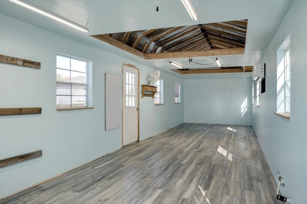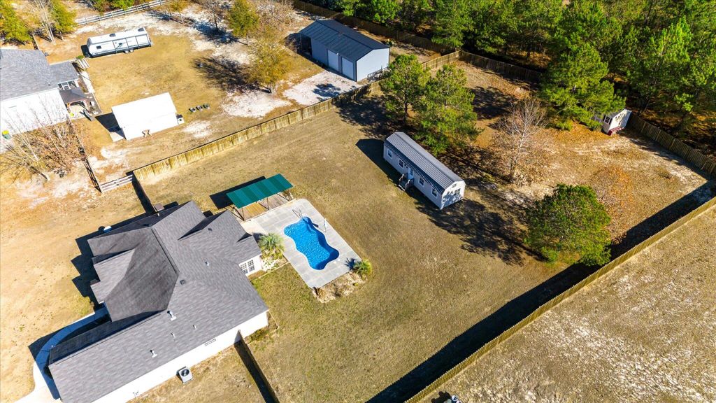 Situated on a spacious one-acre lot, this ranch style home offers a combination of indoor comfort and outdoor amenities. The home features four bedrooms, two full bathrooms, and a convenient powder room, along with new laminate wood panel flooring throughout. Large windows allow eat-in kitchen and living room to be flooded with natural light and overlooks the huge backyard. Step outside to your private backyard retreat with a chlorinated swimming pool, complemented by a large cabana. Recent pool improvements include a pump motor replaced in 2023 and a filter replaced in 2025. An irrigation system services both the front and back yards, supporting easy landscape maintenance. Additional highlights include a heated and air-conditioned workshop/studio providing flexible space for hobbies, creative use, or work-from-home needs. The washer and dryer convey.