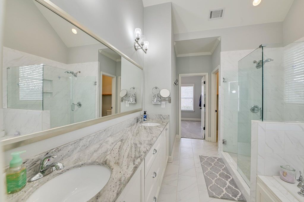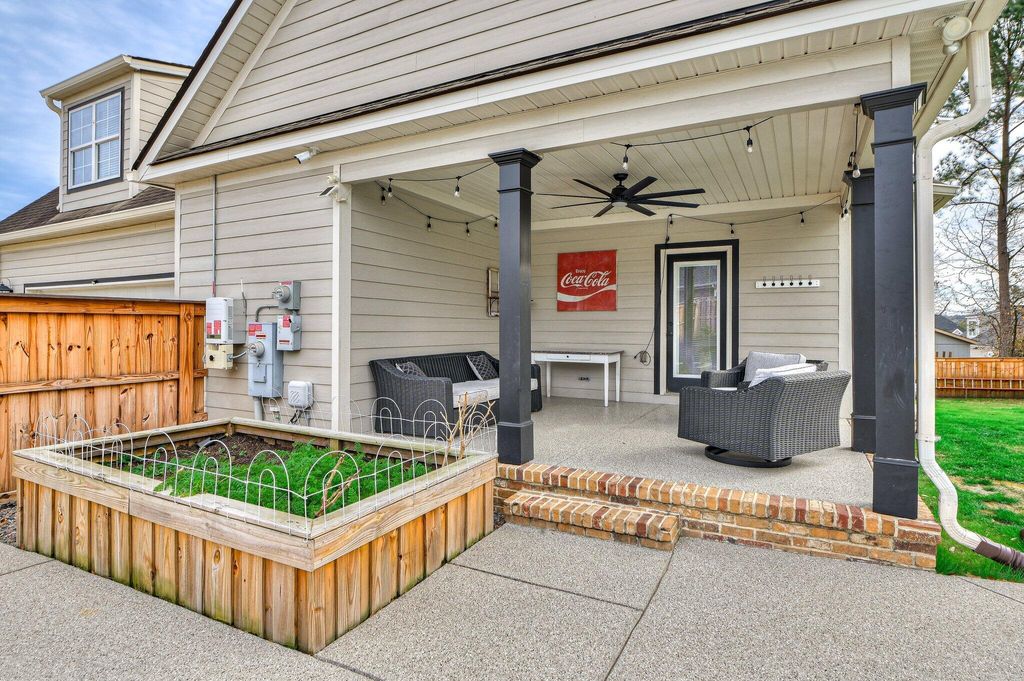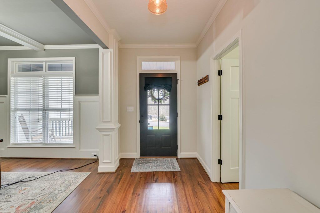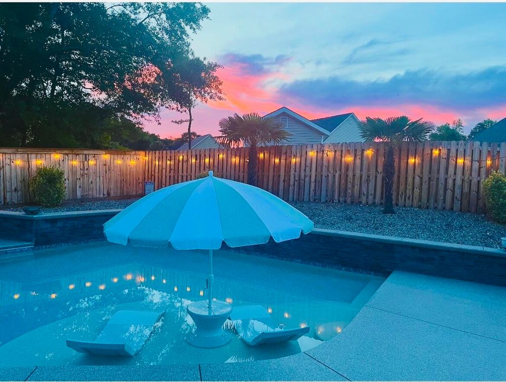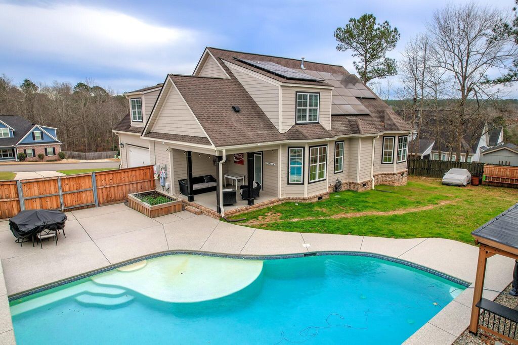 This beautifully designed farmhouse with modern touches is tucked away on a quiet street in North Augusta's desirable Lakes & Streams subdivision. The inviting exterior with black shutters, brick foundation, covered front porch, and rooftop solar panels delivers curb appeal that's both stylish and functional. Inside, the home features detailed millwork, rich hardwood floors, recessed lighting, and many newly installed light fixtures and ceiling fans, creating a fresh and inviting atmosphere. A versatile formal dining room also functions well as a home office. The hallway opens into a bright, open-concept living space with soaring two-story ceilings, a cozy brick fireplace, and an eat-in kitchen showcasing hammered granite countertops, a bar-seating island, stainless steel appliances, a breakfast area, and a pantry. All kitchen appliances will remain. The main level includes a laundry room, a full bath, and a spacious owner's suite with a light-filled tiled bathroom offering double vanities, a large walk-in shower, a jetted tub, and an oversized walk-in closet. Upstairs, you'll find three additional bedrooms and a full bath. Recent improvements add both value and peace of mind, including new gutters, a new garbage disposal, a pumped septic tank, new carpet in the primary bedroom, and a seamless shower in the primary bath. Additional upgrades include updated door hardware throughout, a fully encapsulated crawlspace with dehumidifier, a recently serviced HVAC system, a Ring doorbell that will convey, and a Lorex camera system with full-color night vision that will remain. Outdoor living is just as impressive! Relax under the covered back porch overlooking a custom saltwater, gunite pool featuring a stone waterfall, additional water features, a baja shelf, professional grade ledge chairs with table that will convey (set was $5000)and a grilling gazebo was recently added near the pool. Also, the patio/pool area was upgraded with new coping ($12,000 upgrade). Automatic vacuum for pool will also remain. The fully fenced, beautifully landscaped backyard includes established garden beds that will remain, offering both charm and functionality for outdoor enjoyment. There are also many fruit trees and blueberry bushes planted throughout the property. The garage is exceptionally well equipped with a polyurea floor/kneewall coating, soft close custom cabinets/drawers, hammer top work tops, commercial grade slat wall (ceiling to floor), slat board over lighted work bench, insulated garage door and an outlet for 240v heater/welder (professionally installed/designed at a cost of $23,000). Beyond the home, Lakes & Streams offers an active, community-oriented lifestyle with regular food trucks, festive golf cart parades, scenic walking trails, and neighborhood ponds perfect for fishing"”making this a place where neighbors truly connect. Qualifies for 100% USDA Financing! **Buyer/buyer's agent to verify all information if important.
