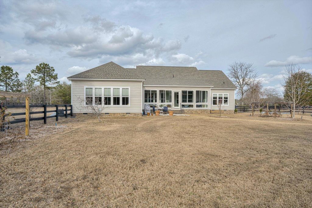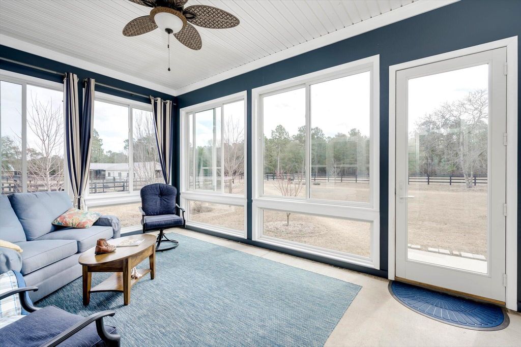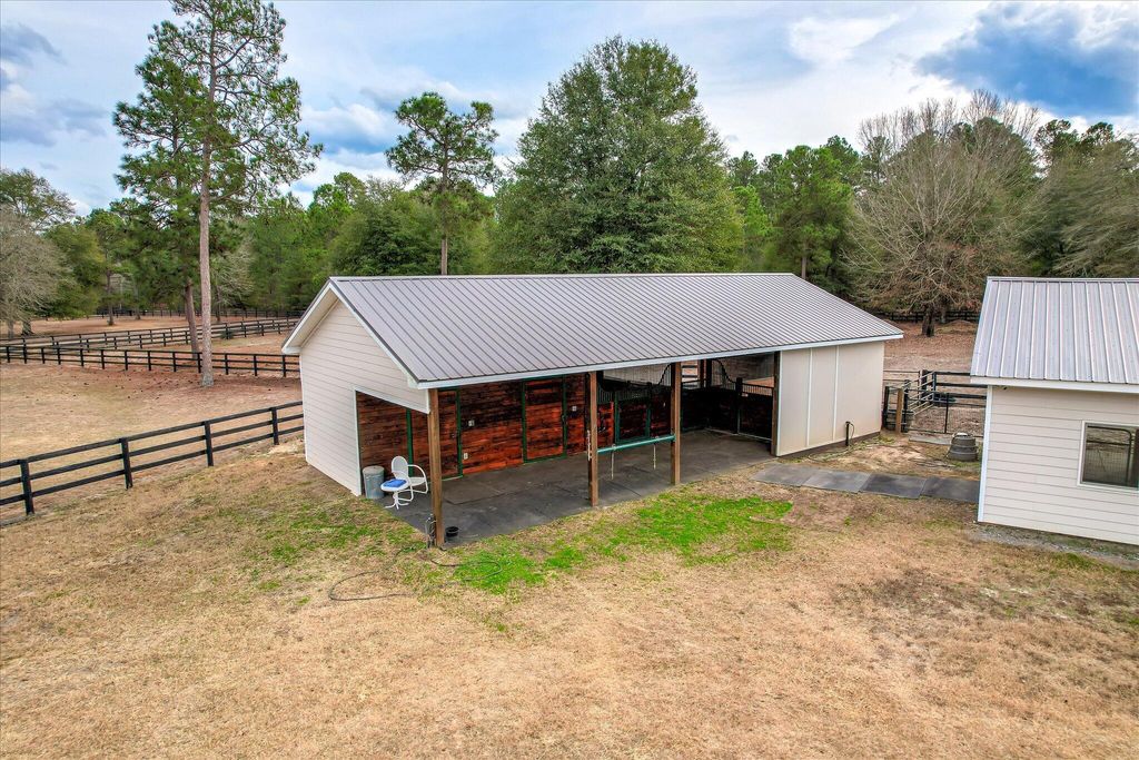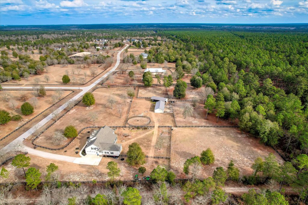 At 9673 Bayboro Circle, you'll have the best of both worlds - the top-notch amenities that Three Runs Plantation has to offer are at your fingertips, and yet you can enjoy the privacy that 6 acres, with wide open pastures on either side can provide. The home keeps you connected with your surroundings with gracious, window-filled rooms that bring the outside in! The single-story home has a semi-open floor plan with the kitchen and great room at the heart of the home, an office with French doors and a closet, and an ample and inviting sun porch with Anderson windows that extends the living space even further. The kitchen offers KitchenAid appliances including a gas cooktop, custom cabinets, granite counters and plenty of space! Beautiful heart pine floors run throughout the living spaces and the owners' suite on one side of the home, while two bedrooms and a shared bath are on the other, allowing for privacy. The 4th bedroom is above the garage and has its own bath and closet, making a wonderful guest suite or 2nd owners' suite. You'll appreciate the huge laundry/transition room that connects directly to the owners' closet and bath, making cleaning up after feeding time a cinch! Two barns with a total of 5 stalls (all with direct turnout) allow for incredible adaptability, whether you have one barn for guests or boarders, or like to give your animals their own space! The first barn has 3 stalls (2 12x12 and one 12x16), a feed room and hay room. The second barn has 2 matted stalls (12x12 and 12x16), a climate-controlled tack room with full bath, kitchenette and lounge, as well as a 12x26 workshop with reinforced concrete suitable for an automotive lift. Use it as a workshop/farm equipment storage, or it could potentially be adapted into additional living space, making the tack room/lounge into a separate apartment! There are a total of 5 pastures, a round pen and an area near the barns that has been used as an arena. Ride directly out the back gate to over 30 miles of trails, just a warm-up hack to the southside schooling area. Three Runs Plantation is a premier equestrian community welcoming all disciplines, with two schooling areas with mirrored dressage and separate jumping arenas, a cross-country schooling area, open green spaces and trails as well as a pool, picnic pavilion, 2 clubhouses and fitness room. Natural gas and fiber optic internet are available.