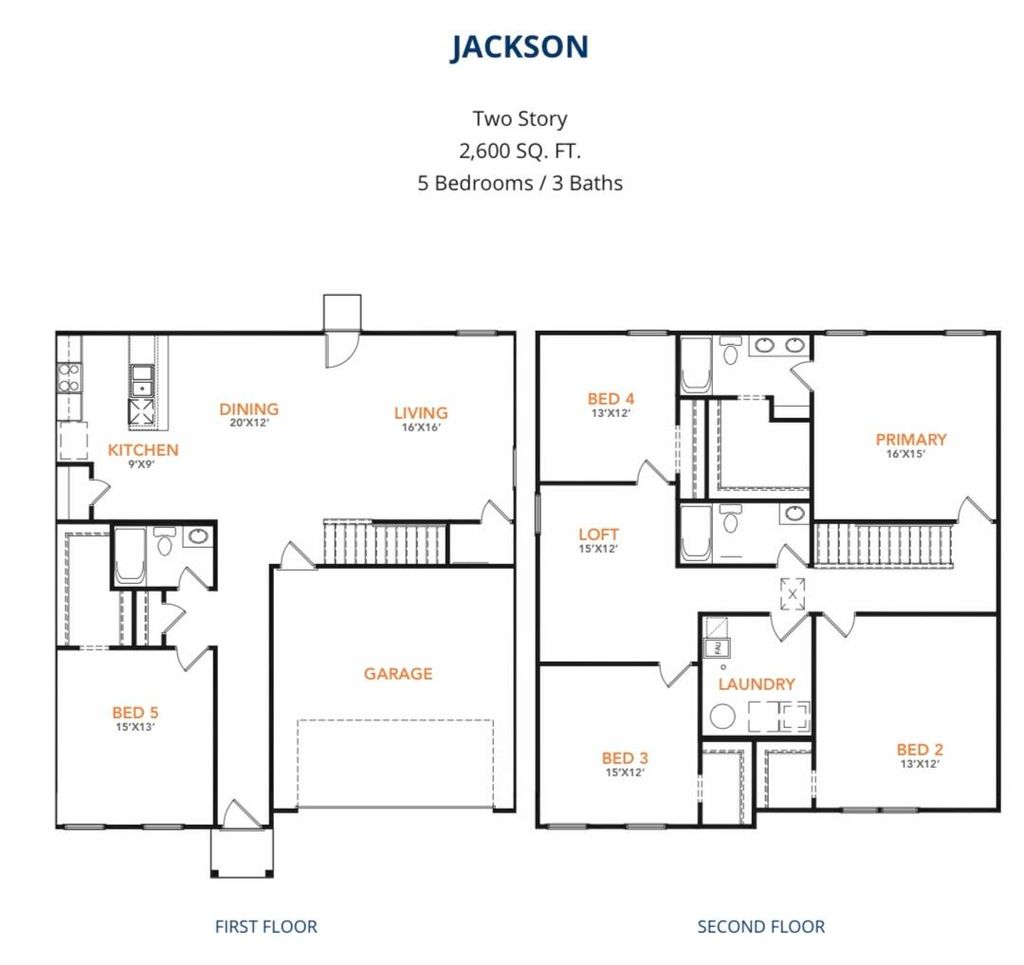 The Jackson Plan from our Liberty Series is where style meets functionality, offering a spacious design perfect for growing households. This 2-story home features 5 bedrooms, 3 bathrooms, a 2-car garage, and 2,600 square feet of thoughtfully crafted living space. As you enter, you'll find a main-level bedroom with a walk-in closet and a full bathroom "” ideal for guests. Continue down the hall to the dining area, which sits perfectly between the well-appointed kitchen and the inviting family room, creating an ideal space for gathering and entertaining. Upstairs, the primary suite is your private retreat, complete with a walk-in closet and an en suite bathroom. The upper level also features a loft area for added living or workspace, three additional bedrooms, a full bathroom, and a conveniently located laundry room. Photos are for illustrative purposes only and may be of a similar house with the same floor plan.