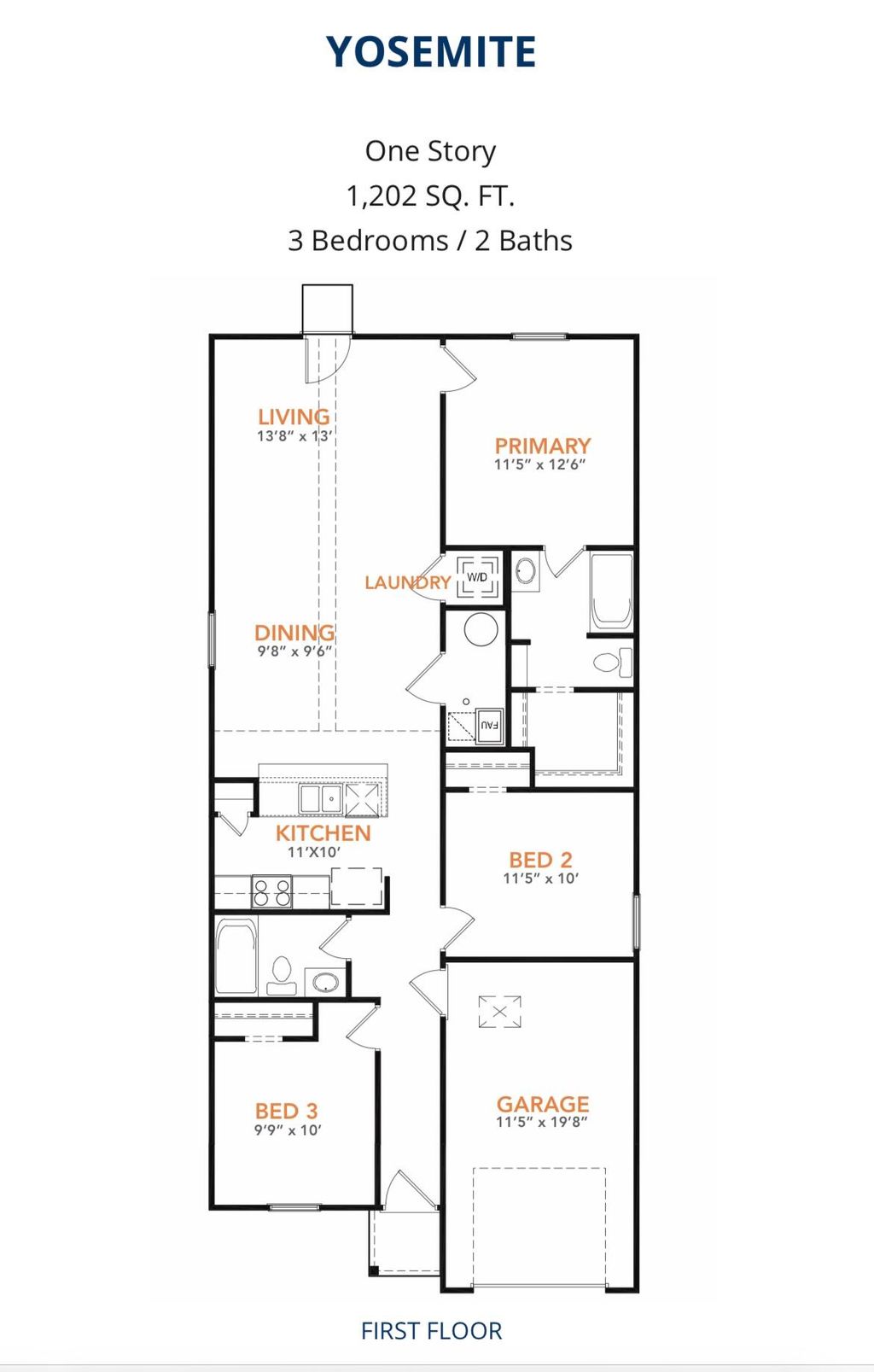 The Yosemite Plan from our Freedom Series is a cozy and efficient single-story home featuring 3 bedrooms, 2 bathrooms, a 1-car garage, and 1,202 square feet of smartly designed living space. This split-level floorplan places two secondary bedrooms and a full bathroom at the front of the home, offering privacy and convenience. Continue into the open-concept living area, where the kitchen with a central island overlooks the dining area and family room"”perfect for meals, gatherings, and quality family time. The primary suite is thoughtfully positioned off the family room for added privacy and includes a private bathroom and walk-in closet. The laundry room is also conveniently located on this side of the home for easy access. Photos are for illustrative purposes only and may be of a similar house with the same floor plan.