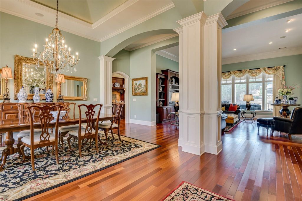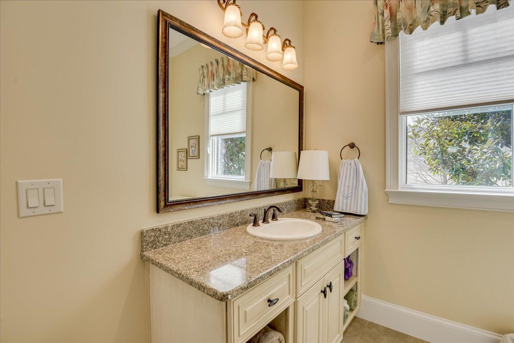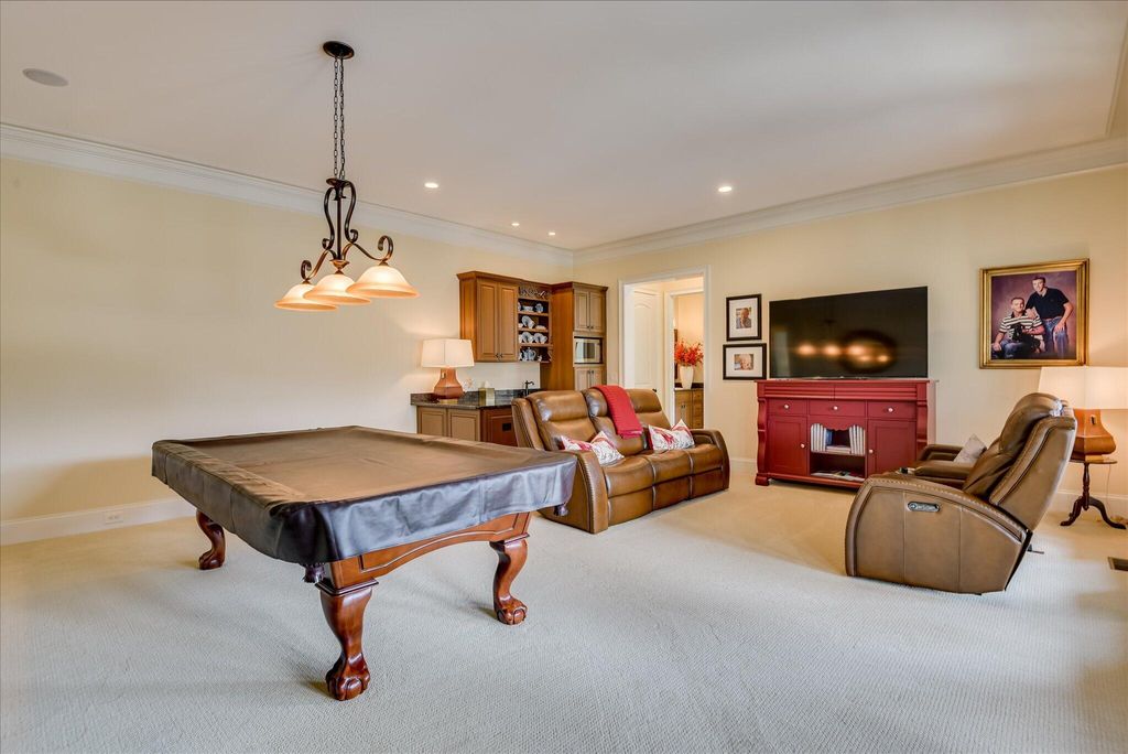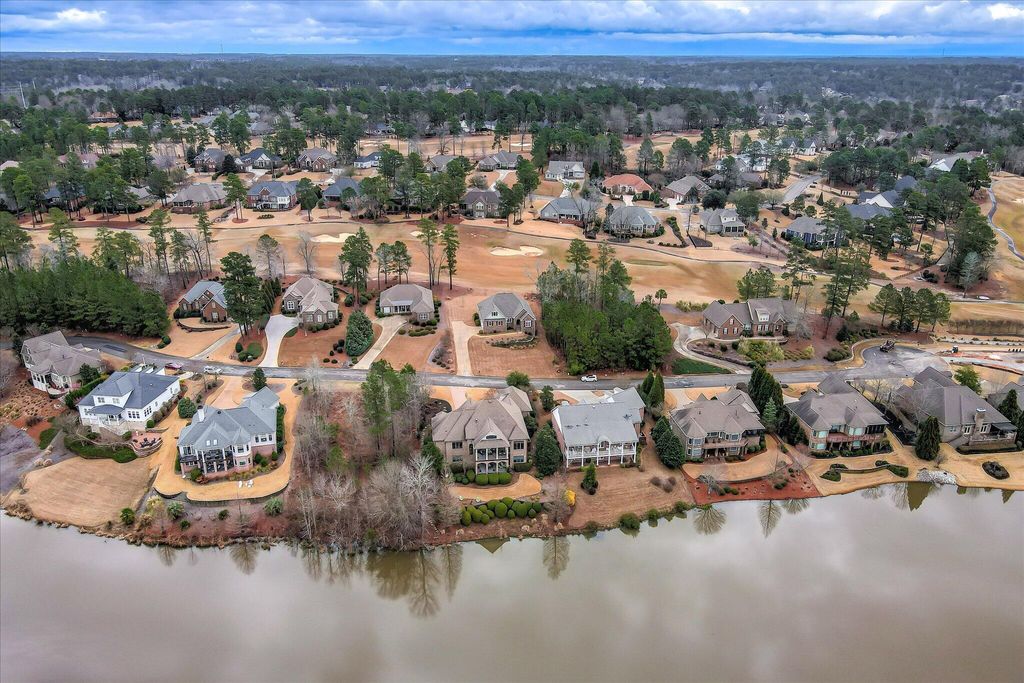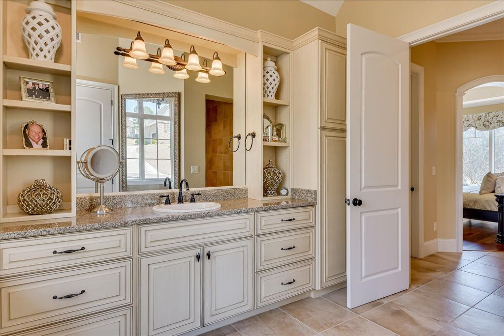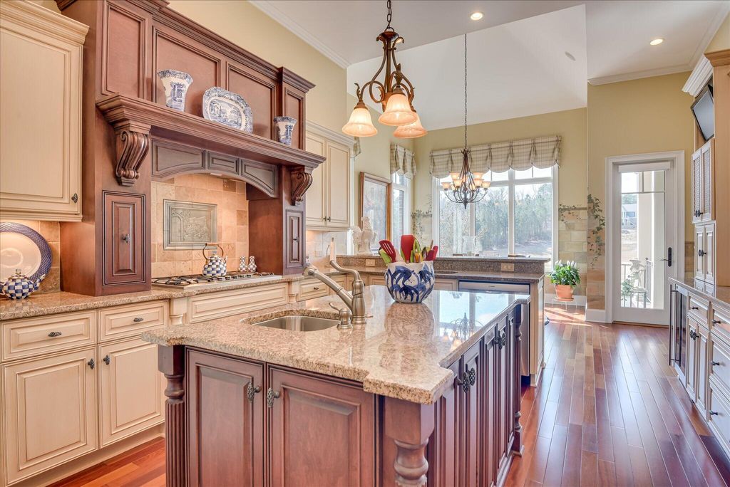 Located in the prestigious, gated community of The Reserve at Woodside, this exceptional lakefront home offers breathtaking views and refined craftsmanship throughout. Custom built by Designer Builders, the home features 3 bedrooms and 3.5 baths, with a spacious primary suite conveniently located on the main level. The main floor offers approximately 2,845 square feet, while the walk-out lower level provides an additional 1,453 square feet of beautifully finished living space. Outstanding curb appeal begins with a brick paver driveway and continues with intricate brick and stone detailing that leads to an impressive front entry. Inside, the welcoming foyer showcases rich Brazilian cherry hardwood floors that extend throughout the main living areas. Just off the foyer, a beautifully appointed office features custom built-ins, a coffered ceiling, and elegant 8-foot French doors. The formal dining room, highlighted by a dramatic ceiling design, is perfectly positioned for seamless entertaining. The spacious great room offers a striking wall of custom built-ins with an entertainment center on one side and a gas fireplace on the other. Large openings lead to the covered porch, creating an effortless indoor-outdoor flow and allowing you to enjoy the tranquil lake views. The great room flows naturally into the gourmet kitchen, which features stunning granite countertops, custom cabinetry with pull-out storage, a center island with prep sink, and a walk-in pantry. Top-of-the-line stainless steel appliances include a gas cooktop with hood, wall oven, microwave, dishwasher, built-in refrigerator, and wine cooler. The breakfast nook is ideally positioned to capture beautiful lake views while you start your day. Step outside to the covered porch, an ideal space for relaxing or entertaining while taking in the peaceful waterfront setting. A conveniently located powder room is situated just off the great room for guests. The main-level primary suite is a private retreat featuring serene lake views, a spacious bedroom, and a luxurious bathroom with dual granite vanities, a large walk-in tiled shower, and separate his-and-her closets with custom organizers. The walk-out lower level is designed with guests and entertaining in mind. Here you will find two guest suites, each with its own ensuite bath and lovely lake views. Additional living spaces include a recreation room with a pool table and a comfortable family/sitting room with a kitchenette complete with built-ins, sink, cabinetry, microwave, and refrigerator; perfect for guests to enjoy morning coffee or late-night snacks. French doors open to another covered patio, offering a peaceful outdoor retreat overlooking lush landscaping and sparkling water views. This private backyard oasis creates the perfect setting to relax and unwind-you may never want to leave.