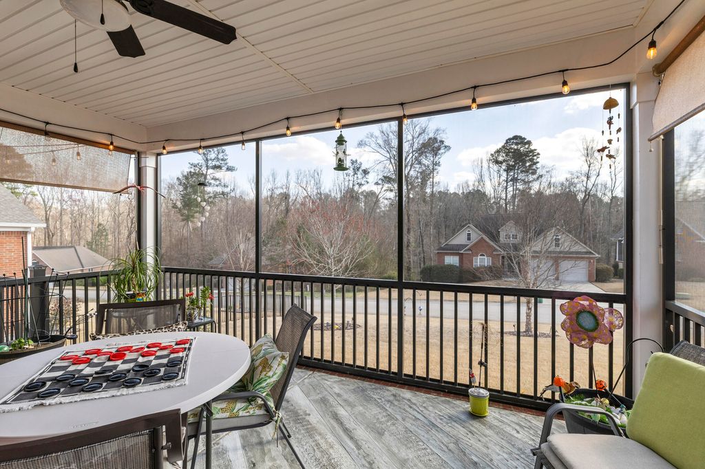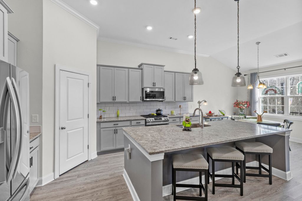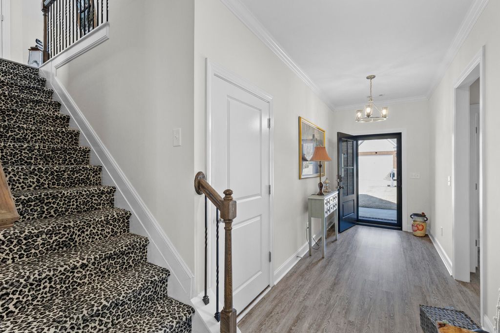 Welcome home to this beautiful solid brick residence in the desirable Mount Vintage community, offering modern design, thoughtful layout, and exceptional amenities! This 2,513 sq. ft. smart home features 4 bedrooms, 3 full bathrooms, and a 2-car attached garage. The inviting foyer opens up to an 11' high ceilings and open concept floor plan which seamlessly connects the kitchen, dining, and living areas, creating an ideal space for both everyday living and entertaining. The spacious kitchen features a large island, a walk-in pantry, ample cabinetry, and overlooks the inviting living room complete with a cozy fireplace. The primary suite is conveniently located on the main level and offers a generous walk-in closet, an en-suite luxury bathroom with barn door entry, double vanities, soaking tub, separate tiled shower, and water closet. Also on the main level are two additional bedrooms that share a full bathroom, along with a dedicated laundry room for added convenience. Upstairs, you'll find a fourth bedroom with its own attached full bath and large closet, making it perfect for guests or a private retreat. The spacious bonus room offers endless possibilities: use it as a home office, media room, playroom, fitness area, hobby space, or additional guest area. Step outside to enjoy the gorgeous screened-in porch and attached Trex deck with aluminum railing, great for relaxing or entertaining while overlooking the beautifully landscaped yard. Perfect area to admire colorful sunsets!! Yard all around this beautiful house features complete 7-zones sprinkler system throughout to help keep everything lush and green. Interior finishes include durable LVP flooring throughout the bedrooms, closets, and main areas, tile in the bathrooms and laundry room, and carpet on the stairs with original oak treads underneath. Located in the sought-after Mount Vintage community, residents enjoy outstanding amenities including a 27 hole golf course, swimming, bocce ball courts, tennis, fitness center, clubhouse, community garden and scenic walking areas, all within a peaceful and welcoming neighborhood. This move-in-ready home offers modern comfort, flexible living spaces, and access to an incredible community lifestyle. Schedule your showing today! Up to 1% Lender Credit towards closing costs or rate buydown with preferred lender!