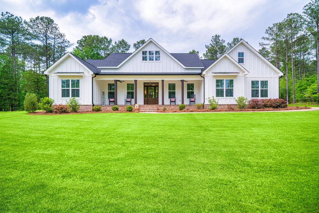 #FarmHouseStyle This home exudes timeless elegance. The inviting rocking chair front porch welcomes you to come relax and enjoy the nature. Step into the spacious foyer, where luxury plank vinyl flooring sets the tone. There is an dedicated office space for work or creativity. The great room is the perfect space to cozy up by the fireplace with its brick surround and shiplap accent. The built-in bookshelves add character. The kitchen which is the heart of the home features a large island, ample cabinet space, & stylish subway tile backsplash. Stainless steel appliances, including a gas stove and a farmhouse sink that will make cooking a pleasure. The master suite has tray ceilings and crown molding that elevates the room. The master bathroom boasts with a custom tiled walk in shower, large tub, & two sinks. In the laundry room practicality meets style with a folding area. The mud area will help keep things organized. Enjoy fresh air in your spacious backyard, where you can host gatherings, play, or simply unwind. The covered porch provides shade, while the uncovered patio is deal for soaking up the sun. Do not miss out on the exceptional home!