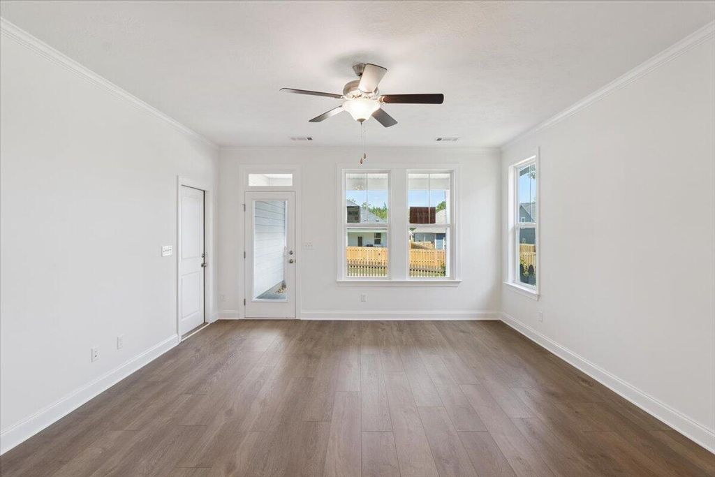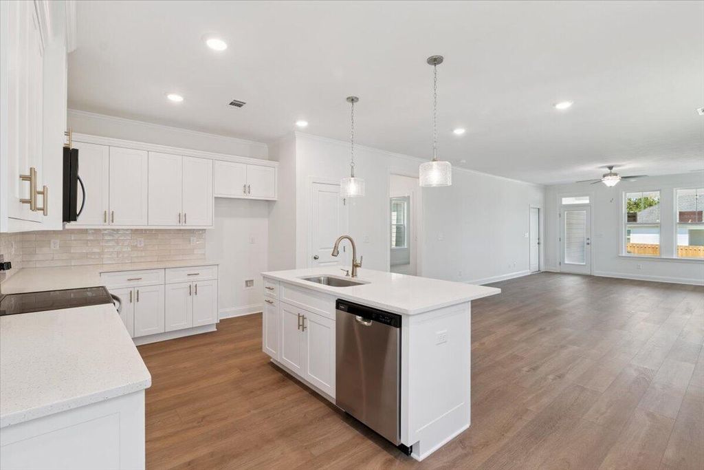 The Finch Plan boasts contemporary design with clean lines, sleek finishes, and a focus on functionality, creating a space that is both stylish and practical. Upon entering this single-story home, to the left is a hallway that houses the flex room, two secondary bedrooms, a full bathroom, and laundry room. Moving back down the foyer you flow into the open kitchen, cafe, and family room area. Located off of the cafe is the entrance to the owner's suite with a relaxing and spacious owner's bathroom with walk-in closet. At the rear of the home is the 2-car garage and covered back porch, both with entrances from the family room.