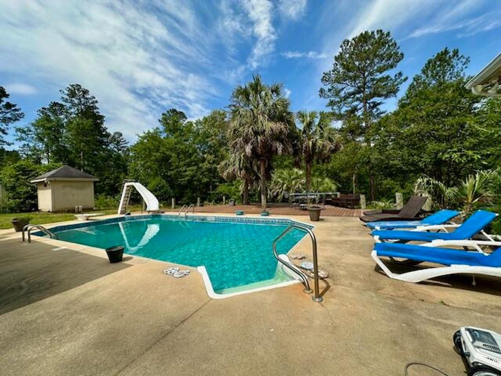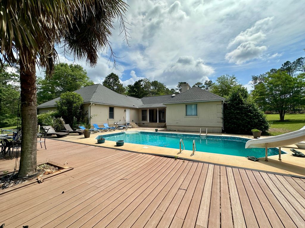 Rare offering...custom-built home on nearly 50 acres with mix of open land and timber. This 3,158-sq-ft home features a spacious open floorplan with 4 bedrooms, office space, theatre room/flex room and 4 full bathrooms. Appreciate hardwood floors throughout the living areas, and well-appointed kitchen with granite counters, generous custom cabinetry, updated stainless steel appliances, tile backsplash, accent lighting & more. The owner's suite features his and hers closets and an updated bath with heated tile floors, soaking tub, walk-in tile shower, and beautiful custom vanities. Flex room features en suite bathroom, so options are endless for guest suite, entertaining space, man cave and more. French doors from the living room lead to the covered back porch & patio overlooking the impressive pool deck, where the in-ground swimming pool and surrounding area are accented with palm trees and beautiful landscaping...perfect for gatherings & outdoor enjoyment. The home is tucked towards the rear of the property, where the landscaped grounds have been carved out of surrounding woods that provide a beautiful backdrop. The property is accessed by a gated entrance & a winding drive leads through open fields that would be perfect pasture space for horses, etc. Double attached garage; large outbuilding offers generous storage. A must-see if in the market for acreage! *The 49.48 acres offered includes tax parcels 2650003040 & 2650024020.