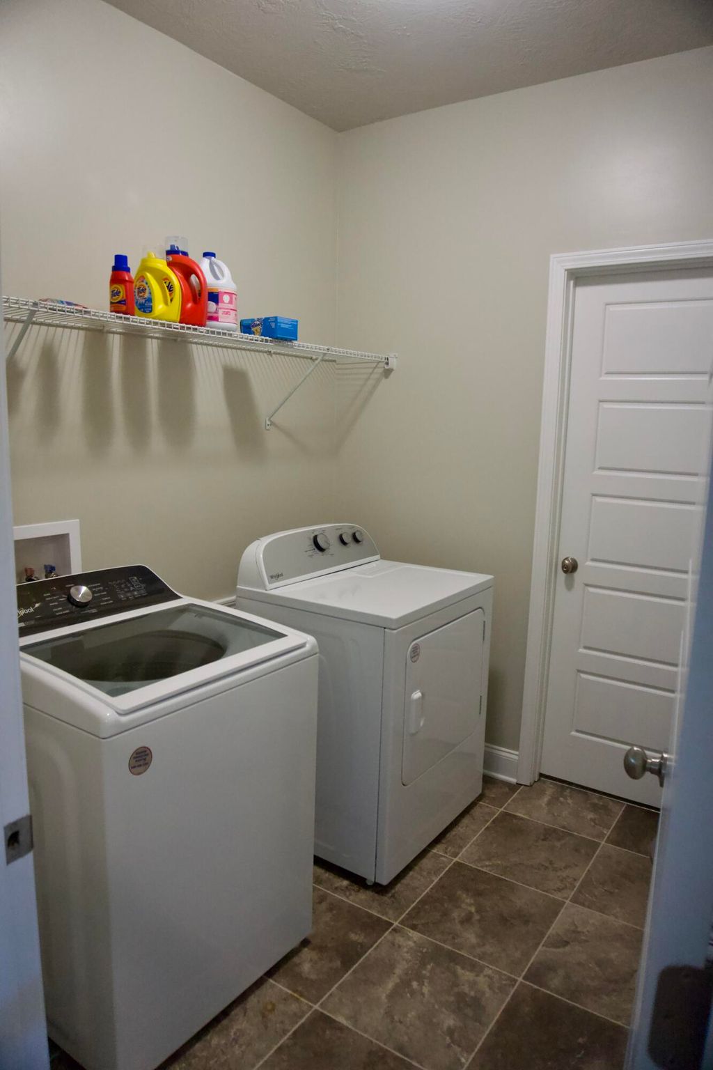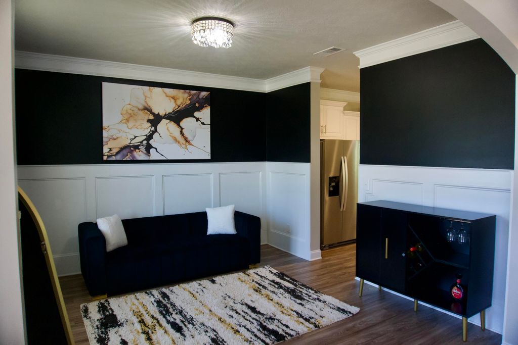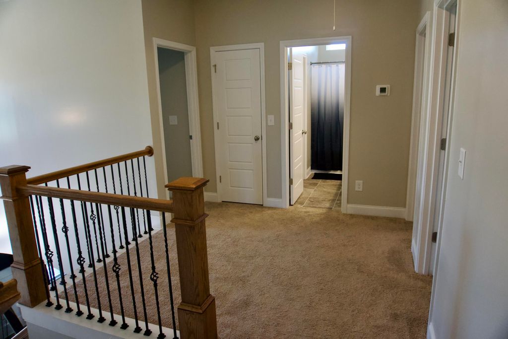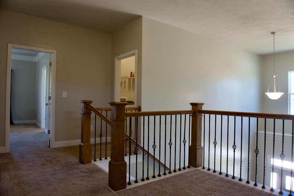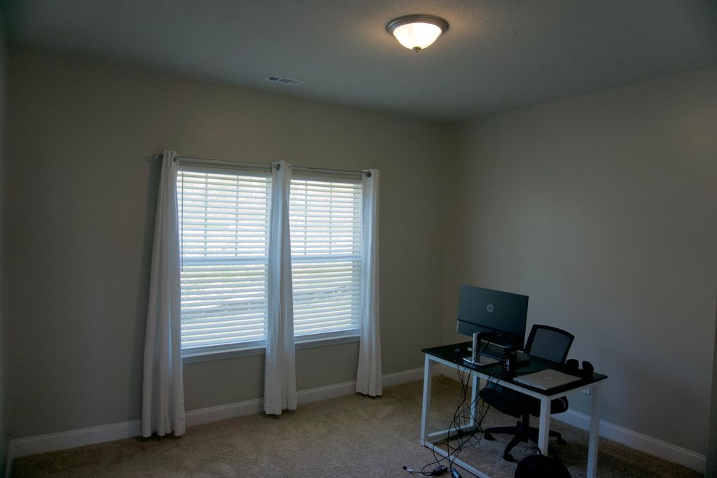 Welcome to this beautifully crafted 2-story home featuring 5 spacious bedrooms and 3 full bathrooms. Step inside to a grand 2-story foyer flooded with natural light, setting the tone for the open and airy feel throughout the home. Luxury vinyl tile flooring stretches across the main living areas, and plush carpet in each bedroom. You're also greeted with a versatile formal dining room or entertainment room, highlighted by white picture frame molding set against bold black walls for a sophisticated contrast. A bright, all-white kitchen features upgraded white daydream quartz countertops, artisan-style vinyl cabinetry, and a full suite of stainless steel appliances. The expansive owner's suite is complete with a garden tub, a separate upgraded shower finished in Prism Agate tile, and a dual vanity. The suite also boasts a large walk-in closet, extra storage closet, and an innovative layout that connects the owner's closet directly to the laundry room, forming a seamless loop from bedroom to bath to closet to laundry. One bedroom on the main floor provides flexibility for guests or a home office. Outside, relax on covered front and rear porches and enjoy the large yard on all four sides, fully irrigated with a sprinkler system that covers every inch. A 2-car garage and modern finishes throughout make this home a rare find!