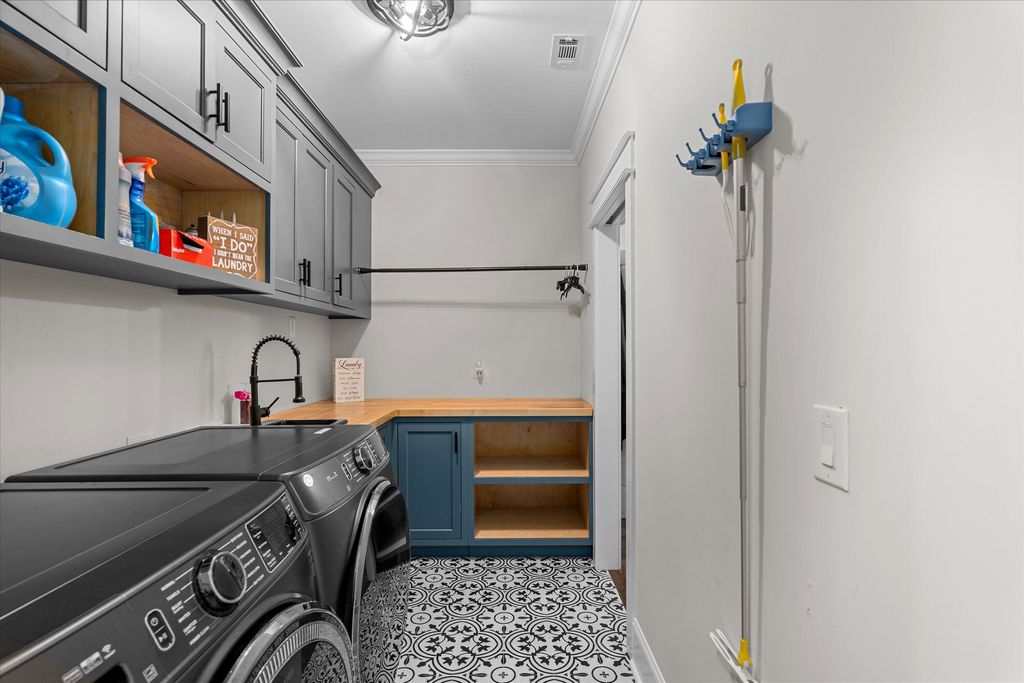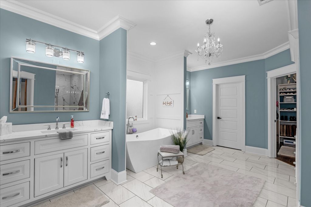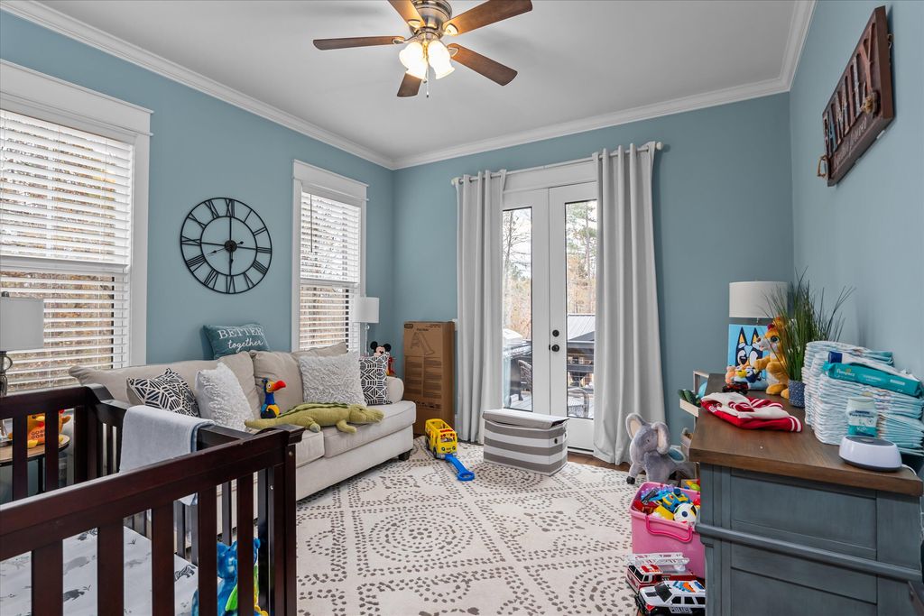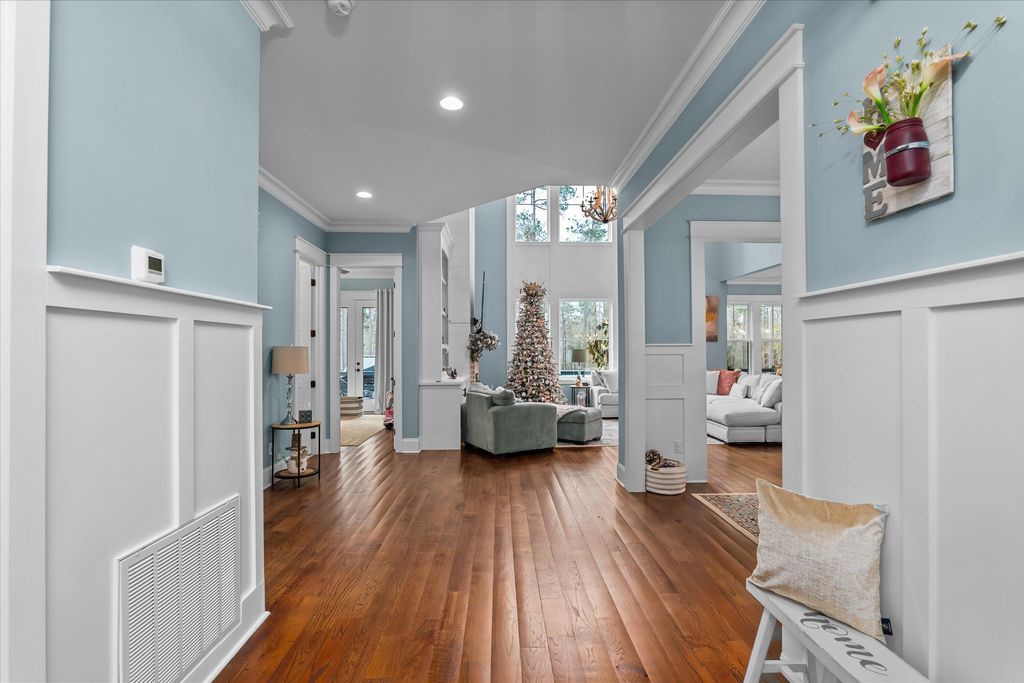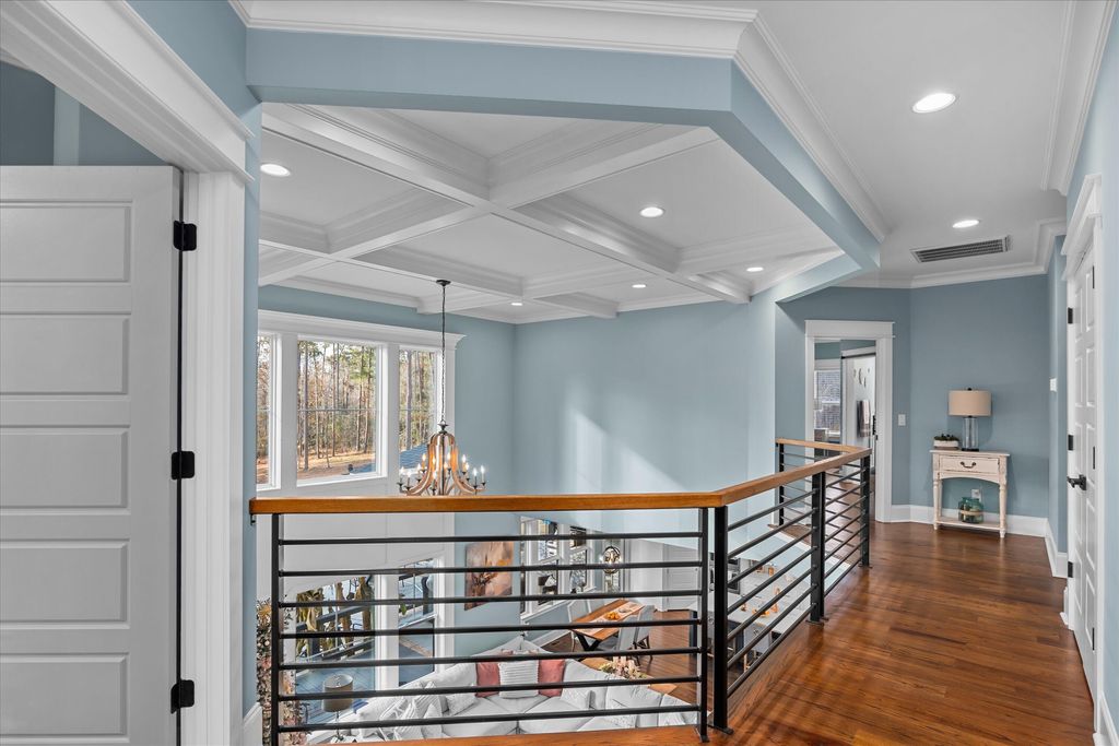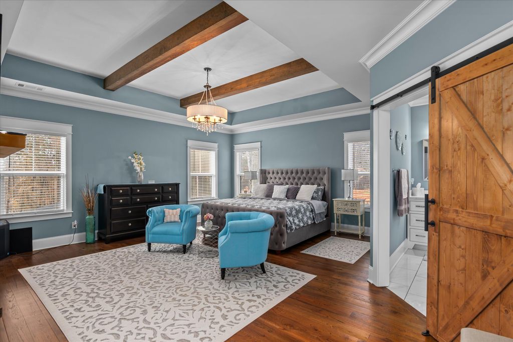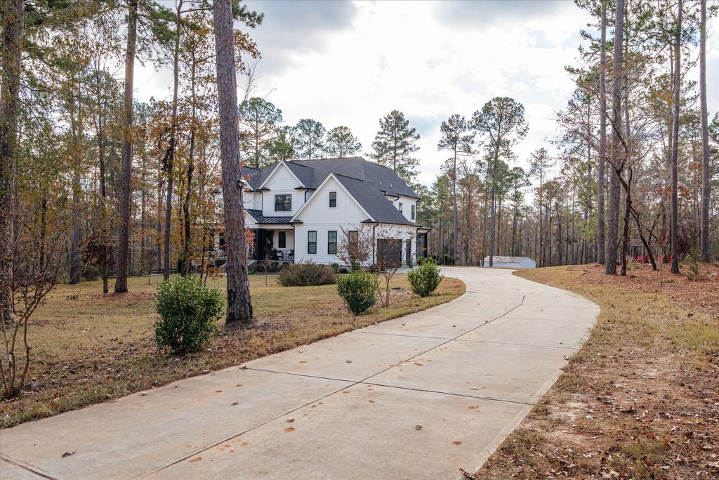 Discover this exquisite home set on a beautifully secluded 2.7-acre property in the sought-after heart of Evans. This meticulously designed residence blends elegance with comfort, creating an inviting sanctuary perfect for both relaxation and entertaining. As you arrive, you'll be greeted by a grand entrance through an automatic privacy gate and charming front porch featuring custom-welded railings and warm wooden ceilings. The lush Bermuda grass lawn, maintained by a comprehensive irrigation system, spans across 1.5 acres, showcasing a perfectly manicured outdoor space that highlights the home's thoughtful landscaping. Step into nearly 4,000 sq. ft. of luxurious living space where every detail has been carefully curated. The main level welcomes you with rich three-quarter hardwood floors throughout, leading to the spectacular great room with 20-foot ceilings and expansive windows that flood the space with natural light. An adjacent hearth room offers a cozy setting for intimate gatherings. The heart of the home is its gourmet kitchen, a chef's dream come true. Adorned with custom high-end cabinetry that extends to the ceiling, quartz countertops, a farmhouse sink, and a stunning quartz island, this kitchen is as functional as it is beautiful. Entertaining is made easy with the adjacent dining room, complete with a custom-built wine display featuring seamless LED lighting for an elegant touch. For added convenience, the main level includes a spacious mudroom with a built-in storage room, while a personal office is enhanced by custom cabinetry reaching up to the ceiling, perfect for working from home. The primary suite is a true retreat, featuring a cozy fireplace and wooden beams accent. The luxurious ensuite bath is accessed through a charming barn door and boasts a spa-like, doorless walk-in shower, a garden tub, and quartz-topped vanities. The expansive walk-in closet features custom cabinetry, built-in storage, and a center island with quartz countertops, ensuring plenty of space for wardrobe and accessories. Upstairs, you'll find three generously sized bedrooms, each thoughtfully designed with built-in storage and served by beautifully appointed bathrooms with quartz countertops and custom cabinetry. The outdoor spaces are equally impressive. Relax and entertain on the large back deck or enjoy evenings by the firepit with family and friends. The expansive backyard includes a 20x30 garage shed, a swimming pool, covered jacuzzi, a charming gazebo, and a fully-equipped outdoor kitchen with marble countertops, a built-in grill, flat top, TV, and ceiling fan. The property also features exterior lighting throughout and a comprehensive surveillance system for added security. Completing this property is a spacious three-car garage with insulated doors, built-in cabinets, and abundant storage options. The home's exterior is wrapped in durable Hardie siding, ensuring both beauty and longevity. Situated in a prime Evans location, this home offers the perfect blend of privacy and convenience, providing easy access to nearby amenities while maintaining a tranquil, estate-like atmosphere. Don't miss this rare opportunity to own a truly spectacular home where no detail has been overlooked. Schedule your private tour today to experience all that this exceptional property has to offer!