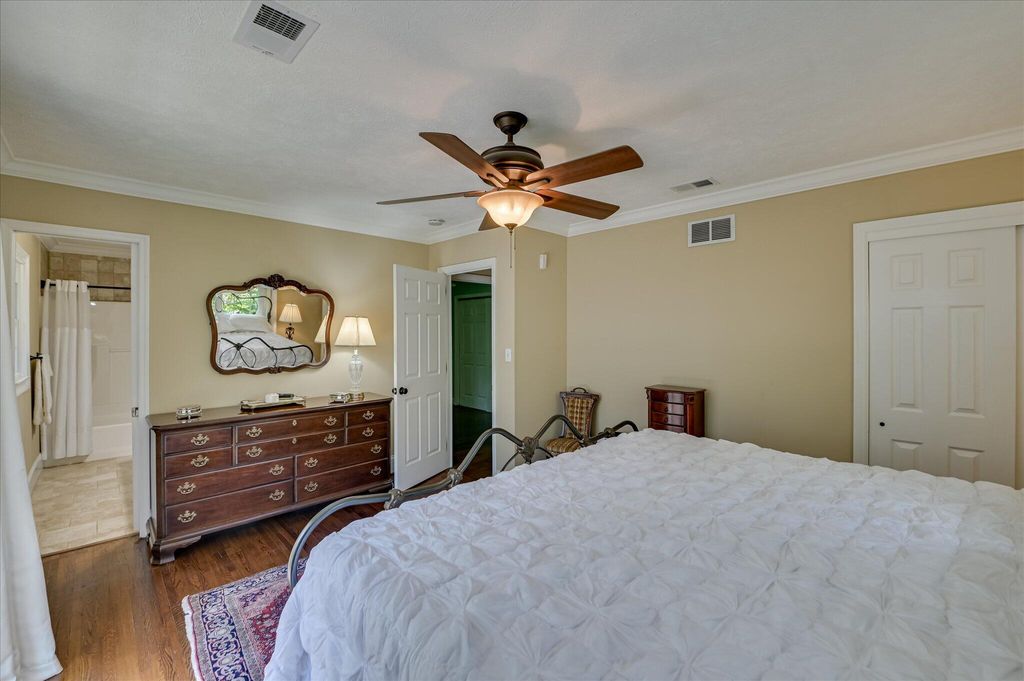 An Oasis in the Heart of Aiken! This meticulously maintained property offers the best of Aiken. Location, Location, Location. Custom Wood and Iron doors swing open to reveal an extraordinary lush and verdant back yard teaming with bird song. The gardens and grounds outside are a visual delight! Deck with adjoining outdoor brick fireplace at rear has view of circular in- ground pool with jetted fountain. Flowers, water features and garden containers create a beautiful place to relax and enjoy nature. Small Workshop with electricity at rear. Bee hive and small chicken coop for the urban homesteader. Outdoor kitchen features grill, cooktop, stainless drawers and wine/beverage refrigerator. Hand crafted wooden counters over 3 sides for seating and entertaining friends and family. This 100% brick ranch offers a galley kitchen with granite counter tops. Kitchen has rich wood cabinets with storage galore. Living Room has bookcases that flank the large mantel and fireplace surround. Ensuite Primary bedroom with sliding doors to outside private deck and seating area. Hardwood floors shine throughout the home. Separate Guest House/Studio Apartment with front porch, full bath and mini kitchen. Easy maintenance with brick exterior, vinyl clad soffits and new gutters with guards. Come see for yourself this jewel in Downtown Aiken.