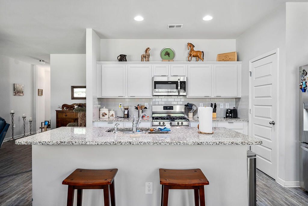 Welcome to this beautiful 4-bedroom, 2-bath ranch-style home located in the highly desirable Hitchcock Crossing neighborhood of Aiken. Built in 2019 and situated on a private lot backing to green space, this 2,025 sq ft home offers both comfort and style in a serene setting. The bright, open floor plan features high ceilings and a spacious living area centered around a cozy gas fireplace. The gourmet kitchen boasts granite countertops, a large island, tile backsplash, pantry, built-in microwave, gas range, and recessed lighting. A sunny eat-in dining area overlooks the beautifully landscaped backyard ideal for gatherings and everyday living. The split bedroom layout provides privacy, with the owner's suite offering a spa-like ensuite including a double vanity, oversized walk-in shower, garden tub, private water closet, linen storage, and a large walk-in closet. Three additional bedrooms, one of which is perfectly suited for an office or flex space, share a spacious full bathroom. Step outside to a covered back porch and enjoy a fully irrigated, lush lawn both front and back. Additional features include a generous laundry room, ample closet space, pull-down attic with flooring, gutters, two-car garage, fenced back yard and a charming front with great curb appeal. This SMART home is equipped with a video doorbell, smart lock, thermostat, and garage opener, all operable via an integrated security system. Conveniently located minutes from the University of South Carolina Aiken, historic downtown, and easy access to I-20 offering a quick commute to both Augusta and Columbia. Don't wait, set up a tour today!