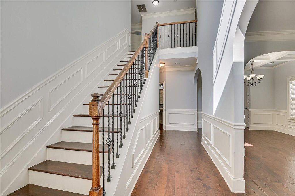 Beautiful well-maintained home, freshly painted throughout, with a 2-story foyer and hardwood flooring throughout the main level. Enjoy stainless appliances, Kitchen Island, and Granite countertops open to the living area with a stone fireplace. Open floor plan including a formal dining room, formal living room with bay window. Beautiful staircase w/ iron spindles leading up to second floor landing and 4 bedrooms. High tray ceiling in the spacious master bedroom. Custom tall interior doors. Covered front porch & covered back porch with a privacy fenced yard.
