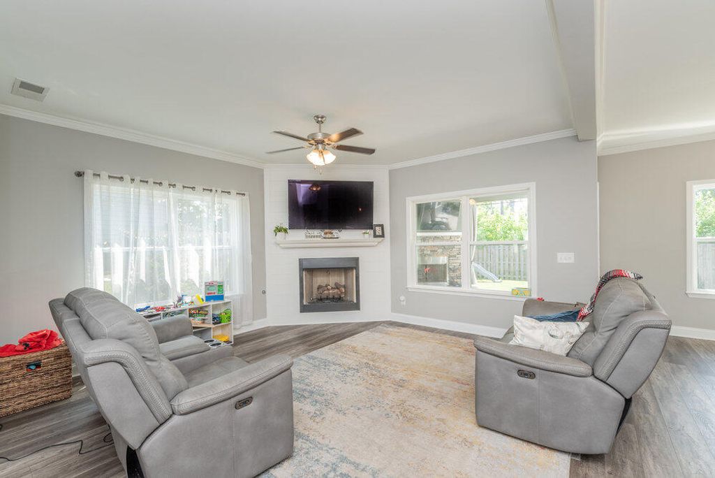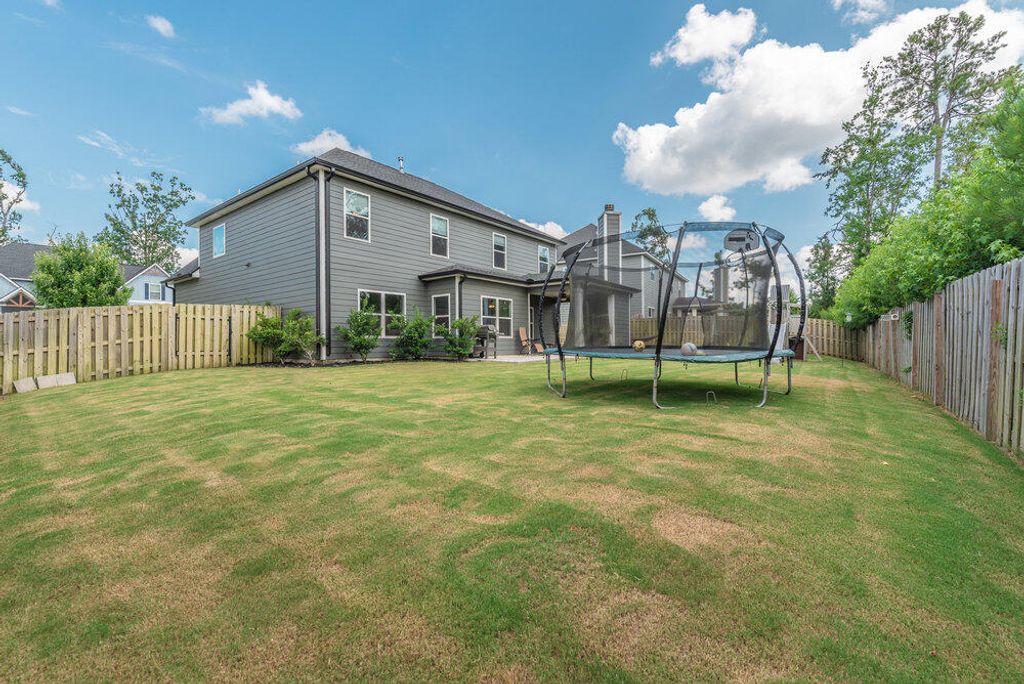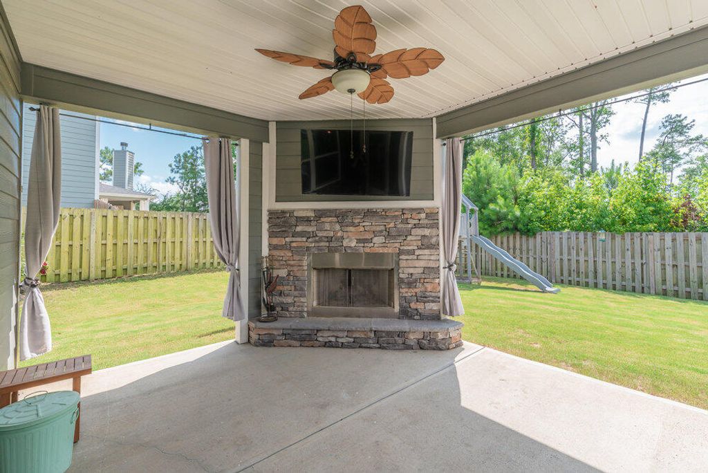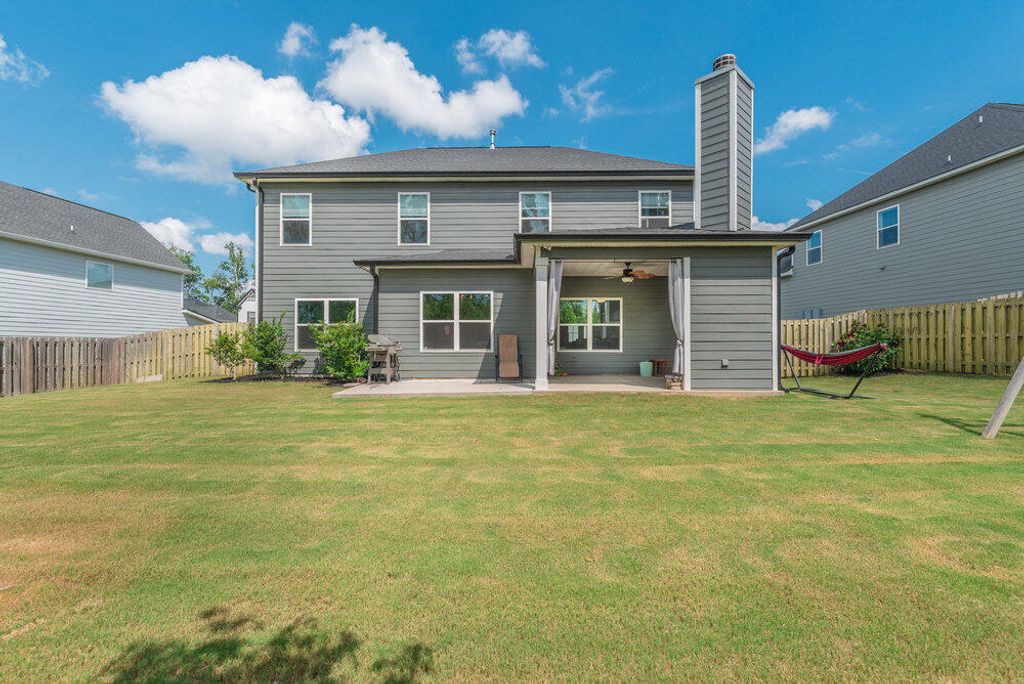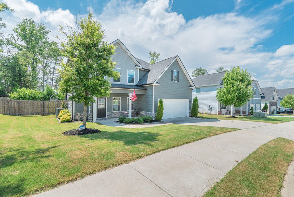 Welcome to this 2540 SF home featuring 5 bedrooms & 3 baths in the heart of Evans. This gorgeous home by Crawford Creek Homebuilders is on a premium green space lot. This open floor plan home is perfect for entertaining. Featuring new LVP flooring throughout the main level, a large kitchen featuring granite counters, natural gas range, tiled backsplash, & pantry, and extended cabinets. The great room features a gas fireplace w/ tile surround and opens to the rear porch with an outdoor fireplace. The dining room features beautiful judges paneling & coffered ceilings. Owner Suite upstairs, plus 3 additional bedrooms up and 1 bedroom and 1 full bathroom down. Fully landscaped & irrigated with a privacy fence. Garage features additional storage shelves, platforms to the ceiling and walls. Crawford Creek Neighborhood features a resort-style pool, clubhouse, miles of walking trails, 2 playgrounds, & firepit.