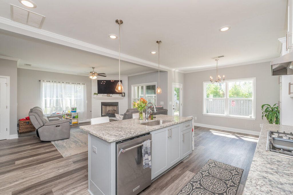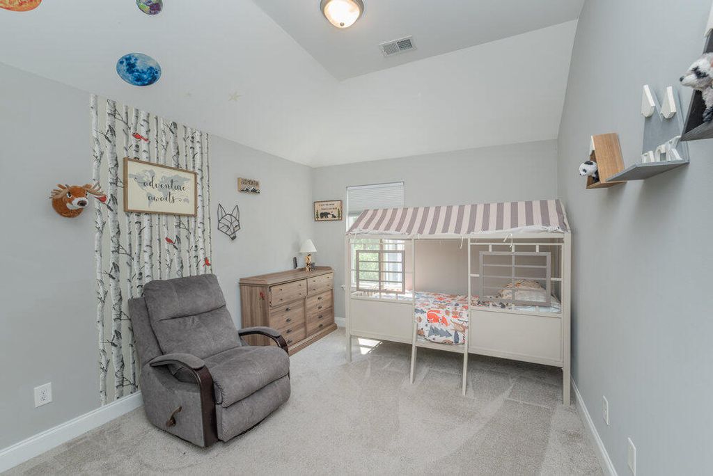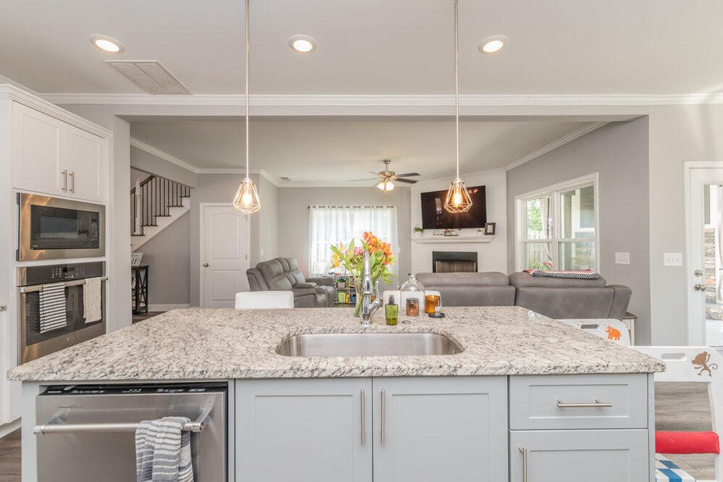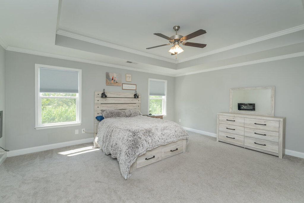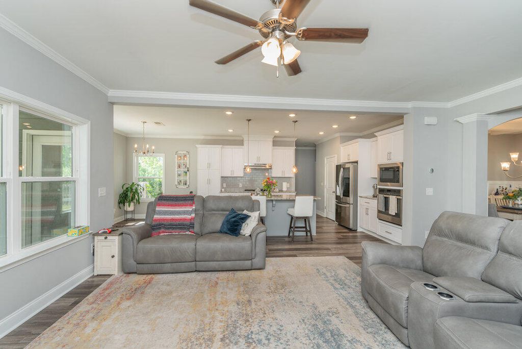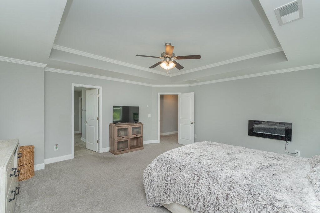 Welcome to this 2540 SF home featuring 5 bedrooms & 3 baths in the heart of Evans. This gorgeous home by Crawford Creek Homebuilders is on a premium green space lot. This open floor plan home is perfect for entertaining. Featuring new LVP flooring throughout the main level, a large kitchen featuring granite counters, natural gas range, tiled backsplash, & pantry, and extended cabinets. The great room features a gas fireplace w/ tile surround and opens to the rear porch with an outdoor fireplace. The dining room features beautiful judges paneling & coffered ceilings. Owner Suite upstairs, plus 3 additional bedrooms up and 1 bedroom and 1 full bathroom down. Fully landscaped & irrigated with a privacy fence. Garage features additional storage shelves, platforms to the ceiling and walls. Crawford Creek Neighborhood features a resort-style pool, clubhouse, miles of walking trails, 2 playgrounds, & firepit.