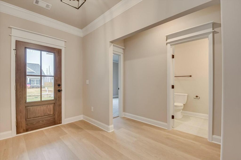 The Nottingham Plan by Oconee Capital Home Builders. This stunning single-story home offers 3 bedrooms, 2 full bathrooms, and an open-concept layout perfect for modern living. The spacious great room features an electric fireplace and seamlessly connects to the kitchen and dining area. Ideal for entertaining. Throughout the home, you'll find elegant lighting and detailed custom trim work that adds a touch of sophistication. The kitchen is a true centerpiece, complete with granite countertops, a stylish tile backsplash, and stainless steel appliances. The owner's suite is designed for comfort, offering a double vanity, walk-in shower, and generous walk-in closet. Two additional bedrooms share a well-appointed full bath. Step outside to enjoy your fully landscaped yard from the comfort of your covered front or back porch. Located in The Sanctuary, this community offers sidewalks, streetlights, a scenic walking trail, and a large community garden"”perfect for those who value a connected and easygoing lifestyle. Just minutes from Downtown Aiken, Bruce's Field, Hitchcock Woods, top equestrian venues, shopping, and fine dining. Note: Photos shown are of a previously built Nottingham Plan. Home features, finishes, colors, and fixtures may vary. Buyer to verify square footage and school zones.