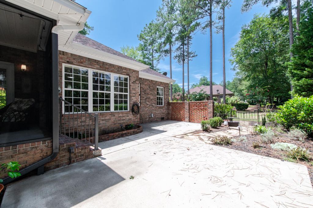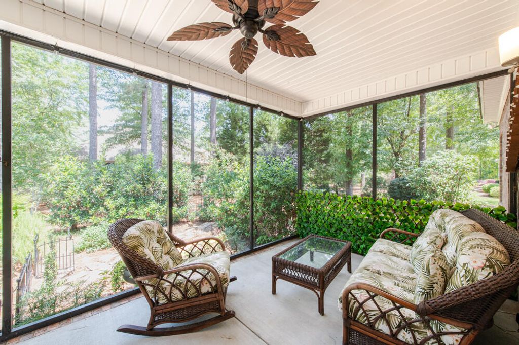 Welcome to Cedar Creek, a highly desirable and meticulously maintained community, proudly voted the best place to live in Aiken! This beautiful, move-in-ready home offers an inviting covered front porch, perfect for relaxing and greeting neighbors! Spanning 2,446 square feet on a spacious half-acre lot, this one-level residence features 3 bedrooms, 3 full bathrooms, and a versatile flex room upstairs which could make a 4th bedroom! The open and airy floor plan is accentuated by tall windows, crown molding, and beautiful hardwood floors! The living room boasts a tray ceiling, cozy fireplace, and an upgraded ceiling fan, flowing seamlessly into a lovely screened indoor patio, ideal for enjoying your morning coffee which leads to a private inner yard with a lush garden, the outer yard is surrounded by mature evergreen, oak, and pine trees, creating a peaceful retreat! Solar tube skylight naturally lights up the gourmet kitchen with a rare moveable island for your culinary convenience and a breakfast bar with beautiful quality cabinetry, granite countertops, stone backsplash, a 5-burner gas range, built-in microwave, dishwasher, refrigerator, appliance garage, and a cabinet pantry! The dining room features elegant wainscoting, perfect for family gatherings or enjoy casual meals in the breakfast room! The spacious owner's suite offers a luxurious, spa-like en-suite bath with a leathered granite double sink vanity, LED mirrors, and a new beautifully tiled huge walk-in shower! Two guest bedrooms are conveniently located near a stylish guest bathroom with a framed mirror, quartz top vanity, and vessel sink! The laundry room includes a utility sink for added convenience! Professional landscaping and lighting in both the front and backyard! The home features recent updates, including new lighting fixtures, ceiling fans, Decora receptacles and switches, barn doors, and lever-style door handles! Safety and comfort are prioritized with new smoke alarms and CO2 monitors, surround sound, and thoughtful touches like custom art lighting! The side-entry two-car garage is equipped with a ceiling fan and heater, providing extra comfort and functionality! Ask about Cedar Creek's exceptional amenities, including a golf course, swimming pool, walking trails, and lighted tennis courts! This beautiful home combines comfort, style, and community - don't miss your chance to make it yours!