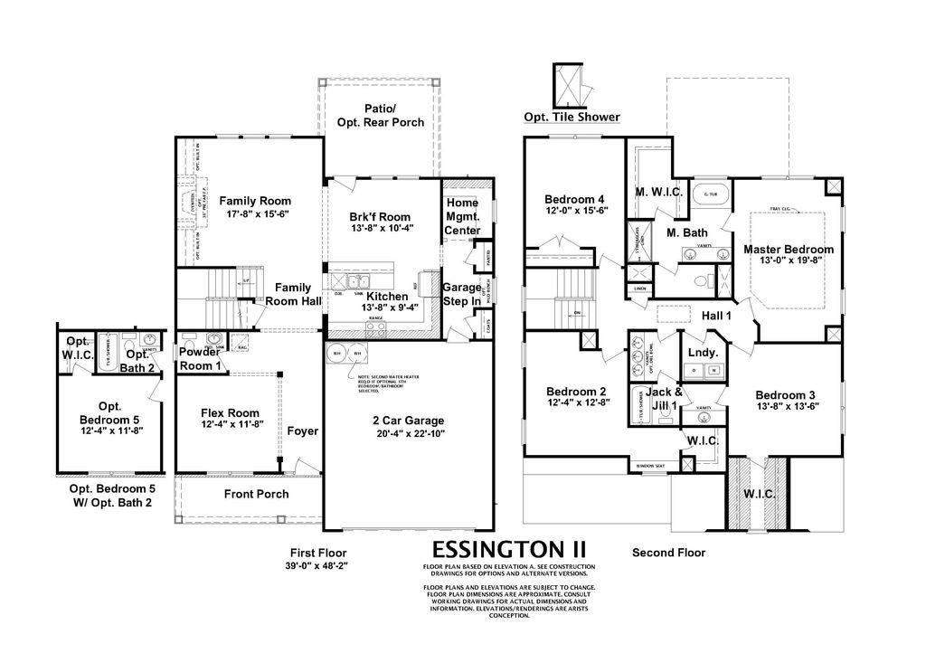 The Essington II plan by Ivey Homes features all the comfort and convenience a home owner could want! The first floor features an open layout with every room flowing into the next. There is a flex room at the front which could be used as a living room or formal dining room, or it can be converted into a 5th Bedroom. The family room is spacious and flows directly into the kitchen and breakfast room. The kitchen features a generous amount of cabinet space. Tucked behind the kitchen is the home management center and mud room providing convenience and organization. Upstairs are four bedrooms including the Master Suite. The master suite provides all the comfort you desire with a spacious master bath, featuring separate tub and shower, and a large walk-in closet. The other three bedrooms are of generous size with 2 having walk in closets. Completing the upstairs is a Jack and Jill bath and the laundry room. This is a great floor plan for the family to enjoy or to entertain guests.