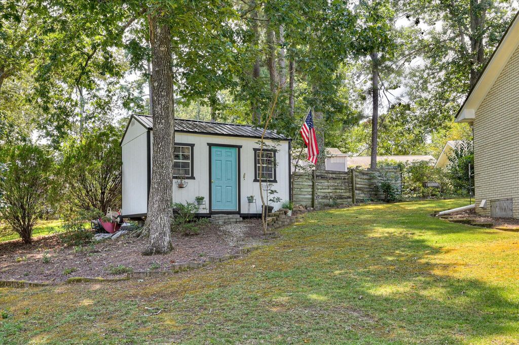 Situated in the Houndslake neighborhood, the expansive, beautifully landscaped yard welcomes you home to 718 Winged Foot Drive. Upon entering the home, the open concept living and dining rooms boast gorgeous, oak hardwood floors, cathedral ceilings with exposed wood beams, a 2-way fireplace, and custom windows with built-in blinds which fill the rooms with natural light. The kitchen is an entertainer's dream! Offering a custom tile backsplash, duel-fuel range, and extensive counter and cabinet space, get-togethers and holiday meals will be a breeze in this kitchen! Speaking of breezes, the back patio, accessible by the dining room, is a wonderful place to enjoy an afternoon lunch or evening meal with the cool autumn breezes approaching! There are two guest rooms which share a hall bathroom with linen closet, and the large master suite offers 2 walk-in closets and an adjoining master bathroom. There are so many storage options with this home, with an attic accessed in the 2-car garage, an attached storage shed outside the garage doors, and additional 10x16 shed conveying, storing all your upcoming Christmas/Holiday decorations will be no trouble. This home has been meticulously maintained and is ready to move on to the next chapter of ownership. Conveniently located near Aiken's Southside dining and shopping.
