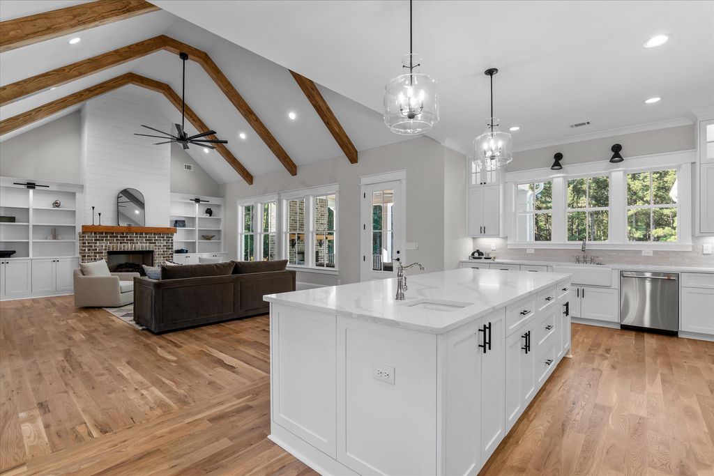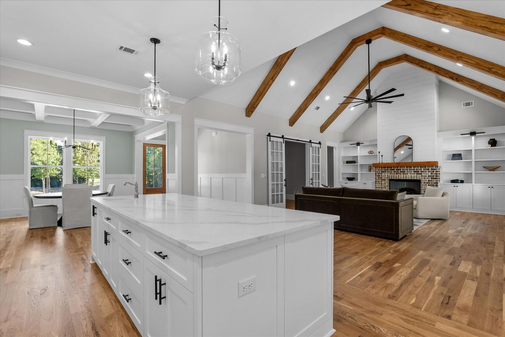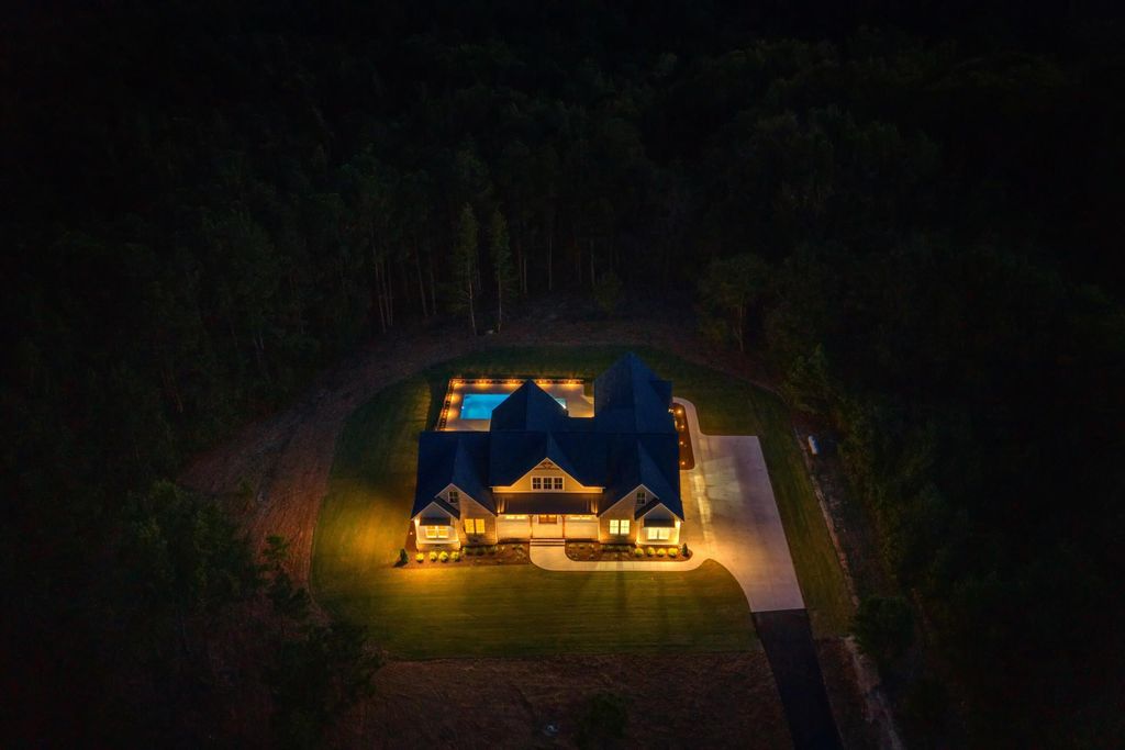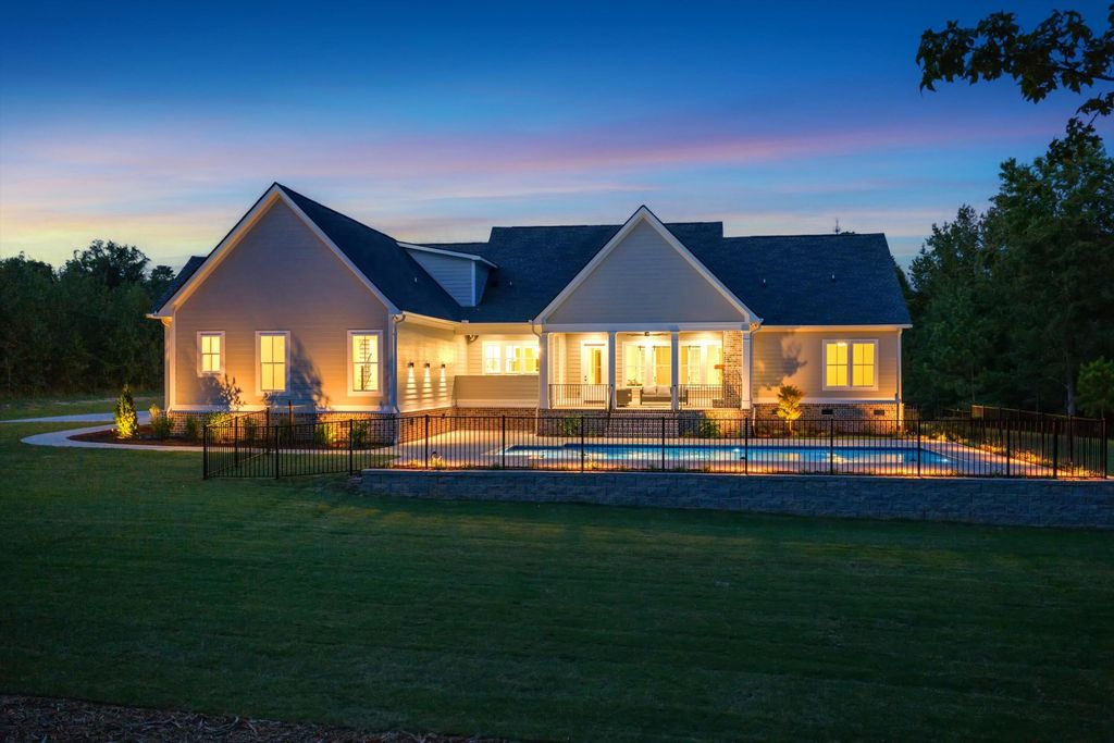 Amazing opportunity to purchase your dream property by Ironwood Custom Homes where luxury meets privacy convenient to life on the lake! Nestled on 6.9 acres with no HOA, this home combines elegance, comfort, and timeless design. From the moment you arrive, the curb appeal impresses with cedar columns and tongue and groove ceilings on all porches. Immediately upon entry you are greeted with twelve foot ceilings and white oak flooring that flows seamlessly throughout the main level. The heart of the home is an open-concept kitchen and great room. The kitchen features an ten ft island with prep sink, custom cabinetry to the ceiling, stainless steel Cafe appliances, pot filler and gas range which is perfect for the home chef. The great room boasts dramatic cathedral ceilings with stained beams, a bricked gas fireplace, and a cedar mantel, creating a cozy yet refined atmosphere with an office nearby. The owner's suite is a true retreat with beautiful details in the ceiling, view of the property and features a custom tiled shower with glass doors, an oversized tub, and a spacious walk in closet that connects directly to the laundry room for added convenience. On the opposite side of the home, you'll find three private bedrooms with hardwood floors and each have an en suite bath with custom tiled showers. Upstairs, there's an additional bedroom and full bath, perfect for guest or a private office. Step outside to enjoy the ultimate outdoor living space with a covered rear porch, outdoor kitchen, gas fireplace with cedar mantel and a stunning gunite pool that is fenced in and ideal for entertaining or relaxing in your own backyard oasis. Enjoy the perfect balance of privacy and convenience, just minutes from Pollards Corner, public boat ramps yet tucked away in your own peaceful retreat!