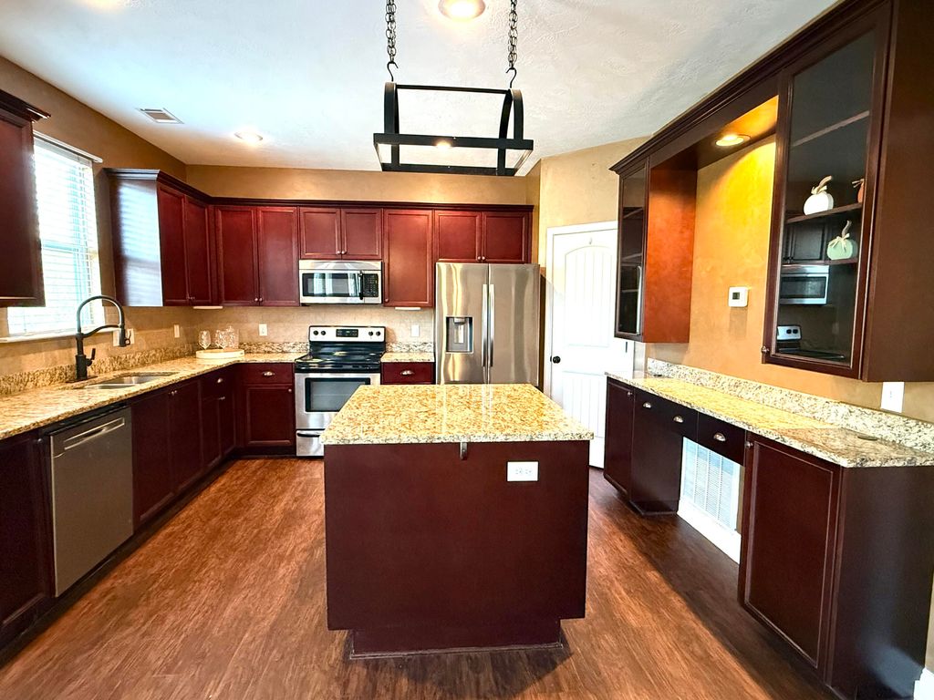 What a great opportunity to own a home in the sought after High Meadows Neighborhood! This home has a great floorplan with ample natural lighting and storage. Large, open concept main living spaces and a large gourmet kitchen are downstairs, and all bedrooms and laundry room are upstairs for added privacy. The roof, both HVAC units, the water heater, dishwasher, and refrigerator were ALL replaced within the last 5 years!!!! Downstairs you will find scratch resistant laminate flooring throughout the main living areas that was replaced during this owners ownership, as well as earth toned color paint updated throughout the home. As you walk into the home, you will find a wide entry foyer for greeting guests, and a dining room with arched entryways, heavy crown molding, textured paint, and wainscoting. The dining room opens into the large living room with an electric fireplace overlooking the backyard. To add a little privacy, there is a half wall from the living room into the breakfast/kitchen area. The breakfast room features a built-in breakfast bar area with wine storage, and glass door solid wood cabinetry, which makes a great serving buffet area for larger gatherings. Connected to the breakfast room is an enormous kitchen with tall, solid wood, stained cabinetry, a large working island, and a built in desk. There is also a walk-in pantry with added shelving for ample food storage, and granite counters. There is also a built in desk with additional storage room in the kitchen. Stainless steel appliances remain! Upstairs, you will find the primary bedroom, which has a vaulted ceiling, private en-suite bathroom with his and her sinks, a garden tub, a walk in shower, large walk-in-closet, and separate lavatory area. You will also find 10' ceilings upstairs, and many of the other bedrooms offer amenities such as vaulted ceilings, a remote ceiling fan, and walk in closets. This home is close proximity to Patriots Park, offers easy access to the Euchee Creek Walking Trails from the neighborhood entrance, and close to the fairgrounds. Less than 10 miles to Ft. Eisenhower Gate 6.