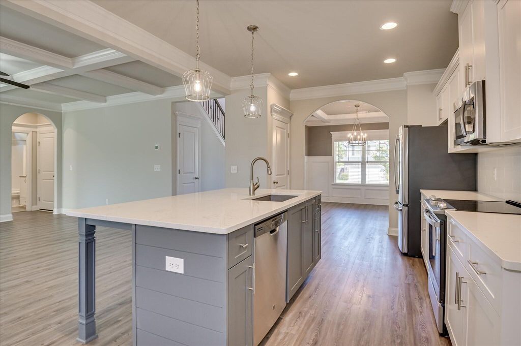 WELCOME HOME to this immaculate four bedroom, Three Full Bath home in beautiful Whispering Pines neighborhood! Open floorplan with an eat in kitchen featuring GE stainless appliances and granite countertops, a formal dining room with coffered ceilings, great room with gas log fireplace, guest bedroom downstairs with a full bath. Upstairs you will find a generous Owner suite with sitting area, ensuite bath with separate tiled shower, soaking tub, dual vanities and a huge walk in closet, two additional bedrooms and another full bath, and a huge room or fifth bedroom with barn doors! Outside, enjoy the screened in porch with a stacked stone wood burning fireplace! Neighborhood amenities include 25 meter resort style pool, playground, miles of walking trails, sidewalks and street lights.