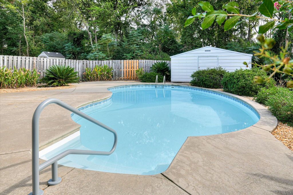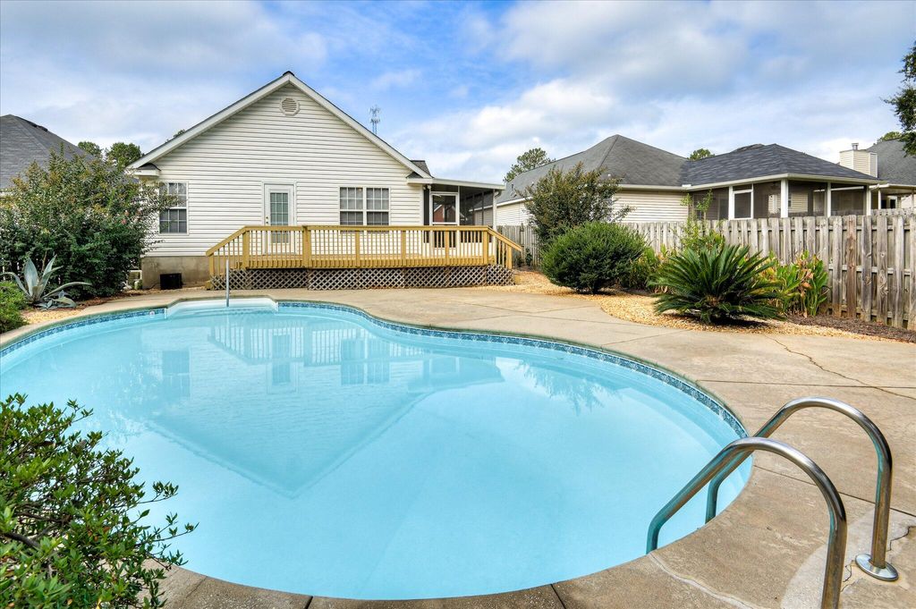 A rare, affordable ranch in Evans, with the a private, in-ground pool! As you enter, you find yourself in a large living room, with gas fireplace. On the left side of the living room is an exit to your screened-in porch, with hot tub. On the right of the living room is the dining room and kitchen, with kitchen island and pantry. As you exit the family room toward the back of the home, you pass a full bath on your left, and bedroom 2 on the left. On the right, you will find the primary bedroom with ensuite bathroom. Both the screened porch and the primary bedroom have direct access to the deck, which overlooks the pool. The backyard is very secluded, with mature trees and plants. There is a large shed which provides great storage for lawn and pool equipment. Inside the two-car garage you will find the pulldown access to the partially floored attic storage.