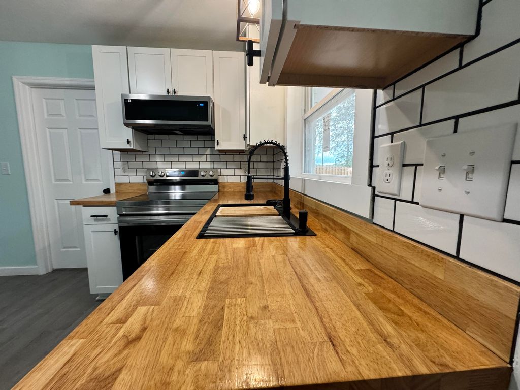 Welcome home! The property features all brand new electrical, AC, and just about everything else NEW NEW NEW, including also beautiful butcherblock countertops and wood sliding barn doors on the closets. The modern kitchen is ready for family meals and gatherings, featuring new finishes, fresh cabinetry, beautiful backsplash, and plenty of room to cook and connect. Each bedroom offers a cozy retreat, and the updated bathroom adds a touch of modern charm with marble shower tile. Outside, enjoy a spacious backyard that's perfect for kids, pets, or weekend barbecues. The wraparound driveway adds convenience and extra parking for family and guests alike. Almost everything in this property has been replaced with quality, schedule your showing soon because this one won't last long!