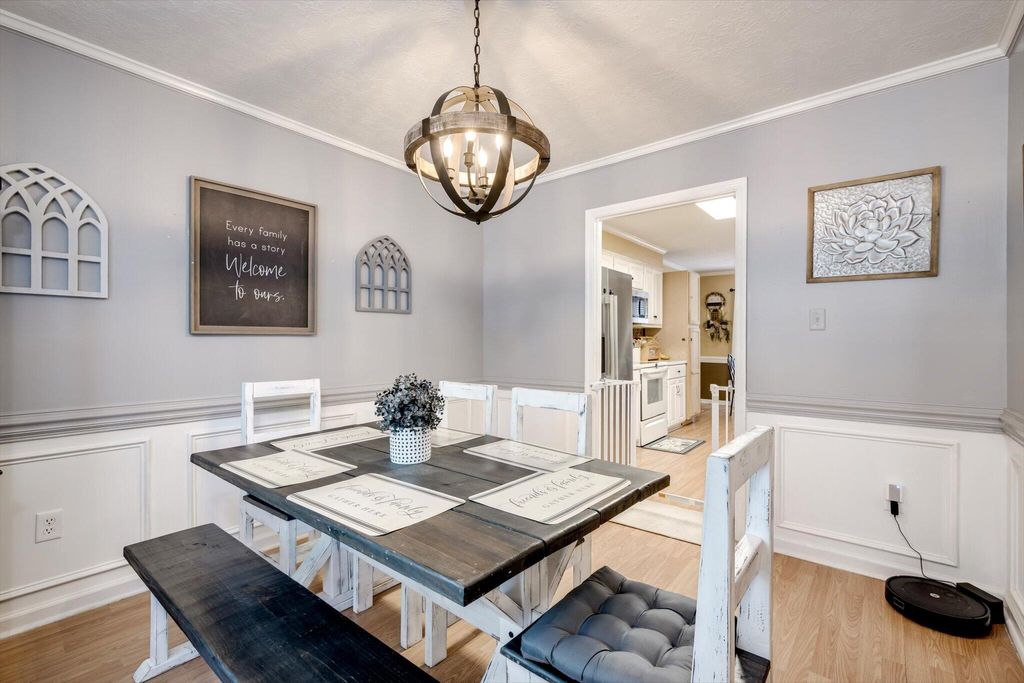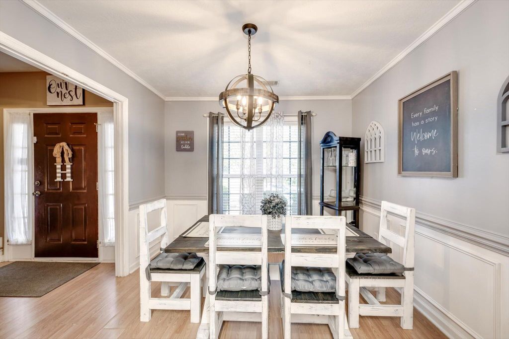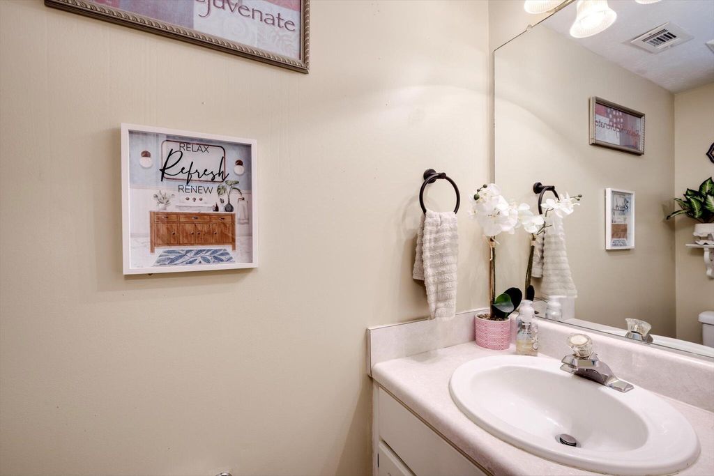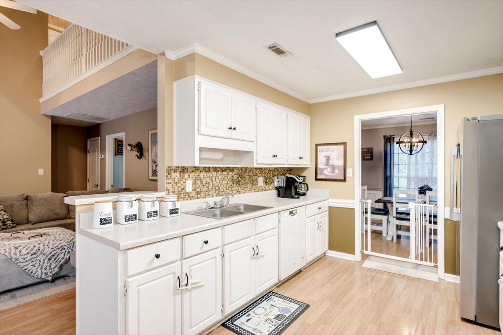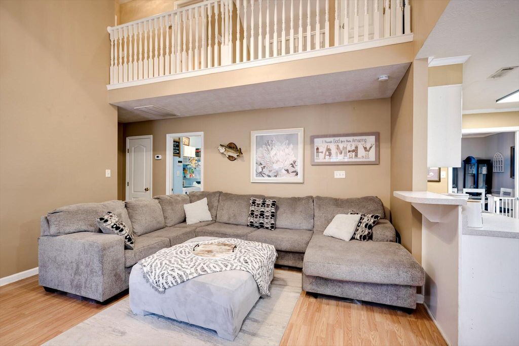 This charming home boasts an inviting open-concept layout, highlighted by a dramatic two-story living room, elegant formal dining area, and a welcoming entry foyer. The spacious primary suite is conveniently located on the main floor and features dual vanities, a soaking tub, and a separate shower for added comfort and luxury. The garage has been thoughtfully converted into a versatile 19x19 space"”ideal as a generous fourth bedroom, media room, flex space, or home office. Upstairs, you'll find two additional bedrooms and a full bath, uniquely separated by a catwalk that overlooks the living area below. Step outside and enjoy serene walks along the picturesque trail that winds around the lake, complete with charming water features and stocked with bass, brim, and catfish. The backyard offers peaceful lake views, creating a relaxing and scenic backdrop for everyday living.