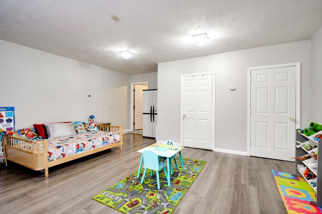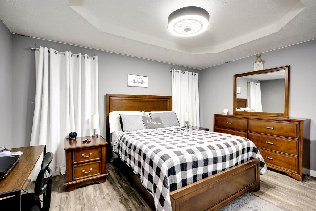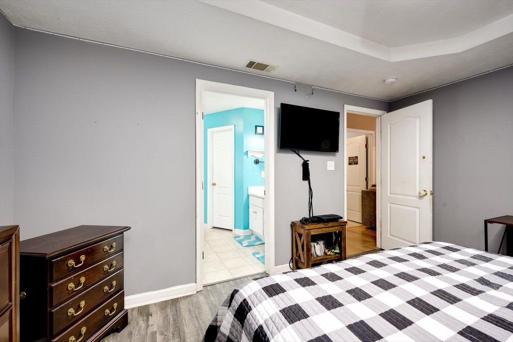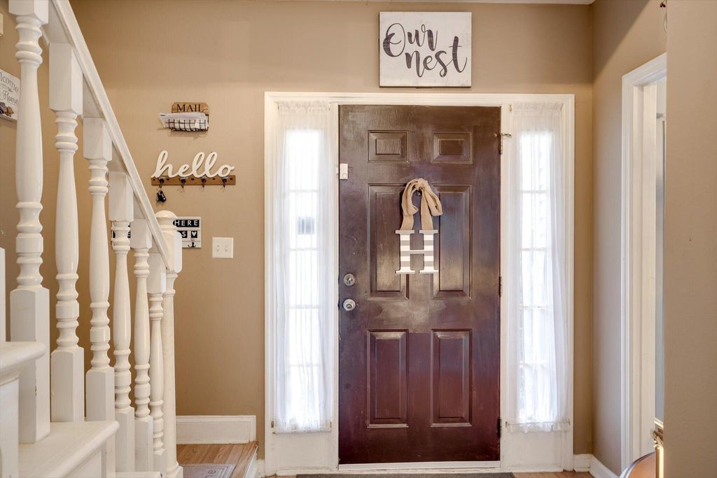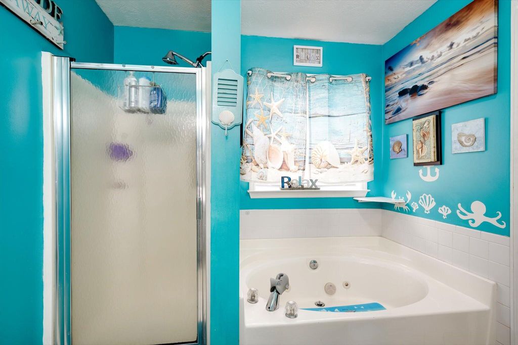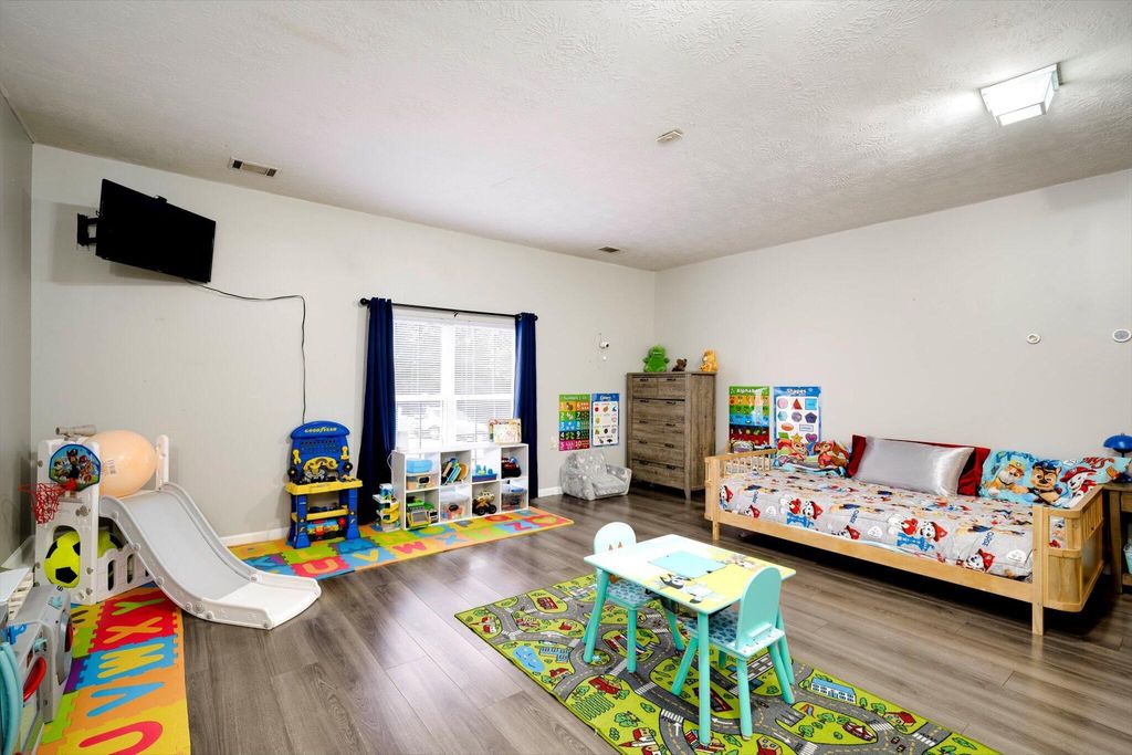 This charming home boasts an inviting open-concept layout, highlighted by a dramatic two-story living room, elegant formal dining area, and a welcoming entry foyer. The spacious primary suite is conveniently located on the main floor and features dual vanities, a soaking tub, and a separate shower for added comfort and luxury. The garage has been thoughtfully converted into a versatile 19x19 space"”ideal as a generous fourth bedroom, media room, flex space, or home office. Upstairs, you'll find two additional bedrooms and a full bath, uniquely separated by a catwalk that overlooks the living area below. Step outside and enjoy serene walks along the picturesque trail that winds around the lake, complete with charming water features and stocked with bass, brim, and catfish. The backyard offers peaceful lake views, creating a relaxing and scenic backdrop for everyday living.