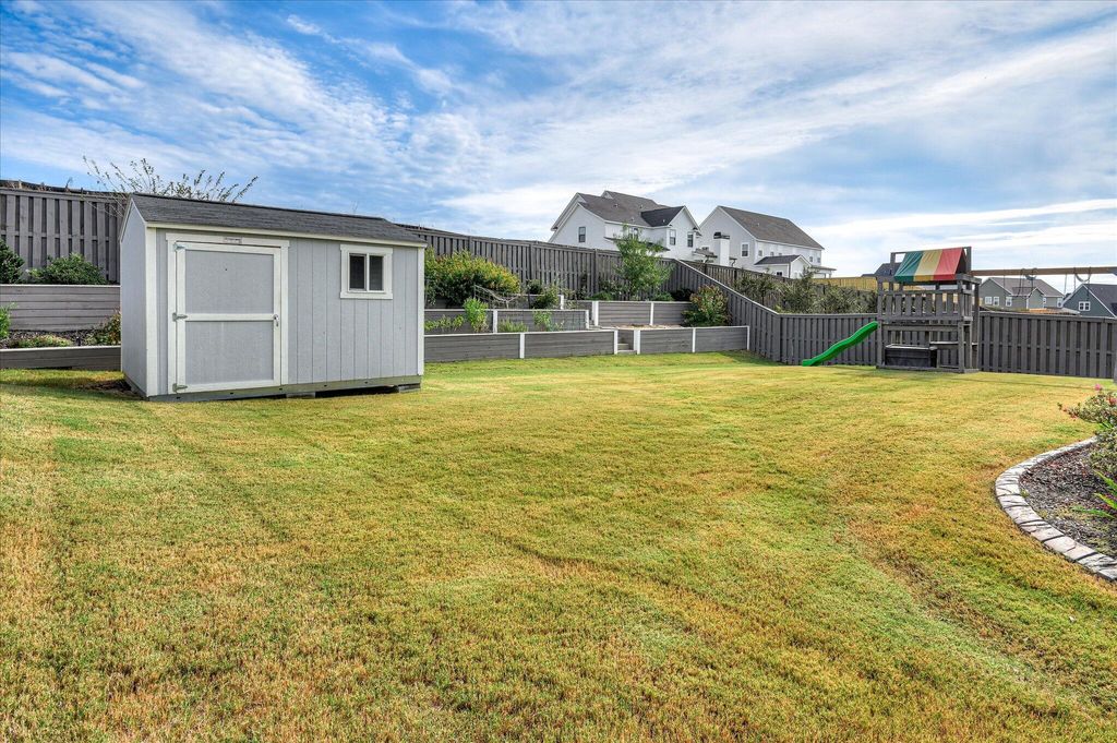 Located in the HIGHLY sought after Highland Lakes Community, this 5 Bed/ 4 full Bath Home boasts 2978 Heated Sq/ ft with every upgrade imaginable. Open-concept, high ceilings. Real hardwood floors, awesome Kitchen. All appliances included: gas range, stainless steel appliances, microwave, dishwasher and Refrigerator. Granite countertops, custom cabinetry, HUGE island. Formal dining, Great room, and a guest bedroom with a full bath all on main level! Owner's suite w/ tray ceiling, walk-in closet connected to the laundry room, tiled shower, and double vanities. 3 Guest Rooms upstairs. Blinds throughout Home, fenced backyard, concrete curbing around all flower beds. Custom garden boxes in backyard with outbuilding to remain! BEAUTIFUL HOME!!