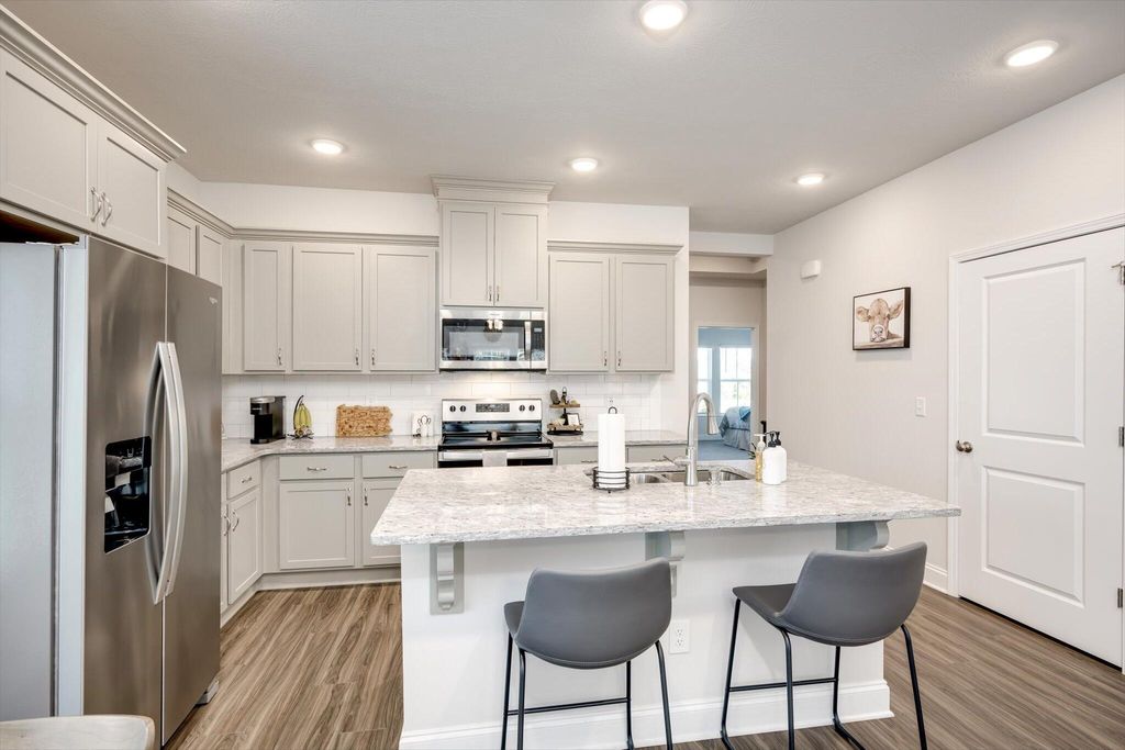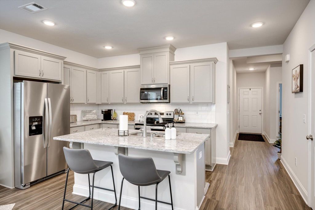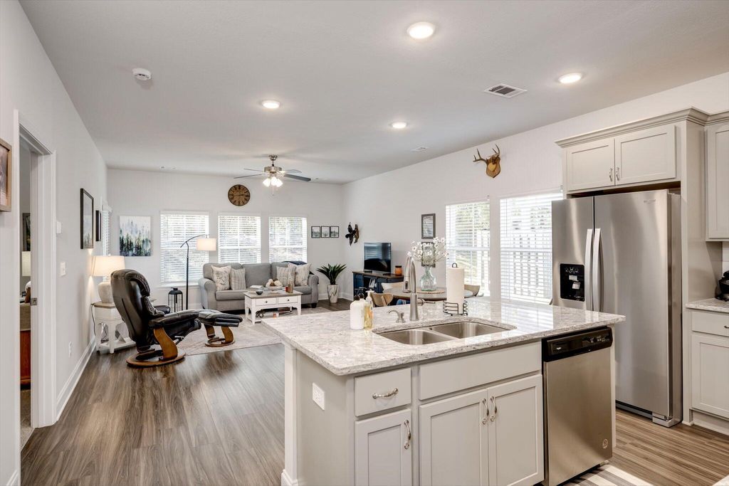 BETTER THAN NEW IN GROVETOWN! Why wait for new construction when you can have it all now, and more? This meticulously maintained, like-new end-unit townhome stands out from the rest with added upgrades, thoughtful details, and peaceful views you won't find in the builder's standard packages. Step inside this bright and airy single-level home, where natural light pours in from extra windows unique to this desirable end unit. The beautifully landscaped exterior and inviting covered front porch create a warm welcome, setting the tone for the comfort and charm that follow. The open-concept floor plan seamlessly connects the kitchen, dining, and living space, perfect for relaxing or entertaining. The chef's kitchen features granite countertops, an island with bar seating and additional storage, and all stainless steel appliances included. Unlike new construction, this home comes fully equipped with over 3k in extra appliances, including a washer, dryer, and refrigerator, as well as blinds throughout. The spacious primary suite offers a private ensuite bath, generous walk-in closet, and serene views of the backyard greenspace. The second bedroom and full bath provide flexibility for guests, family, or a home office. Enjoy your morning coffee or unwind after a long day on the covered back porch, where you can watch deer and wild turkeys wander through the undeveloped natural greenspace just beyond your fence, one of only a few homes in the neighborhood with this peaceful setting. Additional perks include energy efficiency verified by third-party HERS testing, low-maintenance living, and overflow parking directly across the street with four extra spaces. The neighborhood offers wonderful amenities such as a pool, playground, and sidewalks throughout, all in an ideal location near Fort Gordon, I-20, shopping, dining, and top-rated Columbia County schools. With everything move-in ready and thoughtfully upgraded, this home truly is better than new! A rare find combining convenience, quality, and tranquility in one perfect package.