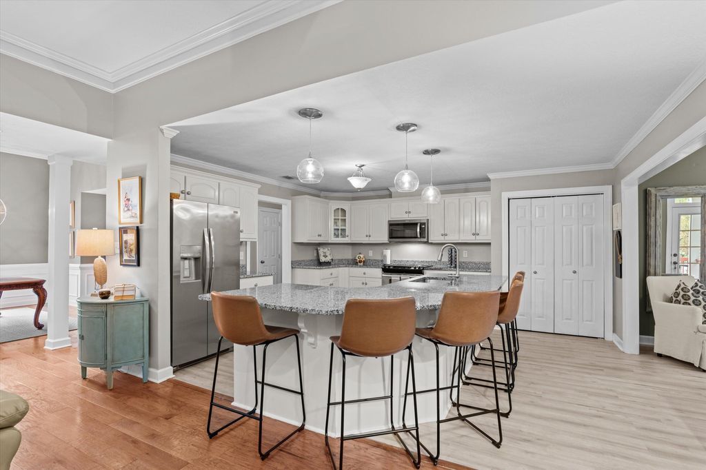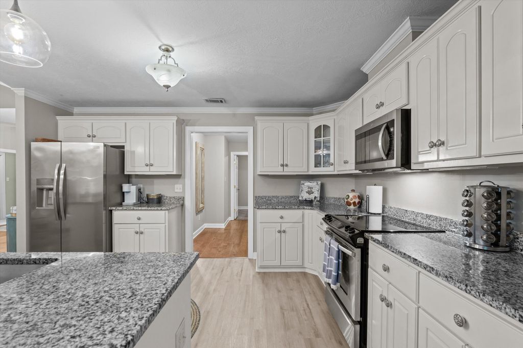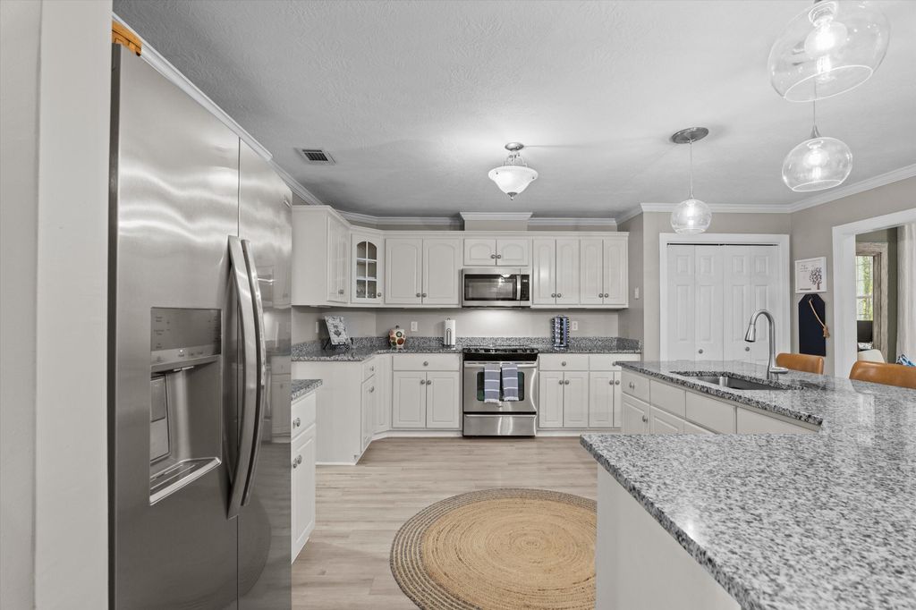 Have you ever walked into a house that is so warm, welcoming, & well-maintained that you feel right at home? You'll find that here! This beautiful open floor plan has such great flow and allows for comfortable, easy living. The large kitchen is the heart of the home & favorite gathering space with room for six at the island. The light-filled sunroom makes for a great office, sitting room, or breakfast area. The split floor plan allows for an extra-private owner's suite & huge bathroom! Every bedroom fits a king sized bed! This lot borders wooded HOA property to the left & rear that cannot be developed, providing extra privacy without the responsibility of maintaining it. The back yard feels so quiet & secluded -- your own piece of paradise, complete with a running creek! The covered porch & freshly painted deck allow for great views of the peaceful setting. New roof 2021, new gutters, new fridge, & new carpet in the bedrooms! HVAC new in 2023 with a 10 yr warranty! Floored attic spans the entire length & width of garage. Not part of an HOA which is rare for this area. A great find!
