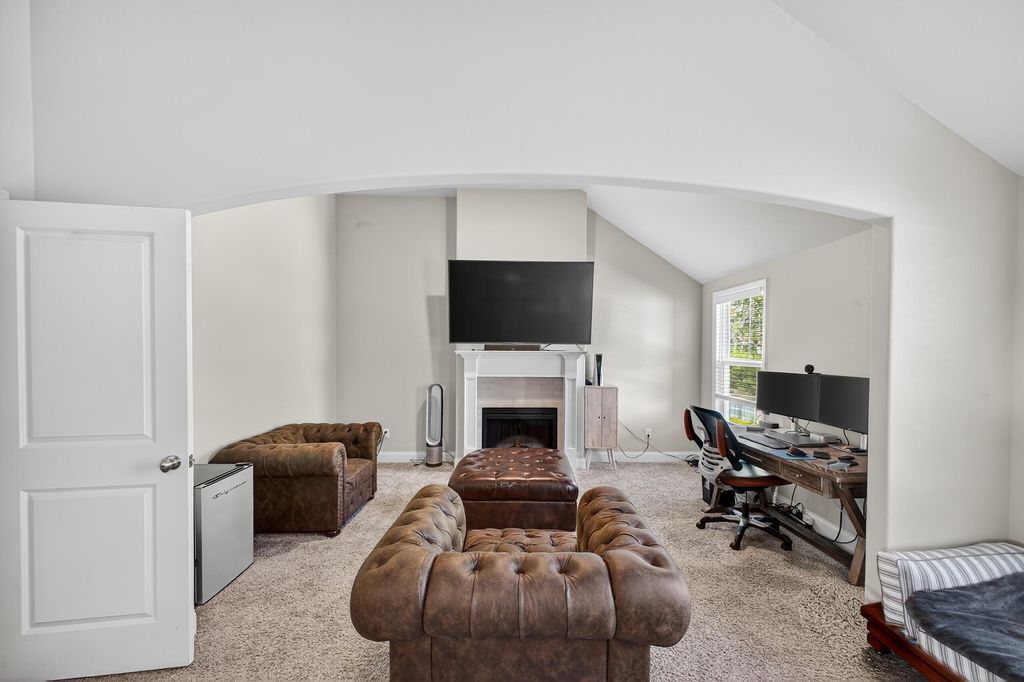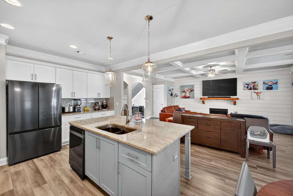 Step into a home designed to elevate everyday living. This 4-bedroom, 3-bath beauty delivers an open floor plan that seamlessly connects the main living spaces, all enhanced by durable LVP flooring. The kitchen is both stylish and functional with granite countertops, a tiled backsplash, and all appliances remaining for added value. The great room features a stunning shiplap accent wall surrounding the fireplace, setting the tone for warm gatherings. The oversized primary suite offers a true retreat with a generous sitting area and direct access to a huge walk-in closet located just off the spa-like bathroom. Enjoy dual vanities, a large tiled shower, and a relaxing garden tub. Secondary bedrooms are impressively spacious, offering plenty of flexibility. Outside, the fenced backyard becomes an extension of your living space with a covered patio and cozy outdoor fireplace that's perfect for year-round enjoyment. With a charming hardie board exterior and a large front porch, this home is ready to welcome you in.