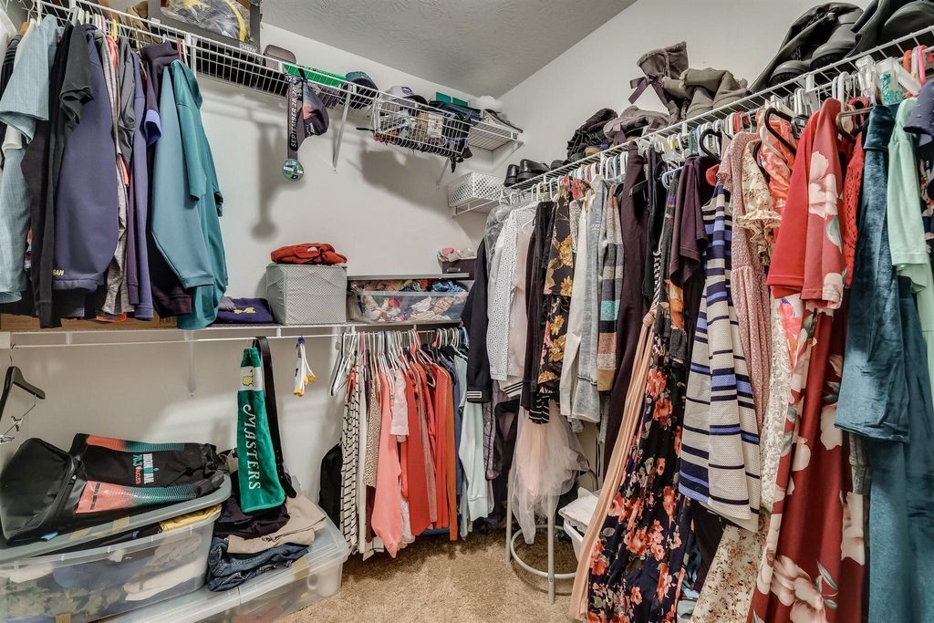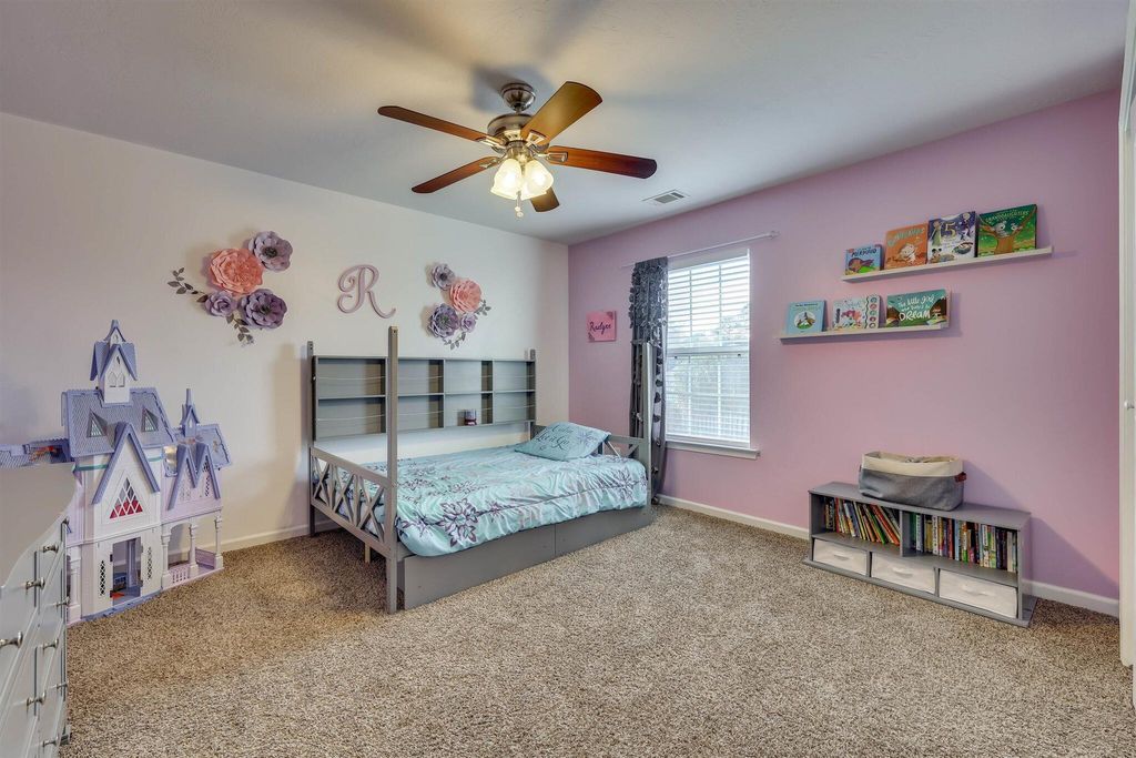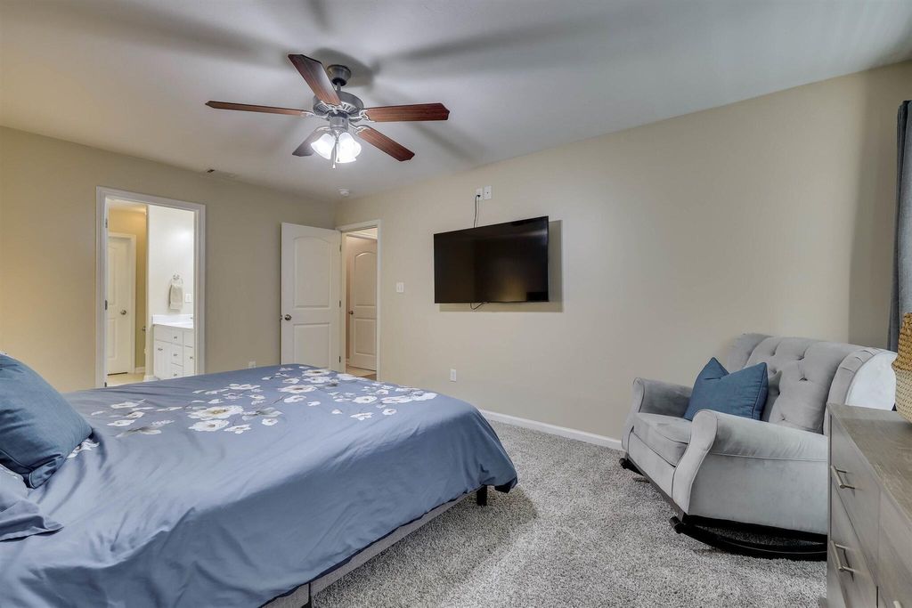 VA LOAN ASSUMPTION AVAILABLE. NEW ARCHITECTURAL ROOF IN JANUARY 2024. NEW LVP HARDWOOD FLOORS AND FRESH PAINT IN GREAT ROOM, KITCHEN AND DINING. Spacious two-story great room. Eat-in kitchen with plenty of counter/cabinet space, tile backsplash, pantry, white cabinets and all appliances including refrigerator. Owner suite on main with NEW CARPET features private bath with soaking tub, separate shower, double sinks, tile floors and large walk-in closet. Half bath and laundry room with tile also on main level. Three guest bedrooms, all of which are a good size and full bath upstairs. Walk in attic offers plenty of storage! Two car garage with separate outside entrance. Rocking chair front porch. Privacy fenced yard with patio. This home is located in a popular pool community and only minutes to top rated schools!