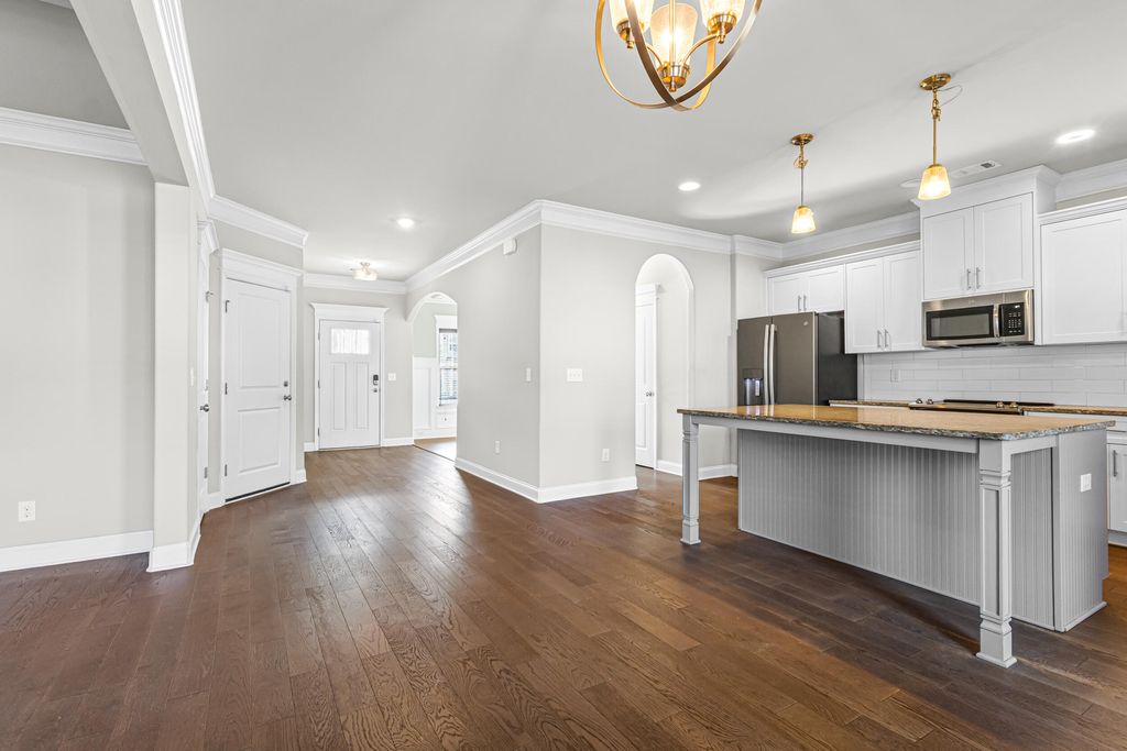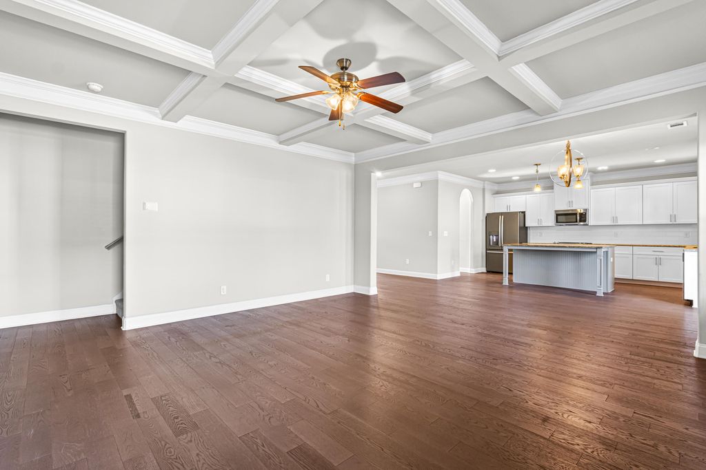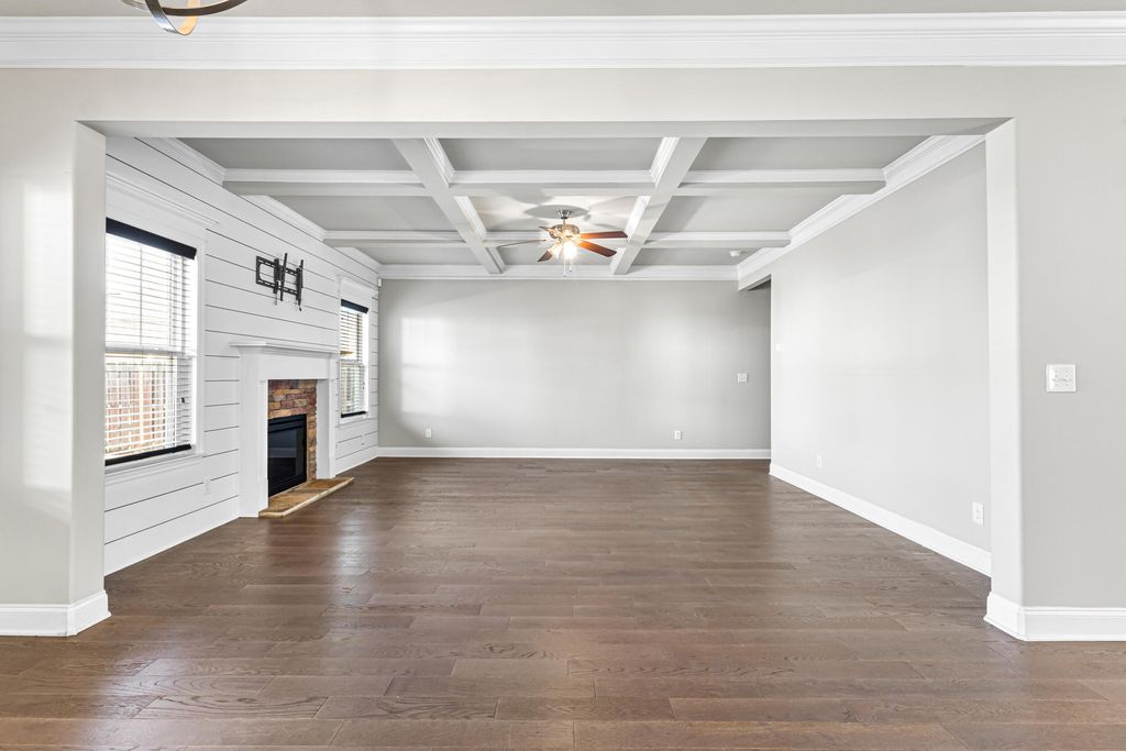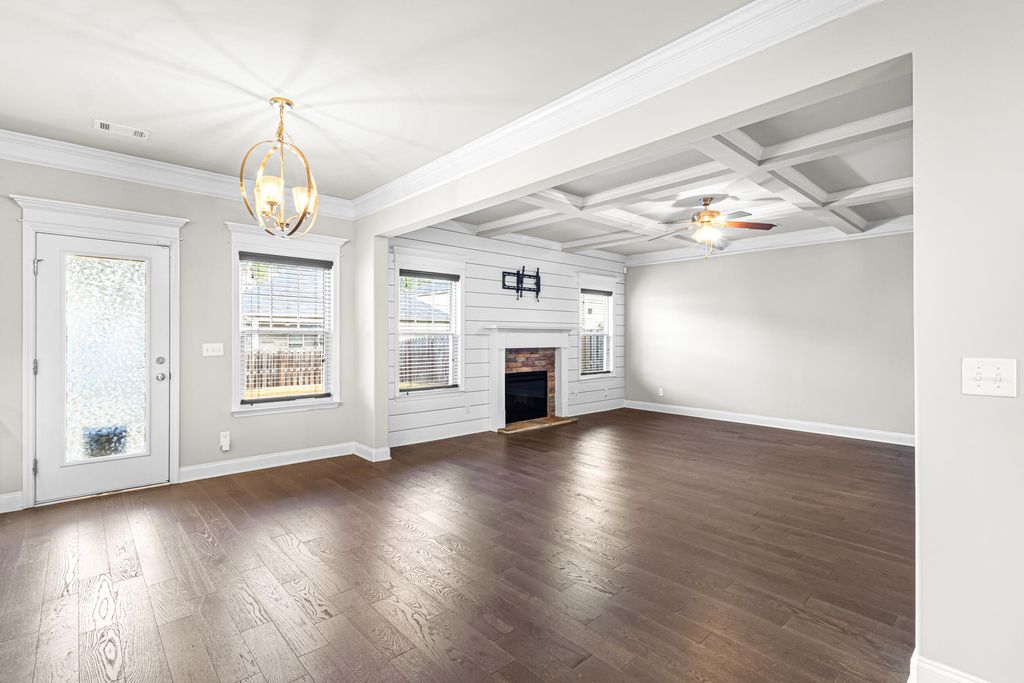 Excellent, move-in ready home in sought after Canterbury Farms! This 4 Bedrooms, 2.5 Bath home has what you have been looking for this Holiday Season! This home offer beautiful engineered flooring throughout the downstairs/living areas. The open kitchen boasts stainless steel appliances, granite countertops, huge island, double door pantry, and eat-in kitchen area. Large living room with coffered ceiling, stacked stone fireplace and shiplap wall. The spacious owner's suite offers a walk-in-closet, plus private bath with a soaking tub and separate shower. Other features include: blinds throughout, formal dining room also with coffered ceiling, covered back patio, privacy fenced back yard and 2 car garage.