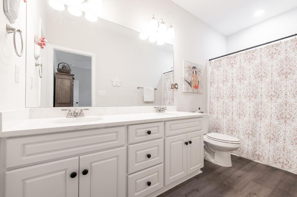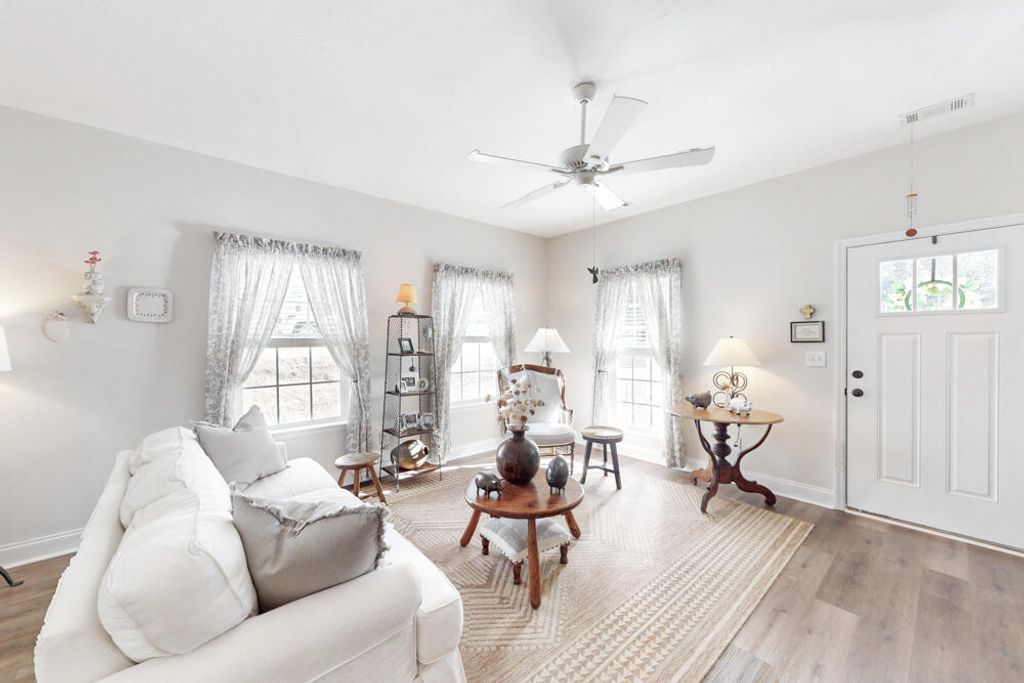 You'll fall in love and feel right at home in this lovely, like-new, all one level 3 bedroom, 2 bathroom home that has a welcoming front porch that invites you to sit back and unwind! As you enter you are greeted by light neutral colored walls, high ceilings, attractive LVP flooring throughout! The thoughtfully designed layout maximizes space and functionality, all in excellent condition! The beautiful kitchen features quartz countertops, bar seating, a gas range, dishwasher, and refrigerator, and flows seamlessly into the dining room accented by an updated light fixture! The owner's suite offers a ceiling fan, a stylish barn door leading to the bathroom with a double-sink quartz vanity, and a spacious walk-in closet! Two additional guest bedrooms include ceiling fans and share a nearby full bathroom with a quartz-top vanity! A dedicated laundry room includes added cabinetry and shelving for extra storage! Enjoy outdoor living on the screened porch overlooking the large, privacy fenced backyard! An attached garage completes this inviting home! This home is a true gem, designed for comfort and everyday living! Hurry before it's gone!