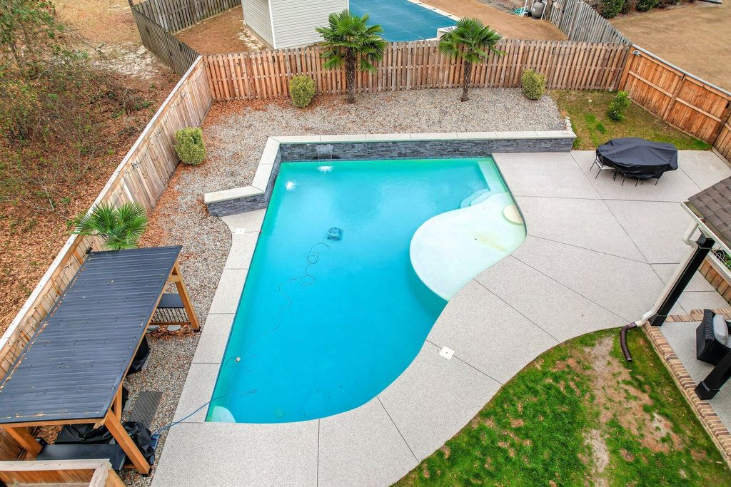 This beautifully designed farmhouse with modern touches is tucked away on a quiet street in North Augusta's desirable Lakes & Streams subdivision. The inviting exterior with black shutters, brick foundation, covered front porch, and rooftop solar panels delivers curb appeal that's both stylish and functional. Inside, the home features detailed millwork, rich hardwood floors, recessed lighting, and many newly installed light fixtures and ceiling fans, creating a fresh and inviting atmosphere. A versatile formal dining room also functions well as a home office. The hallway opens into a bright, open-concept living space with soaring two-story ceilings, a cozy brick fireplace, and an eat-in kitchen showcasing hammered granite countertops, a bar-seating island, stainless steel appliances, a breakfast area, and a pantry. All kitchen appliances will remain. The main level includes a laundry room, a full bath, and a spacious owner's suite with a light-filled tiled bathroom offering double vanities, a large walk-in shower, a jetted tub, and an oversized walk-in closet. Upstairs, you'll find three additional bedrooms and a full bath. Recent improvements add both value and peace of mind, including new gutters, a new garbage disposal, a pumped septic tank, new carpet in the primary bedroom, and a seamless shower in the primary bath. Additional upgrades include updated door hardware throughout, a fully encapsulated crawlspace with dehumidifier, a recently serviced HVAC system, a Ring doorbell that will convey, and a Lorex camera system with full-color night vision that will remain. Outdoor living is just as impressive! Relax under the covered back porch overlooking a custom saltwater, gunite pool featuring a stone waterfall, additional water features, a baja shelf, professional grade ledge chairs with table that will convey (set was 5000 dollars)and a grilling gazebo was recently added near the pool. Also, the patio/pool area was upgraded with new coping (12,000 dollar upgrade). Automatic vacuum for pool will also remain. The fully fenced, beautifully landscaped backyard includes established garden beds that will remain, offering both charm and functionality for outdoor enjoyment. There are also many fruit trees and blueberry bushes planted throughout the property. The garage is exceptionally well equipped with a polyurea floor/kneewall coating, soft close custom cabinets/drawers, hammer top work tops, commercial grade slat wall (ceiling to floor), slat board over lighted work bench, insulated garage door and an outlet for 240v heater/welder (professionally installed/designed at a cost of 23,000 dollars). Beyond the home, Lakes & Streams offers an active, community-oriented lifestyle with regular food trucks, festive golf cart parades, scenic walking trails, and neighborhood ponds perfect for fishing"”making this a place where neighbors truly connect. Qualifies for 100% USDA Financing! *Buyer/buyer's agent to verify all information if important.