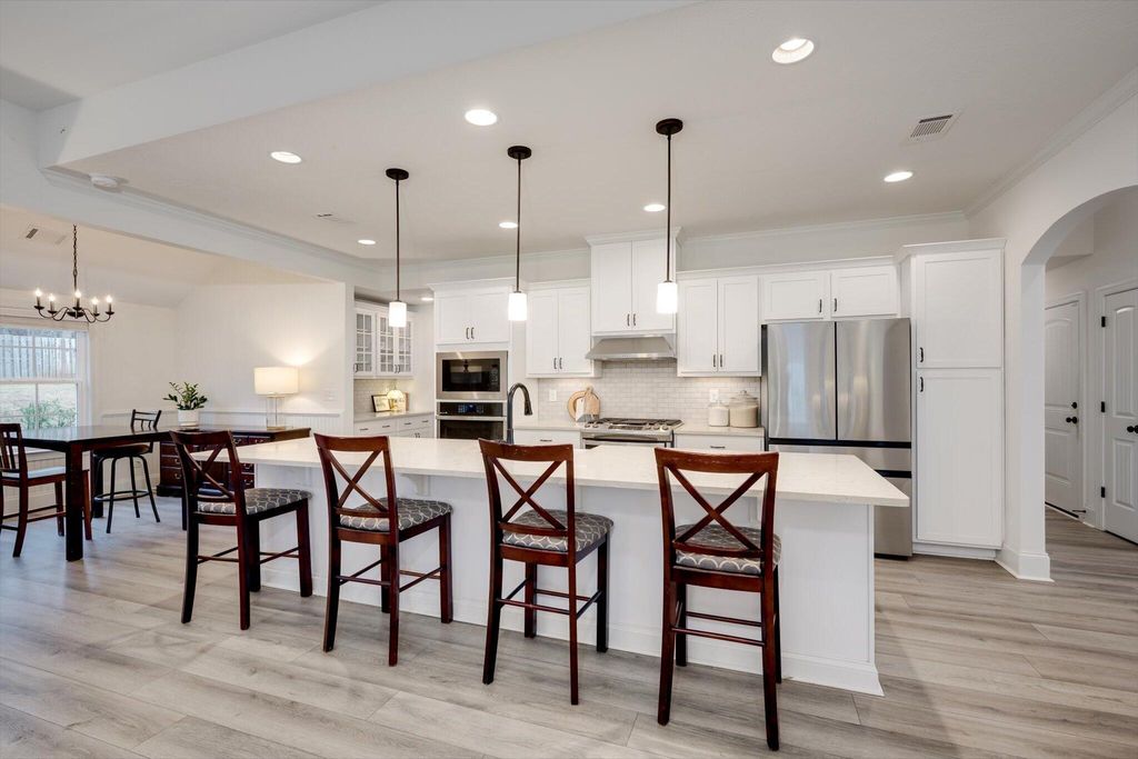 Welcome to the KINGSTON 6 ranch with a bonus room upstairs, offering exceptional design, upgrades, and functionality throughout. This home features luxury vinyl plank flooring throughout with wood stair treads, abundant closet space, and thoughtful enhancements at every turn. The private owner's suite is a true retreat, featuring a separate 11x11 sitting area with an electric fireplace, additional recessed lighting, extra windows for abundant natural light, and a spacious walk-in closet. The spa-inspired primary bath includes quartz countertops, double vanities, a tiled walk-in shower, separate soaking tub, and extra outlets conveniently placed between mirrors for dental, hair, and beauty devices. A split floor plan offers two additional bedrooms on the main level, along with a full bath featuring a granite countertop and fiberglass walk-in shower with semi-frameless doors, plus a stylish half bath with granite countertop. Upstairs, a fourth bedroom or flex room includes additional windows, extra recessed lighting, and a full bath with granite countertop and fiberglass walk-in shower, making it ideal for guests, a home office, or bonus space. The kitchen opens seamlessly to the great room and is truly a cook and baker's dream. It features quartz countertops, a farmhouse apron-front sink, coffee bar area, large island, breakfast area, and a full stainless-steel appliance package including a gas range with convection oven, stand-alone convection oven (two total), built-in microwave, dishwasher, professional-style vent hood, and garbage disposal. The living room is enhanced with additional recessed lighting, a floor outlet for flexible furniture placement, and French doors leading to a screened porch. All appliances convey, including a Samsung Bespoke refrigerator and Samsung Smart Dial FlexWash washer and dryer. Additional highlights include a formal dining room, generous storage throughout, extra lighting in the garage, and a fully fenced backyard. The exterior is finished with modern black gutters for a clean, contemporary look. Smart and energy-conscious features include an Interlogix Smart Home/Security System, programmable Z-Wave thermostats, and a 10-year StrucSure Home Warranty for added peace of mind. Conveniently located just minutes from I-20, shopping, dining, and the North Augusta Greenway, with a neighborhood playground nearby, this home offers the perfect balance of comfort, convenience, and style. Home qualifies for VA, FHA and conventional financing.