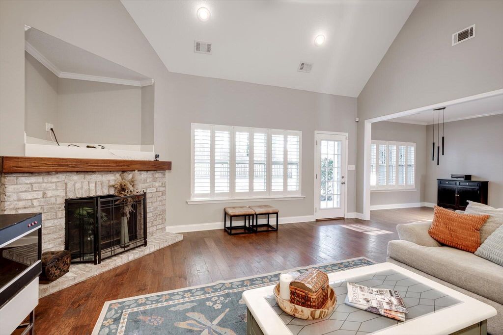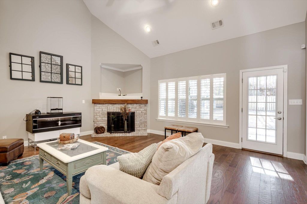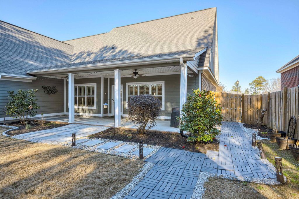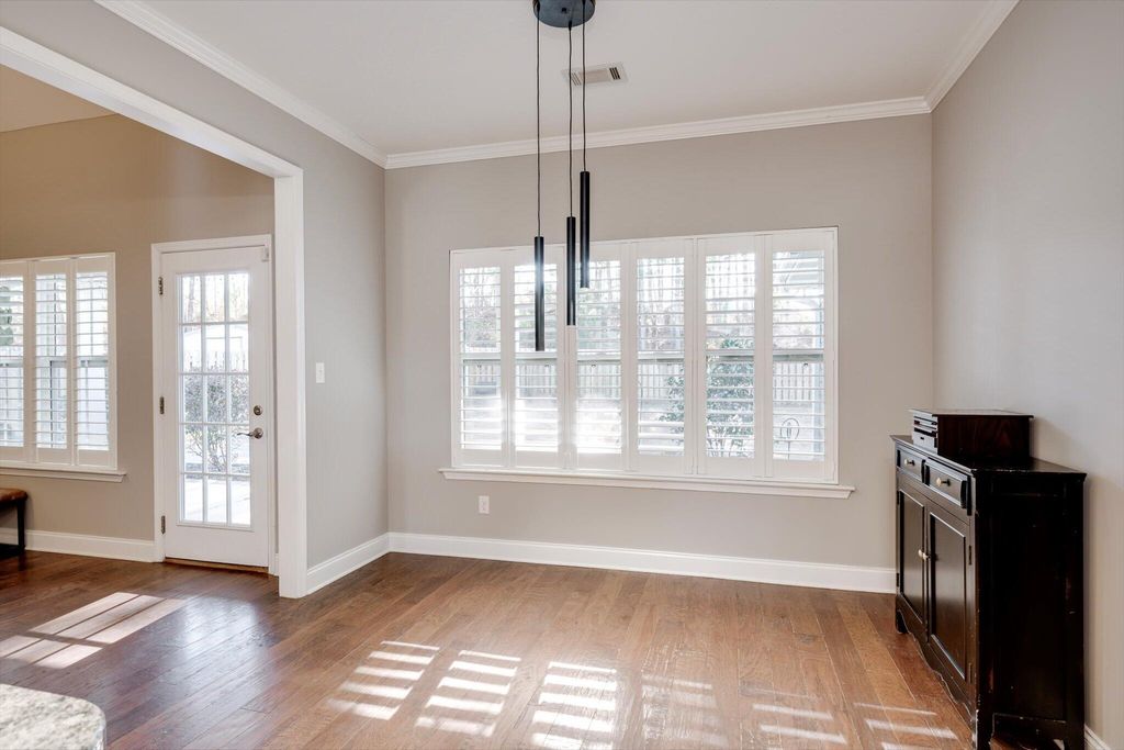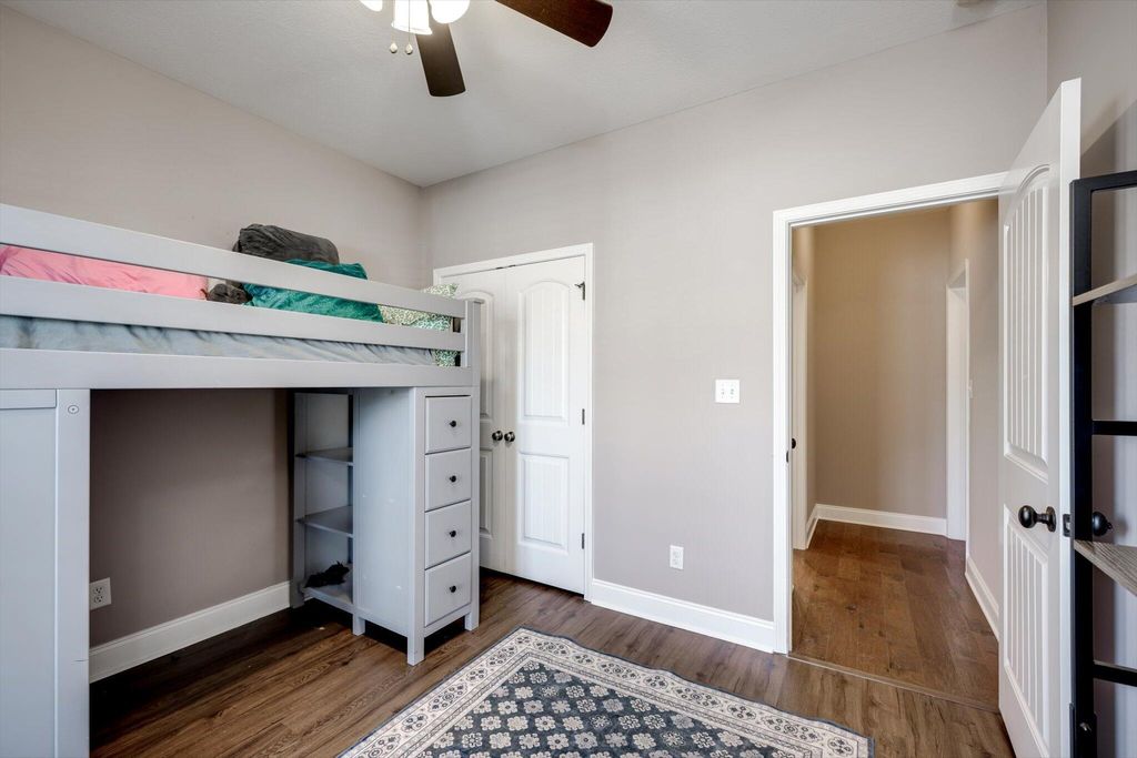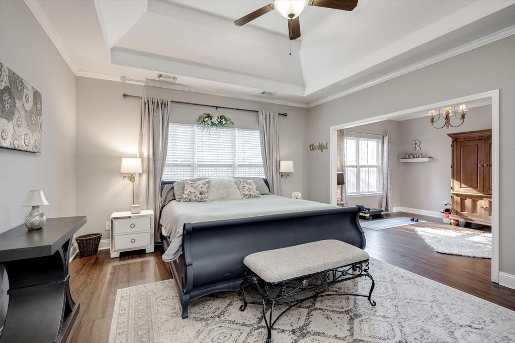 Welcome home to this beautifully maintained 4-bedroom home! The rocking chair front porch home in Somerset offers an oversized upstairs game room/bonus room that could be used as a 5th bedroom (includes closets). As you enter, you're greeted with a 2-Story foyer, also providing an overlook into the Great room with brick Fireplace, perfect to cozy up to on these cold days. Gorgeous hardwood floors in common areas and Plantation Shutters adorn the lower level. The kitchen shines with designer lighting throughout, custom tile work and exquisite granite. Stainless steel double floor oven, microwave, dishwasher and refrigerator all to remain. You'll enjoy the convenience of the lower pullout drawers making it easy to grab those pots and pans. In addition to the downstairs spaces, the spacious Primary Suite is on the main floor with an attached sitting room. You'll find the Ensuite bath to be one of luxury! You'll easily spot the stunning tile work throughout and the details on the custom cabinetry and crown work in bathroom. The walk-in closet is one to write home about! A detail worthy of note is the dreamy wood-look full custom shelving through the entire owner suite closet. Also on the main level is a second bedroom that can be found on the opposite side of home. A great location for added privacy. Upstairs you will find two additional bedrooms and full bath. The purpose-built closet systems in this home will not disappoint! Not only in bedrooms, but laundry room and the walk-in pantry include adjustable storage! An organizers dream. Let's not forget the easy-to-maintain Luxury Vinyl plank flooring in all bedrooms! Oversized two-car garage with substantial shelving and storage along with a newly installed 240V 14-50R socket for EV charging. Outside has a nice long covered back porch with ADA-friendly features, flat lot with privacy fence backing to a tree-lined common area and a personalized walk space leading you to the adorable Playhouse ready for its next story. This is one you don't want to miss.