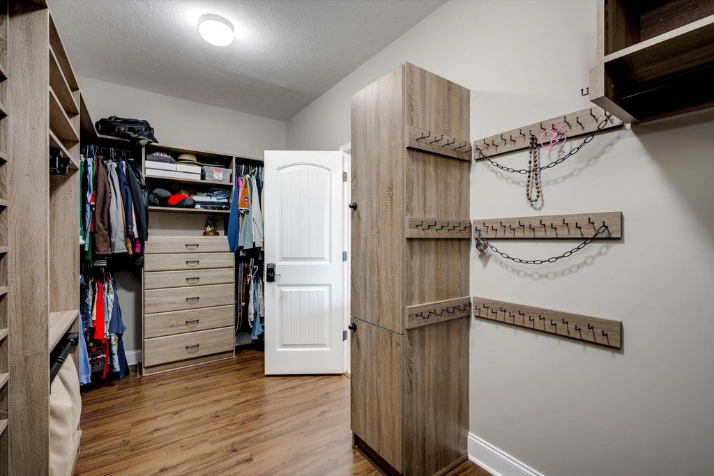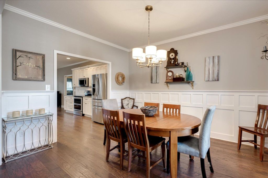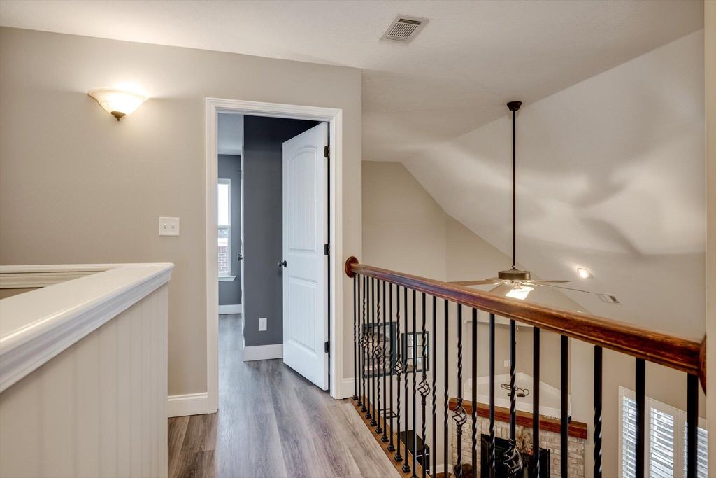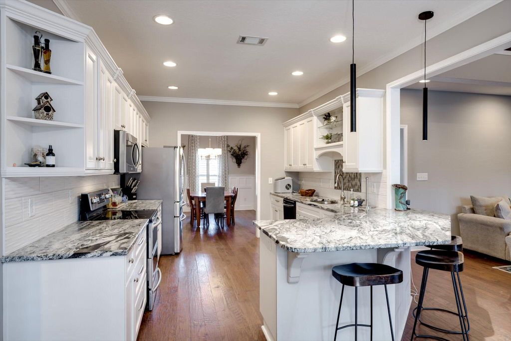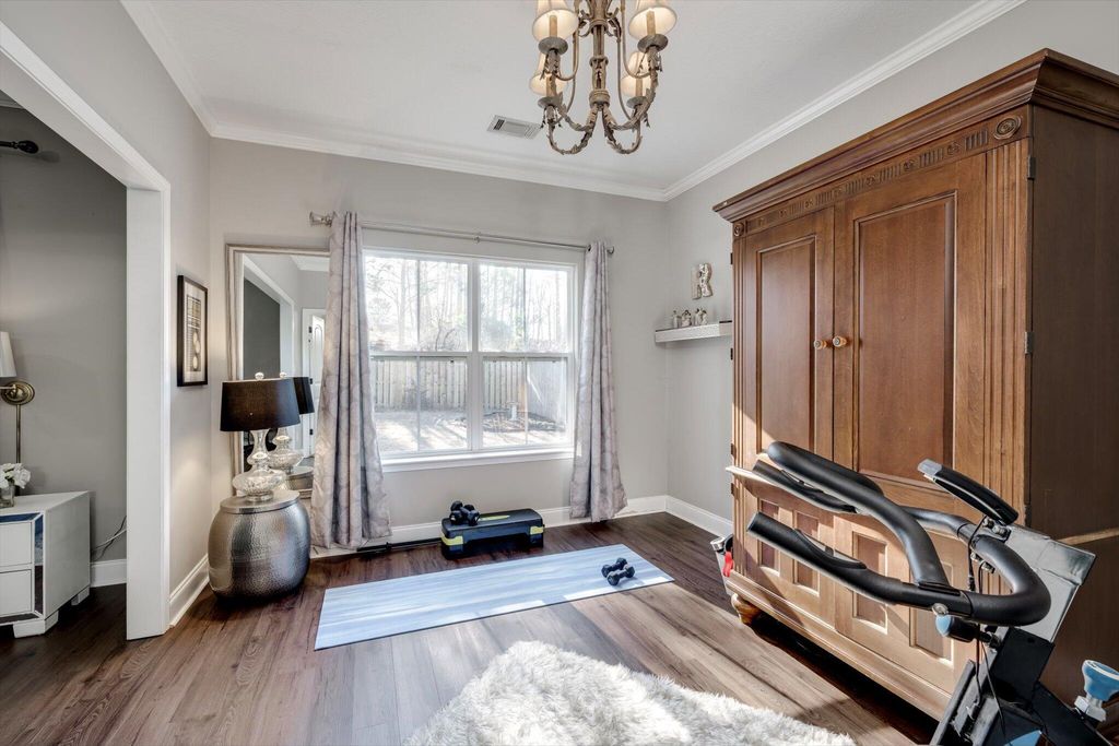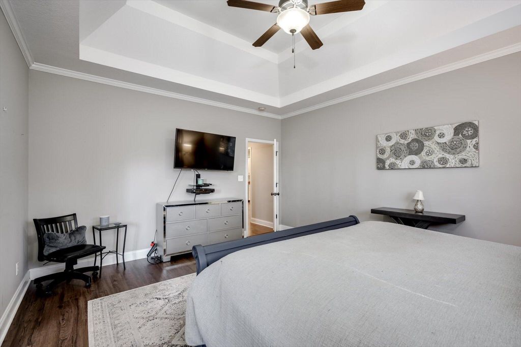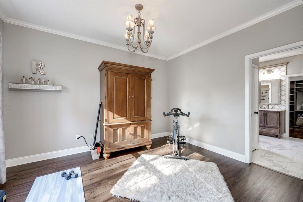 Welcome home to this beautifully maintained 4-bedroom home! The rocking chair front porch home in Somerset offers an oversized upstairs game room/bonus room that could be used as a 5th bedroom (includes closets). As you enter, you're greeted with a 2-Story foyer, also providing an overlook into the Great room with brick Fireplace, perfect to cozy up to on these cold days. Gorgeous hardwood floors in common areas and Plantation Shutters adorn the lower level. The kitchen shines with designer lighting throughout, custom tile work and exquisite granite. Stainless steel double floor oven, microwave, dishwasher and refrigerator all to remain. You'll enjoy the convenience of the lower pullout drawers making it easy to grab those pots and pans. In addition to the downstairs spaces, the spacious Primary Suite is on the main floor with an attached sitting room. You'll find the Ensuite bath to be one of luxury! You'll easily spot the stunning tile work throughout and the details on the custom cabinetry and crown work in bathroom. The walk-in closet is one to write home about! A detail worthy of note is the dreamy wood-look full custom shelving through the entire owner suite closet. Also on the main level is a second bedroom that can be found on the opposite side of home. A great location for added privacy. Upstairs you will find two additional bedrooms and full bath. The purpose-built closet systems in this home will not disappoint! Not only in bedrooms, but laundry room and the walk-in pantry include adjustable storage! An organizers dream. Let's not forget the easy-to-maintain Luxury Vinyl plank flooring in all bedrooms! Oversized two-car garage with substantial shelving and storage along with a newly installed 240V 14-50R socket for EV charging. Outside has a nice long covered back porch with ADA-friendly features, flat lot with privacy fence backing to a tree-lined common area and a personalized walk space leading you to the adorable Playhouse ready for its next story. This is one you don't want to miss.