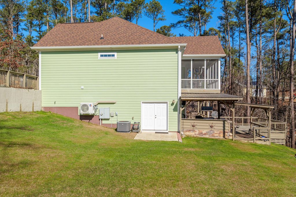 STUNNING LAKE FRONT HOME with PRIVATE DOCK and BOAT PARKING Nestled on a one-acre lot in a hidden cove, this 3,500-square-foot lakefront home offers unparalleled tranquility and breathtaking views of the Savannah River at the mouth of Carolina's Little River. The main level features a spacious open floor plan with engineered hardwood floors, a great room with vaulted ceilings, a cozy fireplace, and expansive windows framing the stunning lake views. The gourmet kitchen is a chef's dream, featuring granite countertops, stainless steel appliances, double ovens, and shaker-style cabinets. It seamlessly connects to a breakfast nook and a dining area, leading out to a large screened porch and a vaulted ceiling rear deck. The owner's suite includes private deck access, a luxurious en-suite bath with double vanities, a large glass shower, a soaking tub, and a walk-in closet filled with natural light. The main level also includes two additional bedrooms and a full bath, along with a convenient laundry room adjacent to the kitchen and pantry. Descend to the lower level, designed for entertainment and extended living. This level features a billiard room, a massive entertainment room with a 98-inch TV, theater seating, and a large wet bar. The fully furnished lower-level kitchen is complete with a stove/range combination, microwave, stainless steel sink, dishwasher, and ample cabinet space, Corian countertops and a massive walk-in pantry with double refrigerators and bakers shelving. A large 4th bedroom and a private office that can serve as a fifth bedroom as well as a full bath with large walk-in shower. Just mere steps away from the home, you'll find a private dock complete with a boat slip, offering easy access to the water for boating and leisurely activities. Step outside to a 500-square-foot covered patio with ceiling fans and a flat-screen TV, leading to a 240-square-foot covered outdoor kitchen and bar area, perfect for al fresco dining. Adjacent to the patio is a 340-square-foot deck, ideal for soaking up the sun or stargazing at night. This exceptional home combines luxury, comfort, and natural beauty, offering the perfect blend of family living and entertainment.