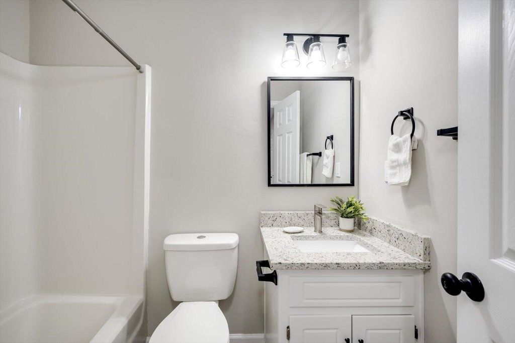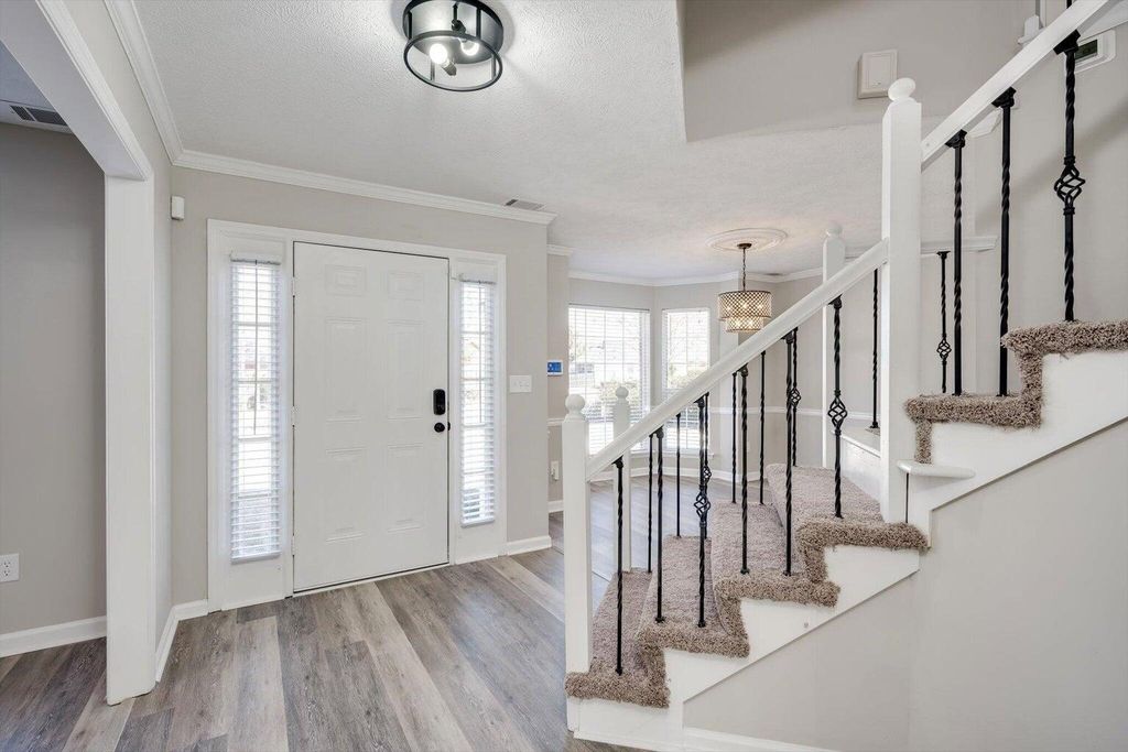 Extensively renovated and truly move-in ready, this home has been completely refreshed from top to bottom. Major improvements include a new roof, all new interior flooring, new stainless appliances, granite counters in kitchen and bathrooms, new front and rear exterior doors, updated staircase with cast iron look balusters and new handrails, new light fixtures and plumbing fixtures, and a full interior and exterior repaint. Outside, you'll appreciate the new sod, refreshed landscaping with newly planted gardenias, upgraded sprinkler system with new controller, and removal of numerous trees to open up the yard and enhance light and usability. Inside, durable LVP flooring spans the main level, offering both style and easy maintenance. The foyer welcomes you with views through to the spacious back yard. To the left, the formal dining room features a bay window, new chandelier, chair rail, and crown molding. To the right, a versatile sitting room with a wide cased opening and two windows makes an ideal office, study, or flex space. Straight ahead, the great room offers a comfortable gathering space with a wood-burning fireplace and tiled hearth, base and crown molding, and a new ceiling fan. Three rear-facing windows provide abundant natural light and views of the backyard, with access to a small concrete patio through the new rear door. A generous coat closet is tucked beneath the stairs. The kitchen opens seamlessly to the family and breakfast areas, creating a functional flow for daily living and entertaining. Cabinets have been refreshed with white paint and oil-rubbed bronze hardware and are complemented by granite countertops and new stainless appliances, including an electric range, micro-hood, and dishwasher. The breakfast room features a bay window overlooking the backyard. A pantry closet and laundry closet are conveniently located nearby. A hallway off the kitchen leads to the updated powder room, a linen closet, and entry to the attached two-car garage with opener. Upstairs, all bedrooms are privately situated. The stairwell has been reworked with updated handrails and cast iron look balusters for a modern touch. The spacious primary suite features a tray ceiling, new ceiling fan, three windows, and a large walk-in closet with built-in shelving. The en-suite bath includes a dual-sink vanity with granite countertops, updated lighting and fixtures, a soaking tub with tile surround and window above, separate shower insert, and a private water closet tucked behind a knee wall. Three additional bedrooms provide flexibility for guests, family, nursery, or office space. The first guest cosy guest bedroom is nearest to the primary and is ideal as a nursery or study, and the others are nicely sized--one featuring a bay window that mirrors the dining room below. The hall bath offers a granite-topped vanity, updated lighting and mirror, fiberglass tub/shower surround, and updated toilet. With extensive upgrades, modern finishes, and thoughtful improvements inside and out, this home combines updated style with everyday functionality and long-term peace of mind.